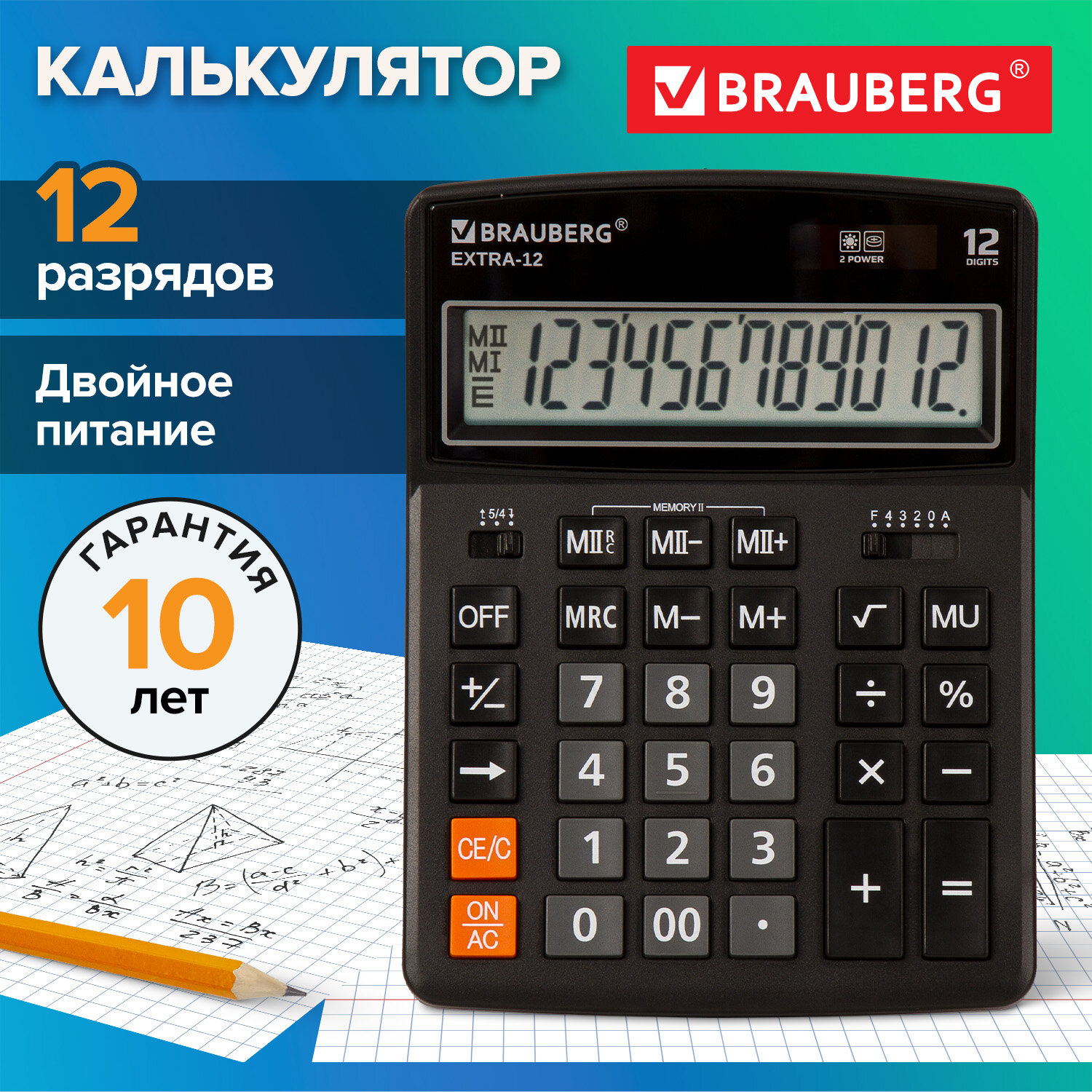 Калькулятор настольный BRAUBERG EXTRA-12-BK (206x155 мм), 12 разрядов, двойное питание, ЧЕРНЫЙ Код товара: 250481 1 021,85 ₽ Купить Производитель:BRAUBERG Настольный калькулятор BRAUBERG EXTRA-12-BK. Большой дисплей с увеличенным углом обзора, устойчивый корпус и клавиатура с цветной дифференциацией для эффективной работы с максимальным комфортом. Калькулятор производит все основные арифметические действия: возведение в степень, вычисления с процентами, извлечение квадратного корня. Незаменим для бухгалтеров благодаря наличию клавиш двойной памяти, «00» и MU для расчетов налогов и торговой наценки. Переключатели округления и положения десятичного знака позволяют производить нужные настройки. Большой двенадцатиразрядный дисплей отображает большие значения с высокой точностью округления. Встроенный аккумулятор и солнечная батарея позволяют калькулятору работать при любом освещении, а клавиша выключения OFF и функция автоматического отключения (через 8-10 минут бездействия) позволяют максимально продлить срок его службы без замены батареи. Размер - 206x155 мм. Гарантия 10 лет.Производство: КитайРазрядность дисплея: 12Серия: ExtraТип размера: полноразмерныйТип применения: для бухгалтеровСтиль: классическийФункционал: вычисление наценки (MU)Исполнение: настольныйЧисло строк дисплея: 1Материал кнопок: пластикТип питания: 1 батарейка LR44 (LR1154/AG13), солнечный элементЦвет панели: черныйДлина корпуса: 206 ммШирина корпуса: 155 ммВысота корпуса: 40 ммВес: 354 грРазмер упаковки: 4 × 24.3 × 16 смОбъём: 0.0019 м3Промежуточная упаковка: 20 штТранспортная упаковка: 40 штШтрих-код: 4606224282503 Сертификат-1.jpg Сертификат-2.jpg Сертификат-3.jpg