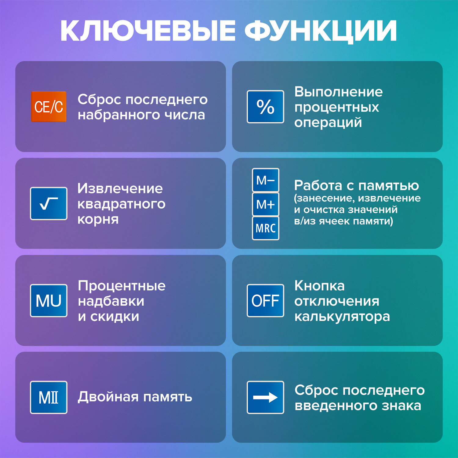 Калькулятор настольный BRAUBERG EXTRA-12-BU (206x155 мм), 12 разрядов, двойное питание, СИНИЙ Код товара: 250482 1 206,35 ₽ Купить Производитель:BRAUBERG Настольный калькулятор BRAUBERG EXTRA-12-BU. Большой дисплей с увеличенным углом обзора, устойчивый корпус и клавиатура с цветной дифференциацией для эффективной работы с максимальным комфортом. Калькулятор производит все основные арифметические действия: возведение в степень, вычисления с процентами, извлечение квадратного корня. Незаменим для бухгалтеров благодаря наличию клавиш двойной памяти, «00» и MU для расчетов налогов и торговой наценки. Переключатели округления и положения десятичного знака позволяют производить нужные настройки. Большой двенадцатиразрядный дисплей отображает большие значения с высокой точностью округления. Встроенный аккумулятор и солнечная батарея позволяют калькулятору работать при любом освещении, а клавиша выключения OFF и функция автоматического отключения (через 8-10 минут бездействия) позволяют максимально продлить срок его службы без замены батареи. Размер - 206x155 мм. Гарантия 10 лет.Производство: КитайРазрядность дисплея: 12Серия: ExtraТип размера: полноразмерныйТип применения: для бухгалтеровСтиль: классическийФункционал: вычисление наценки (MU)Исполнение: настольныйЧисло строк дисплея: 1Материал кнопок: пластикТип питания: 1 батарейка LR44 (LR1154/AG13), солнечный элементЦвет панели: синийДлина корпуса: 206 ммШирина корпуса: 155 ммВысота корпуса: 40 ммВес: 350 грРазмер упаковки: 3.7 × 24.4 × 15.8 смОбъём: 0.0019 м3Промежуточная упаковка: 20 штТранспортная упаковка: 40 штШтрих-код: 4606224282510 Сертификат-1.jpg Сертификат-2.jpg Сертификат-3.jpg