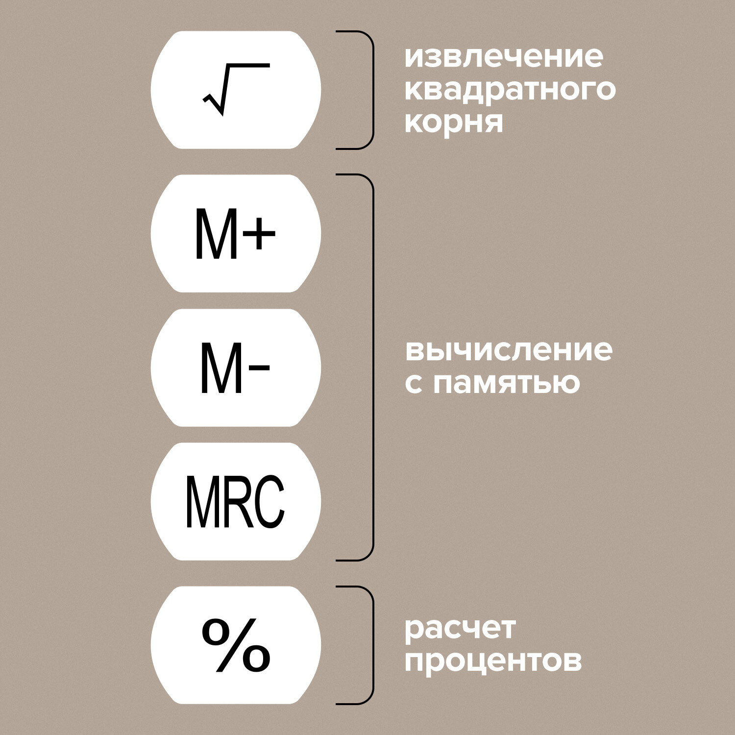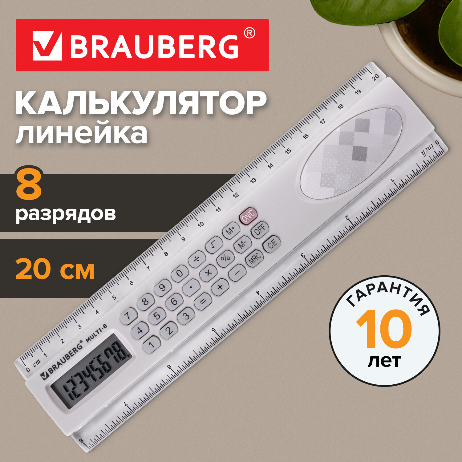 Калькулятор с линейкой 20 см, BRAUBERG MULTI-8 (53x210 мм), 8 разрядов Код товара: 250540 410,4 ₽ Купить Производитель:BRAUBERG Линейка с калькулятором BRAUBERG MULTI-8 — это компактный и удобный инструмент, предназначенный для выполнения вычислительных, чертежных и измерительных работ в школе, дома и в офисе. Стильный минималистичный дизайн отлично впишется в любой интерьер. Современный и незаменимый девайс 2 в 1: линейка со шкалой 20 см и калькулятор. Размер: 53х210х13 мм. Упаковка: блистер с европодвесом. Гарантия: 10 лет. 8-ми разрядный калькулятор производит все основные арифметические действия, в том числе вычисление с памятью, вычисление с процентами, возведение в степень и извлечение квадратного корня. Вводимые данные и результаты вычислений хорошо видны на жидкокристаллическом дисплее благодаря надежному японскому коннектору. Прорезиненные антискользящие кнопки гарантируют комфортное использование и долгий срок службы изделия. Работает от сменной батарейки LR44 (LR1154/AG13). Размер дисплея: 37х14 мм. Цвет: серый. Длина шкалы линейки составляет 20 см. Имеет двойную градацию (сантиметр и дюйм). Линейка обладает четкой разметкой, что делает ее удобной в использовании. Цвет: прозрачный.Производство: КитайРазрядность дисплея: 8Серия: MULTI-8Тип размера: компактныйТип применения: универсальныйСтиль: классическийФункционал: возведение в степень, вычисление с памятью, извлечение квадратного корня, расчет процентов, сложение, вычитание, деление, умножениеИсполнение: настольныйЧисло строк дисплея: 1Материал кнопок: резинаТип питания: 1 батарейка LR44 (LR1154/AG13)Цвет панели: серыйДлина корпуса: 210 ммШирина корпуса: 53 ммВысота корпуса: 13 ммВес: 113 грРазмер упаковки: 1.8 × 28.8 × 10.6 смОбъём: 0.0008 м3Промежуточная упаковка: 30 штТранспортная упаковка: 180 штШтрих-код: 4606224353845 Сертификат-1.jpg Сертификат-2.jpg Сертификат-3.jpg