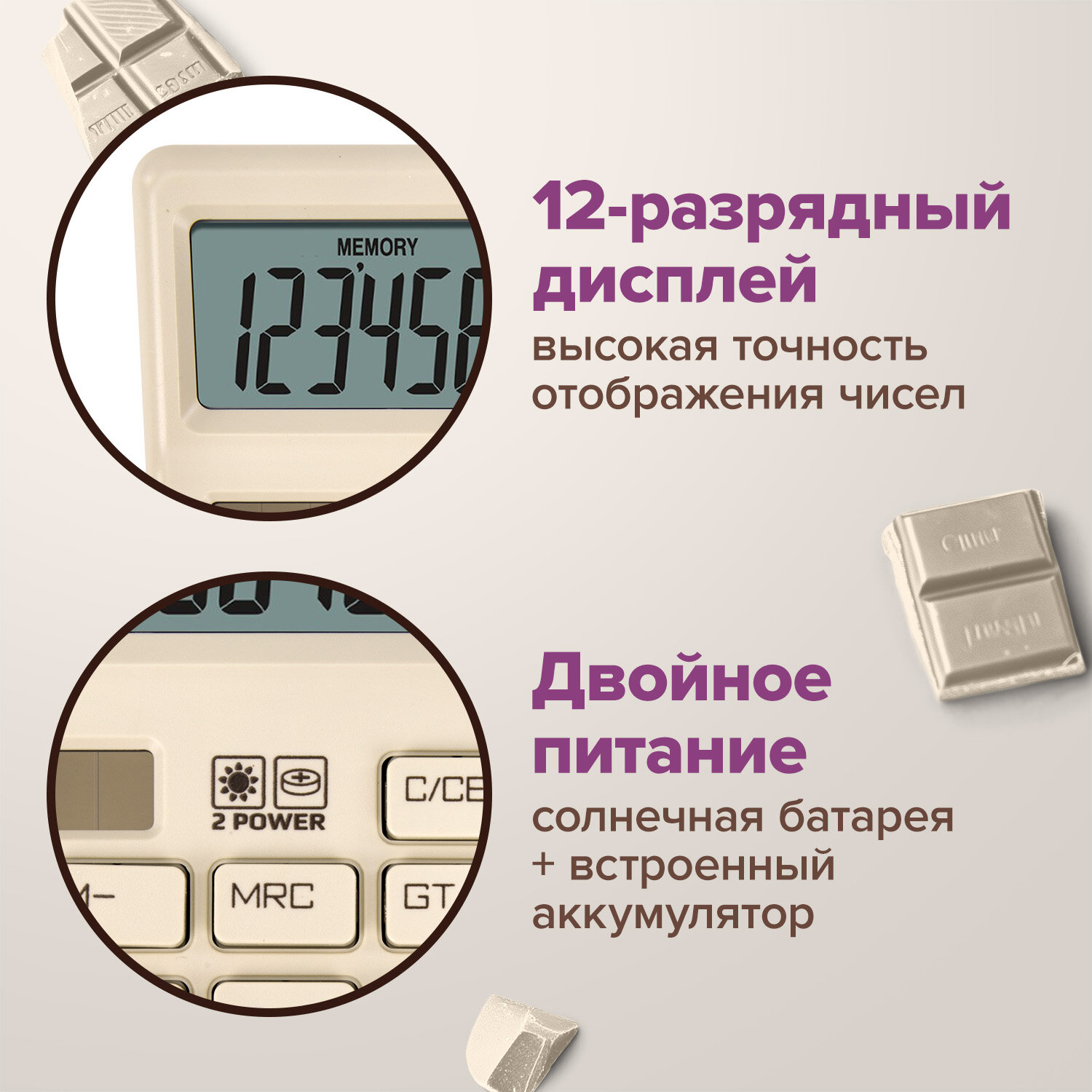 Калькулятор настольный BRAUBERG CH-12-BG (153х103 мм), 12 разрядов, двойное питание, бежевый, 272960 Код товара: 272960 434,29 ₽ Купить Производитель:BRAUBERG Настольный калькулятор BRAUBERG CH-12 минималистичного дизайна — надежный инструмент для ежедневных расчетов. Большой удобный экран и продуманный набор функций делают его отличным выбором для работы в офисе, занятий в школе и домашнего использования. Калькулятор выполняет все основные арифметические действия, вычисления с процентами и извлечение квадратного корня. Удобен в работе благодаря клавишам корректировки числа, "00" и "GT" (общее суммирование), а также кнопкам для работы с памятью. Мощный аккумулятор и солнечная батарея обеспечивают работу при любом освещении. Функция автоматического отключения (через 8–10 минут бездействия) значительно продлевает срок службы без замены батареи. Размер – 153х103 мм. Гарантия – 10 лет.Производство: КитайРазрядность дисплея: 12Серия: CH-12Тип размера: компактныйТип применения: универсальныйСтиль: дизайнерскийФункционал: вычисление с памятью, извлечение квадратного корня, общее суммирование (GT), расчет процентов, сложение, вычитание, деление, умножениеИсполнение: настольныйЧисло строк дисплея: 1Тип питания: 1 батарейка AG10Цвет панели: бежевыйДлина корпуса: 153 ммШирина корпуса: 103 ммВысота корпуса: 30 ммВес: 153 грРазмер упаковки: 2.6 × 18.3 × 10.7 смОбъём: 0.0007 м3Промежуточная упаковка: 20 штТранспортная упаковка: 80 штШтрих-код: 4606224453071 Сертификат-1.jpg Сертификат-2.jpg Сертификат-3.jpg