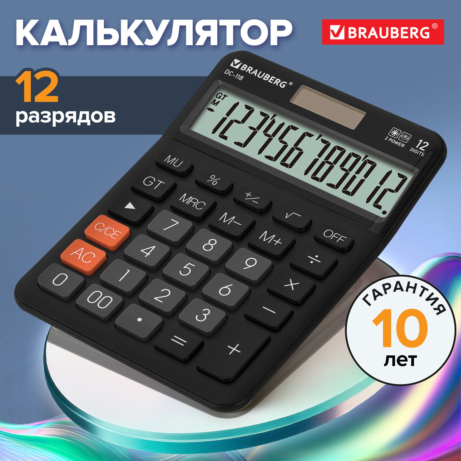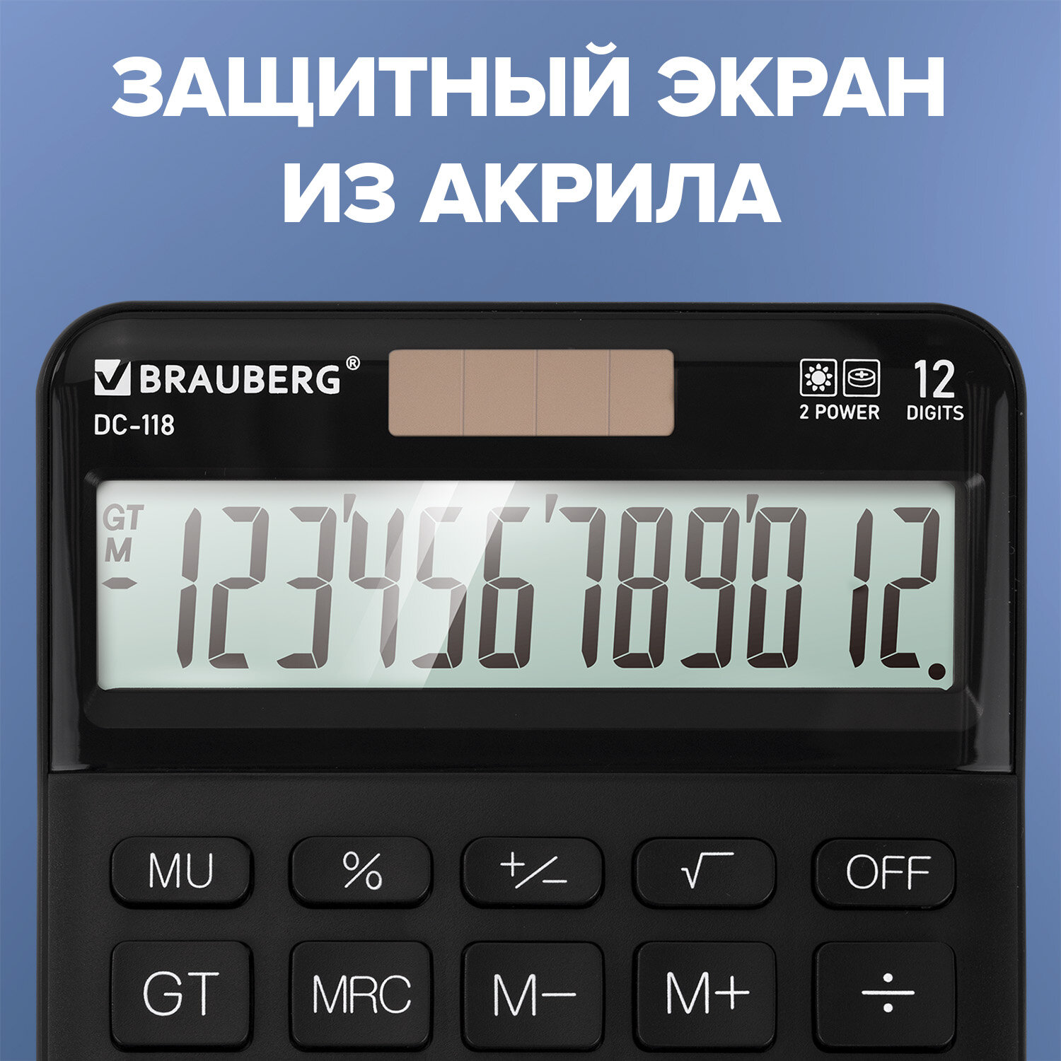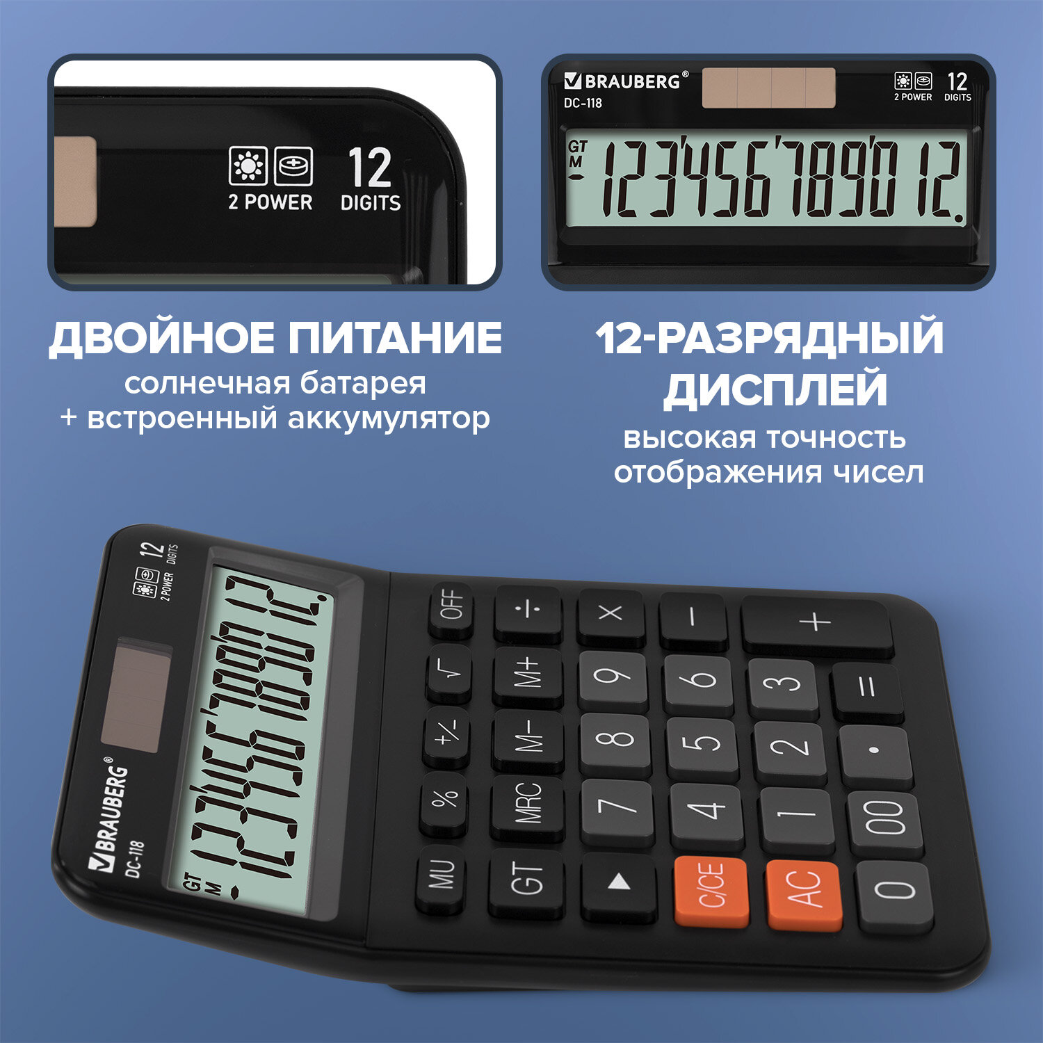 Калькулятор настольный BRAUBERG DC-118-BK (175х126 мм), 12 разрядов, двойное питание, черный, 272962 Код товара: 272962 579,6 ₽ Купить Производитель:BRAUBERG Настольный калькулятор BRAUBERG DC-118 сочетает стильный дизайн, устойчивый корпус и большие округлые кнопки для удобного ввода. Оснащение солнечной батареей делает его надежным помощником в офисе, школе и дома. Калькулятор выполняет все основные арифметические действия, вычисления с процентами, извлечение квадратного корня и расчёт наценки (MU). Удобен в работе благодаря клавишам корректировки числа, "00" и "GT" (общее суммирование), а также кнопкам для работы с памятью. Мощный аккумулятор и солнечная батарея обеспечивают работу при любом освещении. Клавиша выключения OFF и функция автоматического отключения (через 8–10 минут бездействия) значительно продлевают срок службы без замены батареи. Размер – 175х126 мм. Гарантия – 10 лет.Производство: КитайРазрядность дисплея: 12Серия: DC-118Тип размера: компактныйТип применения: универсальныйСтиль: дизайнерскийФункционал: вычисление наценки (MU), вычисление с памятью, извлечение квадратного корня, общее суммирование (GT), расчет процентов, сложение, вычитание, деление, умножениеИсполнение: настольныйЧисло строк дисплея: 1Тип питания: 1 батарейка L1154F/AG13Цвет панели: черныйДлина корпуса: 175 ммШирина корпуса: 126 ммВысота корпуса: 42 ммВес: 240 грРазмер упаковки: 3.5 × 21 × 13 смОбъём: 0.0012 м3Промежуточная упаковка: 20 штТранспортная упаковка: 80 штШтрих-код: 4606224453095 Сертификат-1.jpg Сертификат-2.jpg Сертификат-3.jpg