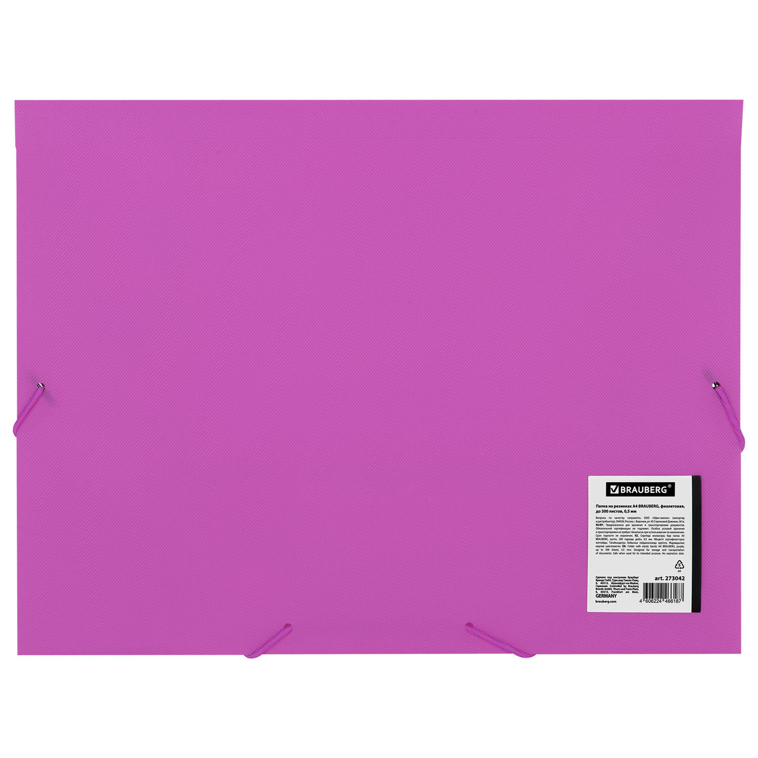 Папка на резинках А4 BRAUBERG PIXEL, фиолетовая, до 300 листов, 0,5 мм Код товара: 273042 101,51 ₽ Купить Производитель:BRAUBERG Папка на резинках BRAUBERG предназначена для защиты документов от повреждений. Такие папки широко применяются не только в офисах, деловой жизни, но и в быту для хранения личной документации, учебных материалов. Папка на резинках формата А4 изготовлена из полипропилена плотностью 500 мкм с фактурой "пиксель". Клапаны надежно удерживают документы внутри, не позволяя им выпасть и потеряться, а резинки, расположенные на углах, плотно закрывают папку. Резинки являются надежными фиксирующими элементами. Их прочность позволяет сохранять качество после огромного количества растяжений. Эти фиксаторы позволяют за несколько секунд достать и уложить нужный документ. Папка способна вмещать до 300 листов стандартной плотности, что делает ее универсальной как для транспортировки, так и для долгосрочного хранения документов.Производство: КитайТип: папка на резинкахФормат: А4Вместимость до: 300 листовФактура: пиксельТолщина пластика: 500 мкмРасположение резинки: на углахСерия: PixelЦвет: фиолетовыйВысота: 225 ммШирина: 320 ммШирина корешка: 35 ммМатериал: полипропиленВид пластика: непрозрачныйИндивидуальная упаковка: даВес: 83 грРазмер упаковки: 0.5 × 32 × 24.9 смОбъём: 0.0005 м3Промежуточная упаковка: 100 штТранспортная упаковка: 100 штШтрих-код: 4606224466187 Файлы Сертификат-1.jpg Сертификат-2.jpg Сертификат-3.jpg Сертификат-4.jpg Сертификат-5.jpg Сертификат-6.jpg Сертификат-7.jpg Сертификат-8.jpg Сертификат-9.jpg Сертификат-10.jpg Сертификат-11.jpg Сертификат-12.jpg Сертификат-13.jpg Сертификат-14.jpg Сертификат-15.jpg Сертификат-16.jpg Сертификат-17.jpg Сертификат-18.jpg Сертификат-19.jpg Сертификат-20.jpg Сертификат-21.jpg Сертификат-22.jpg Сертификат-23.jpg Сертификат-24.jpg Сертификат-25.jpg Сертификат-26.jpg