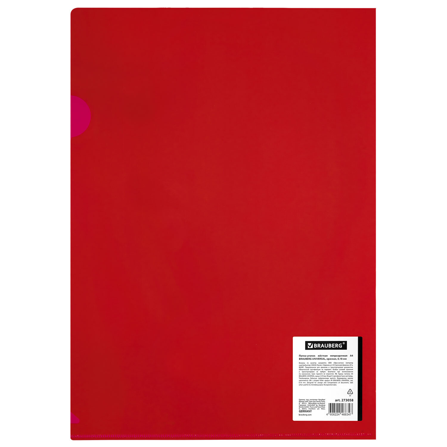 Папка-уголок жесткая, непрозрачная, А4, BRAUBERG "UNIVERSAL", красная, 0,18 мм Код товара: 273058 21,74 ₽ Купить Производитель:BRAUBERG Папка-уголок BRAUBERG "UNIVERSAL" предназначена для хранения и транспортировки документов. Является незаменимым атрибутом для студента, школьника или офисного работника. Папка формата А4 выполнена из высококачественного полипропилена плотностью 180 мкм. Она предотвращает смятие, загрязнение или намокание бумаг. Прозрачный материал позволяет увидеть содержимое, не открывая папку. Специальная выемка для перелистывания листов облегчает работу с документами.Производство: КитайВид папки: прозрачнаяТолщина пластика: 180 мкмФормат: А4Количество отделений: 1Количество в комплекте: 1 шт.Серия: UniversalОсобенности: вырез для извлечения бумагЦвет: красныйВысота: 310 ммШирина: 220 ммВес: 24 грРазмер упаковки: 0.1 × 30.9 × 22.1 смПромежуточная упаковка: 15 штТранспортная упаковка: 450 штШтрих-код: 4606224466347 Файлы Сертификат-1.jpg Сертификат-2.jpg Сертификат-3.jpg Сертификат-4.jpg Сертификат-5.jpg Сертификат-6.jpg Сертификат-7.jpg Сертификат-8.jpg Сертификат-9.jpg Сертификат-10.jpg Сертификат-11.jpg Сертификат-12.jpg Сертификат-13.jpg Сертификат-14.jpg Сертификат-15.jpg Сертификат-16.jpg Сертификат-17.jpg Сертификат-18.jpg Сертификат-19.jpg Сертификат-20.jpg Сертификат-21.jpg Сертификат-22.jpg Сертификат-23.jpg Сертификат-24.jpg Сертификат-25.jpg Сертификат-26.jpg