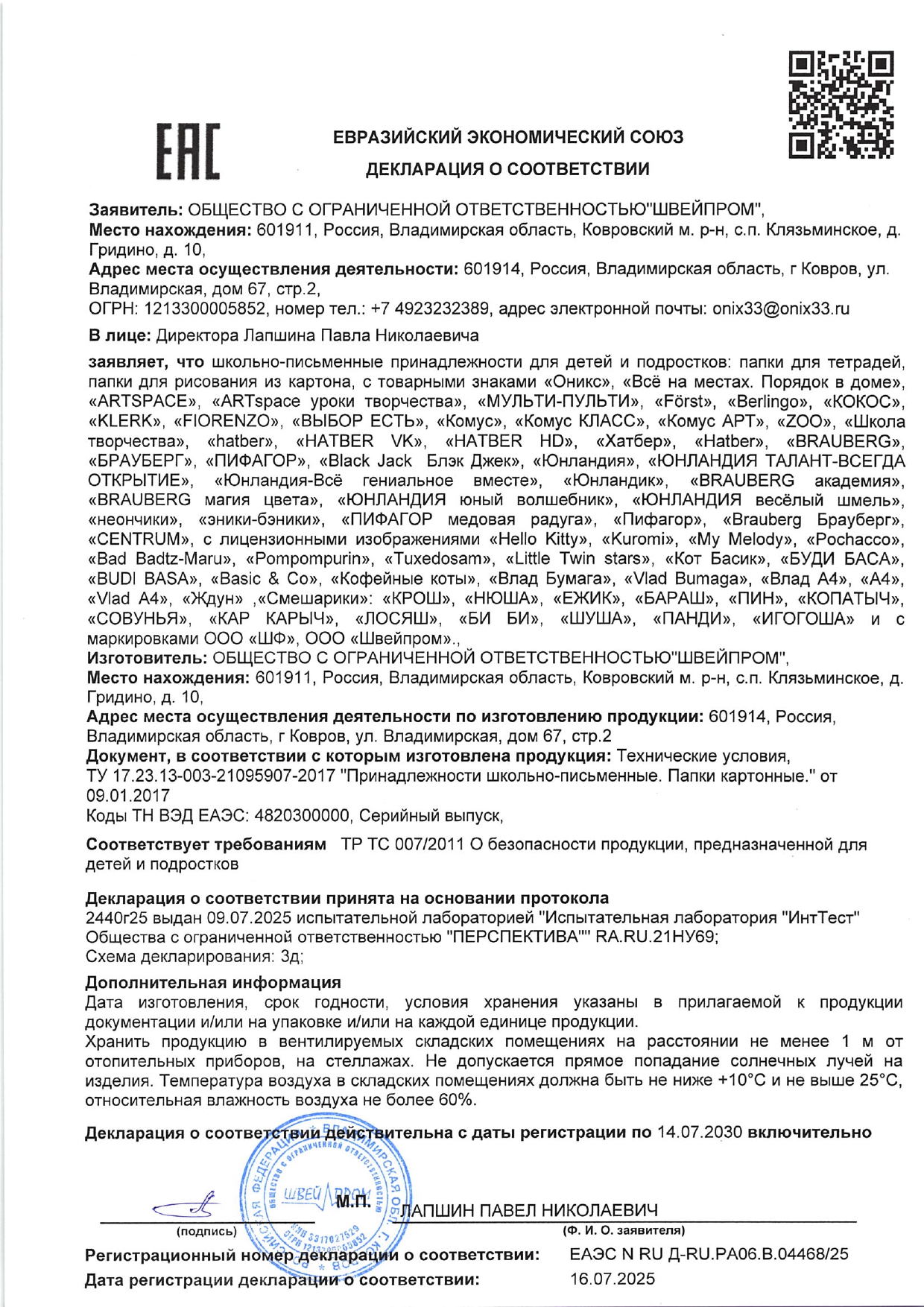 Папка на молнии BRAUBERG А4 с ручкой, с органайзером, 1 отделение, "Score goal" Код товара: 273385 391,05 ₽ Купить Производитель:BRAUBERG Папка на молнии BRAUBERG с ручкой и органайзером. Внутри папки – крепления для канцелярских и письменных принадлежностей. Застежка-молния расположена по периметру папки. Задняя стенка папки выполнена из полиэстера, корпус – из плотного картона, по краям папка имеет тканевую окантовку. Внутри папки есть органайзер, который позволяет держать в порядке канцелярские и письменные принадлежности. Тканевая ручка с пластиковой вставкой внутри позволяет переносить папку в руке и вешать её на крючок под партой. Застегивается на молнию по периметру. Подходит для бумаг и учебных пособий формата А4. Яркая и четкая печать дизайна на передней части папки. Упакована в индивидуальный прозрачный пакет-термоусадку.Производство: РоссияФормат: А4Тип товара: папка для тетрадейПол ребенка: для мальчиковЗастежка: молнияКоличество отделений: 1Материал папки: картон, полиэстерЦветная печать: даСерия: EQUIPДизайн: Score goalДлина: 23.5 смШирина: 34 смГлубина: 3 смВес: 329 грРазмер упаковки: 3.3 × 33.9 × 25.1 смОбъём: 0.0034 м3Промежуточная упаковка: 12 штТранспортная упаковка: 12 штШтрих-код: 4606224494203 Сертификат-1.jpg Сертификат-2.jpg Сертификат-3.jpg