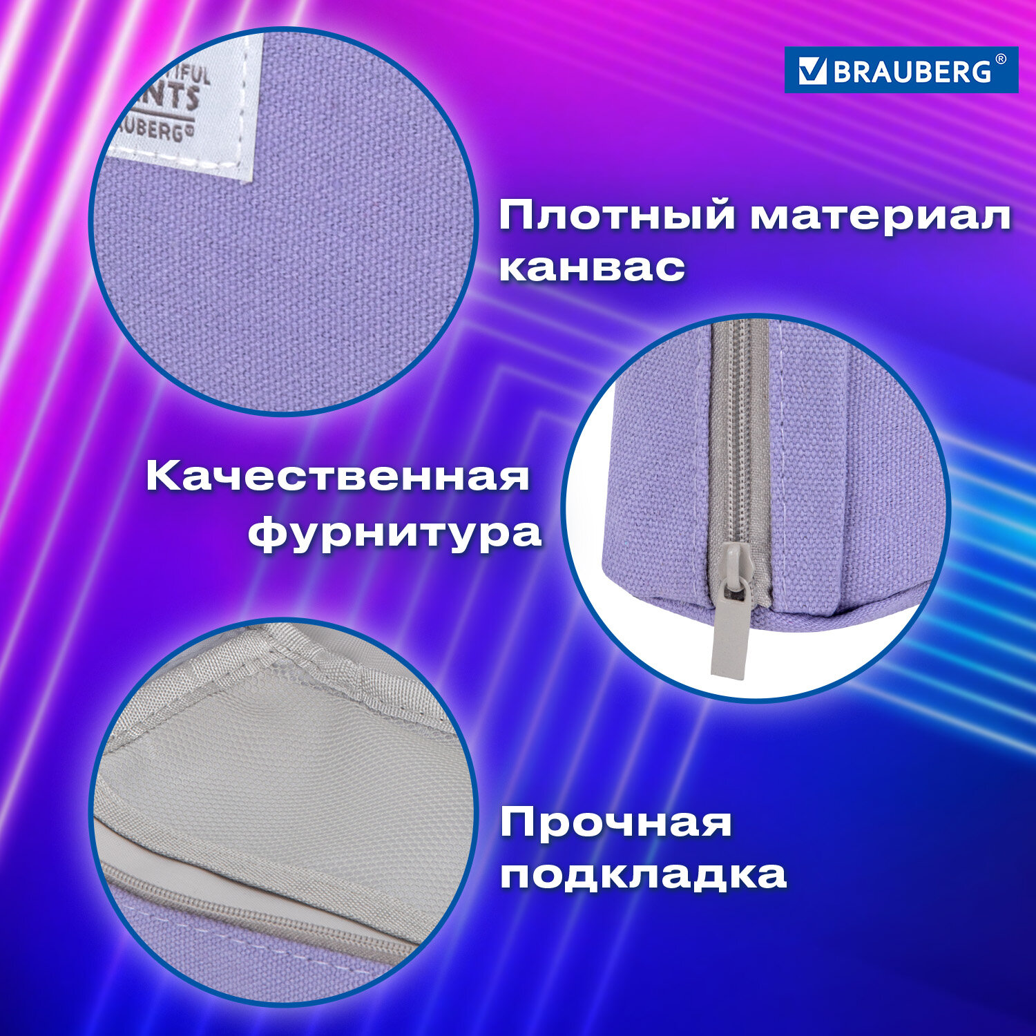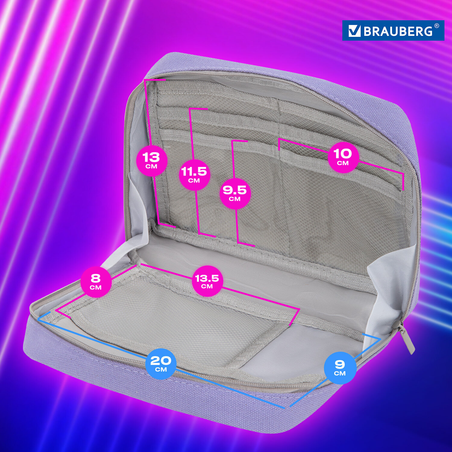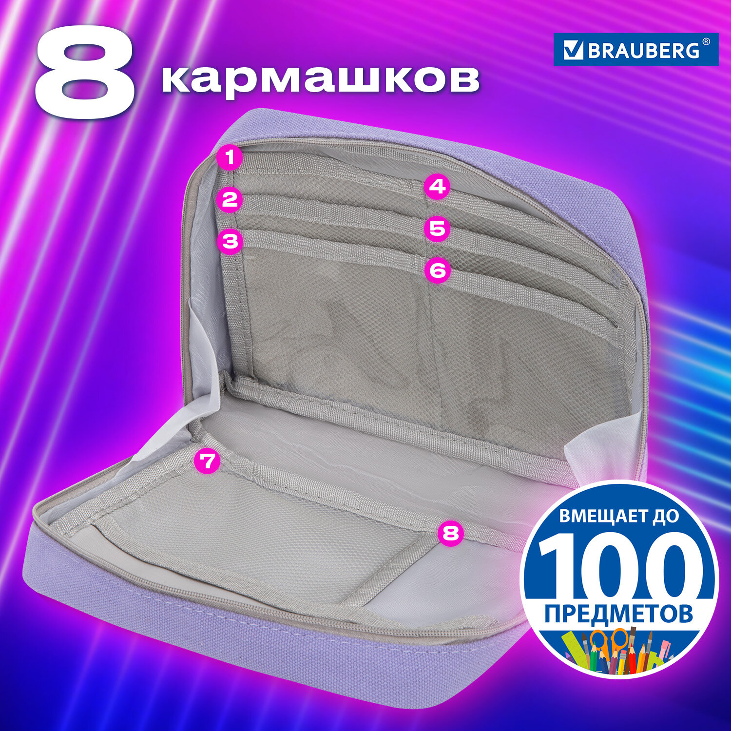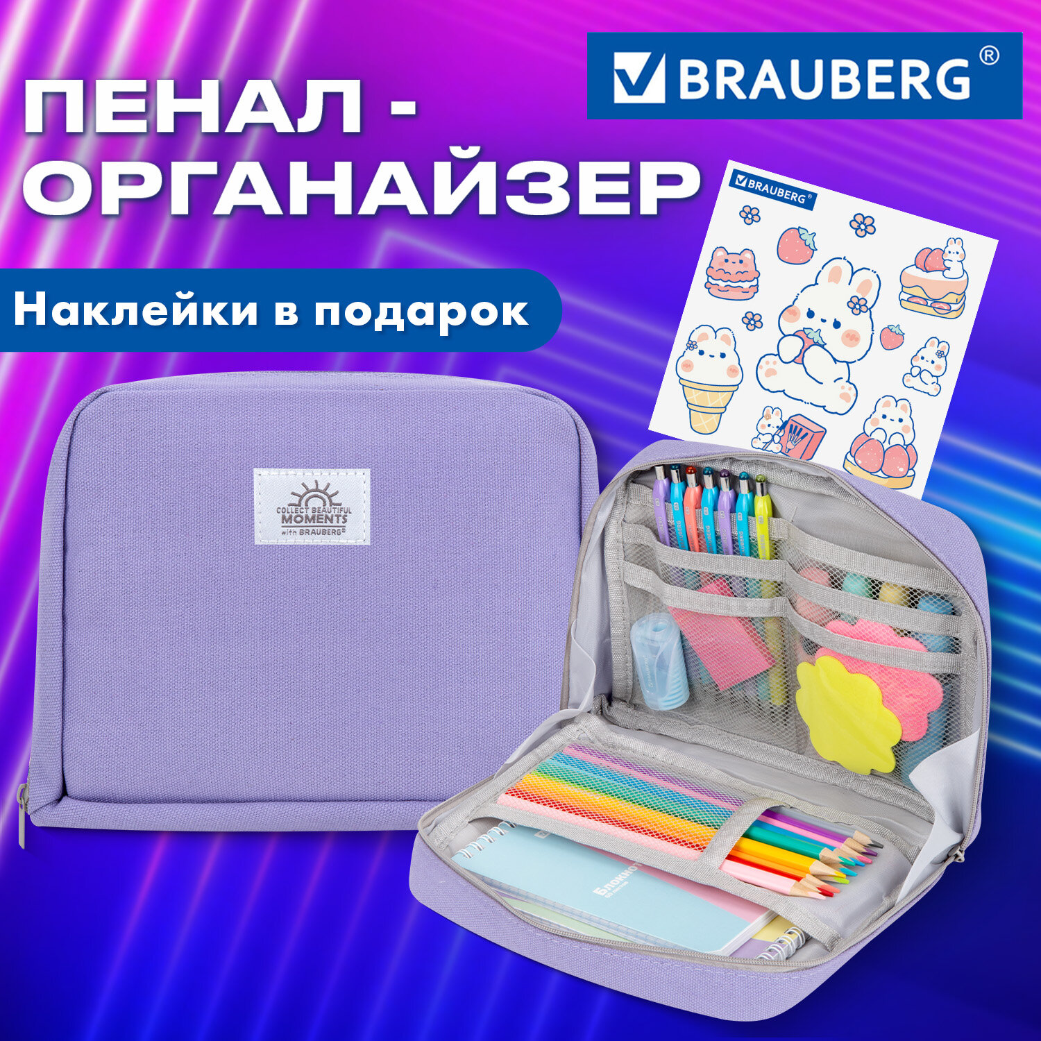 Пенал-органайзер BRAUBERG, 1 отделение, С НАКЛЕЙКАМИ, молния вокруг, канвас, 22x15х6 см, фиолетовый Код товара: 273594 377,87 ₽ Купить Производитель:BRAUBERG Пенал-органайзер BRAUBERG MOMENTS увеличенного объема выполнен из прочного материала - канвас. Надежная молния оснащена металлическим брендированным бегунком. Пенал вмещает до 100 канцелярских предметов стандартных размеров. Уникальный сет наклеек внутри. Пенал BRAUBERG MOMENTS имеет одно вместительное отделение с 8 карманами, что позволяет разместить до 100 предметов. Застежка-молния, расположенная вокруг, обеспечивает удобный доступ к содержимому. Пенал имеет оптимальный размер для размещения в нем не только канцелярских принадлежностей и принадлежностей для творчества, но и повседневных мелочей, аксессуаров, таким образом может выполнять роль универсального несессера, который можно всегда взять с собой. Внутри пенала уникальный сет наклеек, с помощью которых можно украсить как сам пенал, так и другие личные вещи. Упакован в ПЭТ-пакет с европодвесом, который сохранит качество и товарный вид при хранении и транспортировке.Производство: КитайТип товара: пенал-органайзерЗастежка: молнияНазначение: универсальноеКоличество отделений: 1Материал: канвасСерия: MOMENTS ORGANIZERДизайн: PurpleБазовый цвет: фиолетовыйДлина: 22 смШирина: 15 смУпаковка: прозрачный пакет с европодвесомВес: 118 грРазмер упаковки: 4.2 × 24 × 18.2 смОбъём: 0.0013 м3Промежуточная упаковка: 12 штТранспортная упаковка: 72 штШтрих-код: 4606224495538 Сертификат-1.jpg Сертификат-2.jpg Сертификат-3.jpg