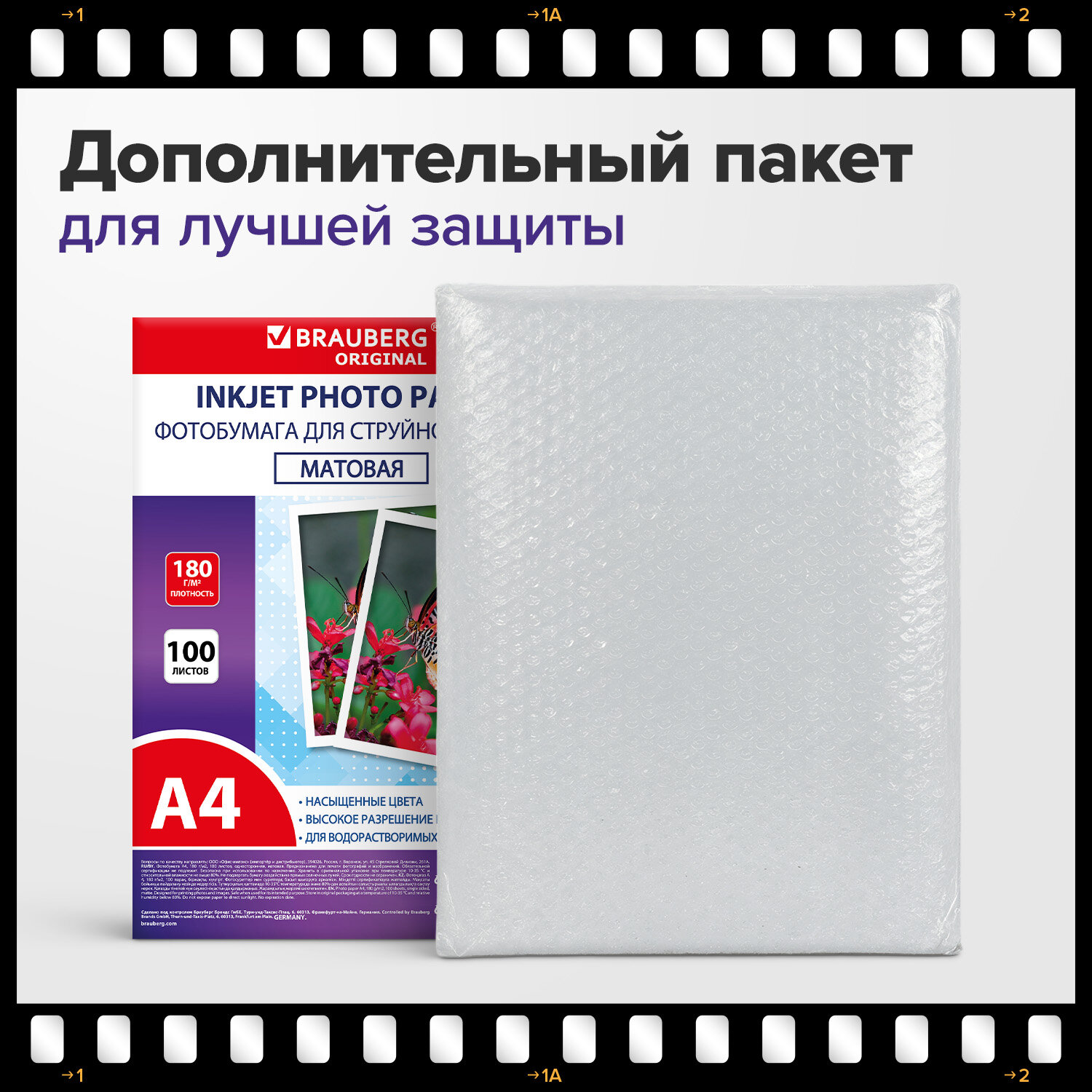 Фотобумага матовая, А4, 180 г/м2, односторонняя, 100 листов, ПАКЕТ, BRAUBERG ORIGINAL Код товара: 364430 675,25 ₽ Купить Производитель:BRAUBERG Матовая односторонняя фотобумага BRAUBERG подходит для всех типов струйных принтеров. Незаменима для печати рекламных материалов, текста, портфолио и фотопортретов. Напечатанное изображение не бликует, а тона имеют бархатистую глубину. Имеет формат А4 и плотность 180 г/м2, что исключает просвечивание изображения. Отлично подходит для печати черно-белых изображений. Гладкая поверхность обеспечивает превосходное качество, а особый состав – идеальную цветопередачу. Печать возможна водорастворимыми и пигментными чернилами. Поставляется по 100 листов в плотном пузырчатом пакете, защищающем бумагу от механических повреждений при доставке.Производство: КитайФормат: А4Тип поверхности: матоваяПлотность: 180 г/м2Серия: ORIGINAL PLUSТехнология печати: для струйной печатиКоличество листов в упаковке: 100 шт.Вес: 1,19 кгРазмер упаковки: 3 × 31.4 × 26 смОбъём: 0.0026 м3Промежуточная упаковка: 12 штТранспортная упаковка: 12 штШтрих-код: 4606224459370 Файлы Сертификат-1.jpg Сертификат-2.jpg Сертификат-3.jpg Сертификат-4.jpg Сертификат-5.jpg Сертификат-6.jpg Сертификат-7.jpg Сертификат-8.jpg Сертификат-9.jpg Сертификат-10.jpg Сертификат-11.jpg Сертификат-12.jpg Сертификат-13.jpg Сертификат-14.jpg Сертификат-15.jpg Сертификат-16.jpg Сертификат-17.jpg Сертификат-18.jpg Сертификат-19.jpg Сертификат-20.jpg Сертификат-21.jpg Сертификат-22.jpg Сертификат-23.jpg Сертификат-24.jpg Сертификат-25.jpg Сертификат-26.jpg