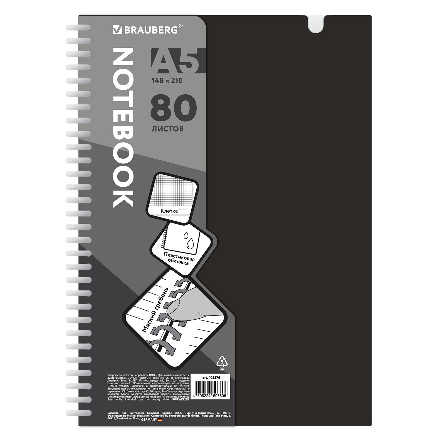Тетрадь обложка пластик, А5 80 л., гребень мягкий, вырубка для ручки, клетка, BRAUBERG, черный Код товара: 405376 169,56 ₽ Купить Производитель:BRAUBERG Стильная и практичная тетрадь BRAUBERG станет незаменимым помощником для старшеклассников, студентов и офисных сотрудников. Она идеально подходит для учебы, работы и повседневных записей, обеспечивая комфорт и удобство в использовании. Прочная пластиковая обложка надежно защищает внутренний блок от повреждений и влаги, продлевая срок службы тетради. Обложка тетради оснащена специальной вырубкой для удобного крепления ручки. Внутри – 80 листов высококачественной офсетной бумаги плотностью 70 г/м2 и белизной 100%, обеспечивающей комфортное письмо. Удобная линовка в клетку с полями помогает вести структурированные записи. Листы скреплены мягким силиконовым гребнем, что обеспечивает удобство использования тетради и комфорт при письме. Тетрадь формата А5 – это удобное и практичное решение для учебы, работы и повседневных заметок. Она компактна, легко помещается в сумку или рюкзак, но при этом вместительна для удобного письма.Производство: КитайКоличество листов: 80Тип скрепления: гребень силиконовыйФормат: А5Материал обложки: пластикЛиновка блока: клеткаНаличие полей: даСерия: Мягкий гребень_2Дизайн: ОднотонныйЦвет бумаги блока: белыйПлотность внутреннего блока: 70 г/м2Белизна: 100 %Однотонный дизайн обложки: даКоличество дизайнов в минимальной упаковке: 1 шт.Количество дизайнов в транспортной упаковке: 1 шт.Длина: 210 ммШирина: 148 ммИндивидуальная упаковка: даВес: 220 грРазмер упаковки: 1.5 × 14.8 × 21 смОбъём: 0.0004 м3Промежуточная упаковка: 48 штТранспортная упаковка: 48 штШтрих-код: 4606224507606 Сертификат-1.jpg Сертификат-2.jpg
