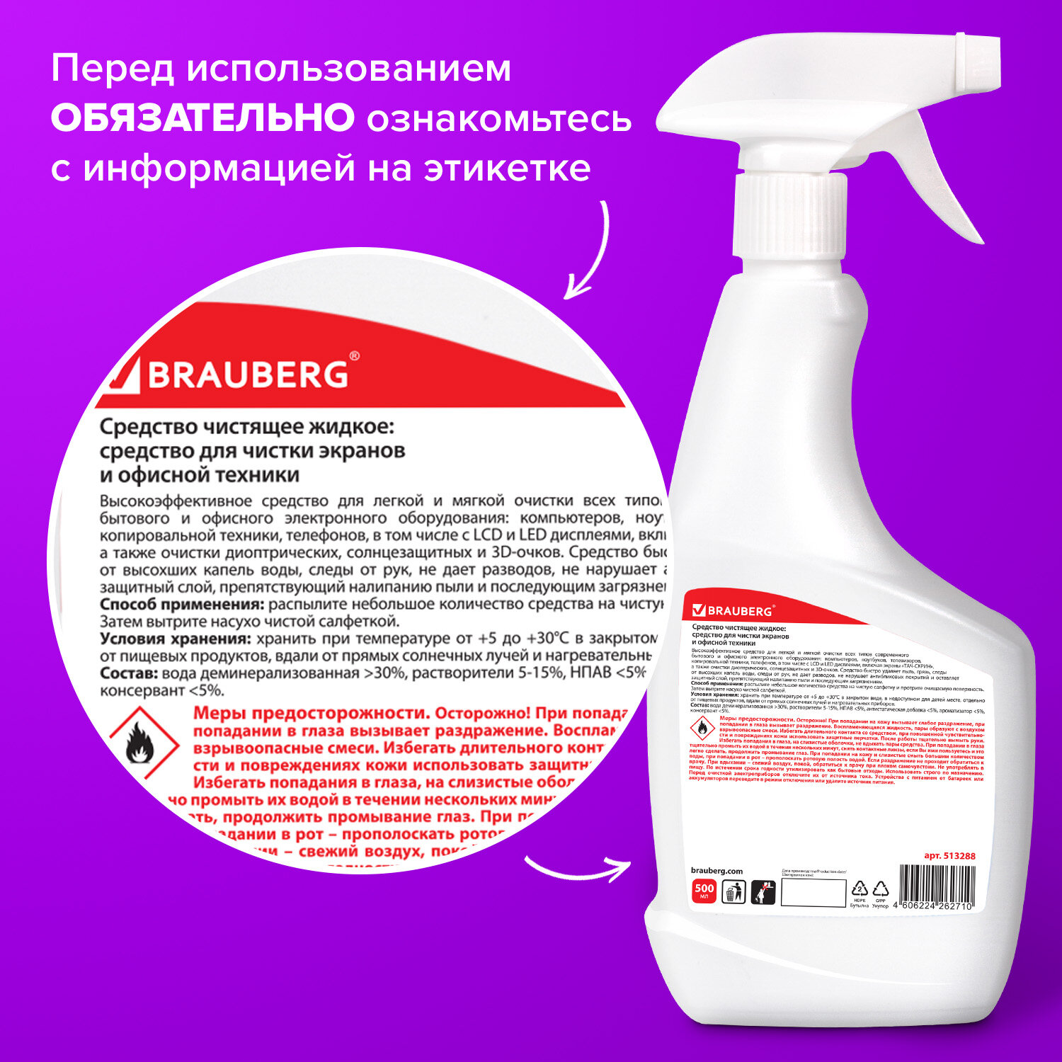 Чистящая жидкость-спрей BRAUBERG для телевизоров, мониторов, техники, оптики и стекол, универсальная, 500 мл Код товара: 513288 264,96 ₽ Купить Производитель:BRAUBERG Высокоэффективное средство BRAUBERG для легкой и мягкой очистки всех типов экранов, оптических, стеклянных и пластиковых поверхностей бытовой и офисной техники от пыли, грязи и жирных пятен. Средство объёмом 500 мл быстро удаляет пыль, грязь, следы от высохших капель воды, следы от рук, не дает разводов, не разрушает антибликовых покрытий, быстро высыхает и оставляет защитный слой с антистатическим действием. ВНИМАНИЕ! Перед очисткой электроприборов отключите их от источников тока. Устройства с питанием от батареек или аккумуляторов переведите в режим отключения или удалите источник питания.Производство: РоссияОчищаемые поверхности: Для любых экранов, стекол и пластикаСерия: Cleaning sprayАнтистатический эффект: даС ароматизатором: даОбъем, мл: 500Срок годности: 36 месВес: 581 грРазмер упаковки: 28.2 × 10.3 × 4.8 смОбъём: 0.0014 м3Промежуточная упаковка: 12 штТранспортная упаковка: 12 штШтрих-код: 4606224262710 Файлы Приложение-1.pdf Сертификат-1.jpg Сертификат-2.jpg Сертификат-3.jpg Сертификат-4.jpg Сертификат-5.jpg Сертификат-6.jpg Сертификат-7.jpg Сертификат-8.jpg Сертификат-9.jpg Сертификат-10.jpg Сертификат-11.jpg Сертификат-12.jpg Сертификат-13.jpg Сертификат-14.jpg Сертификат-15.jpg Сертификат-16.jpg Сертификат-17.jpg Сертификат-18.jpg Сертификат-19.jpg Сертификат-20.jpg Сертификат-21.jpg Сертификат-22.jpg Сертификат-23.jpg Сертификат-24.jpg Сертификат-25.jpg