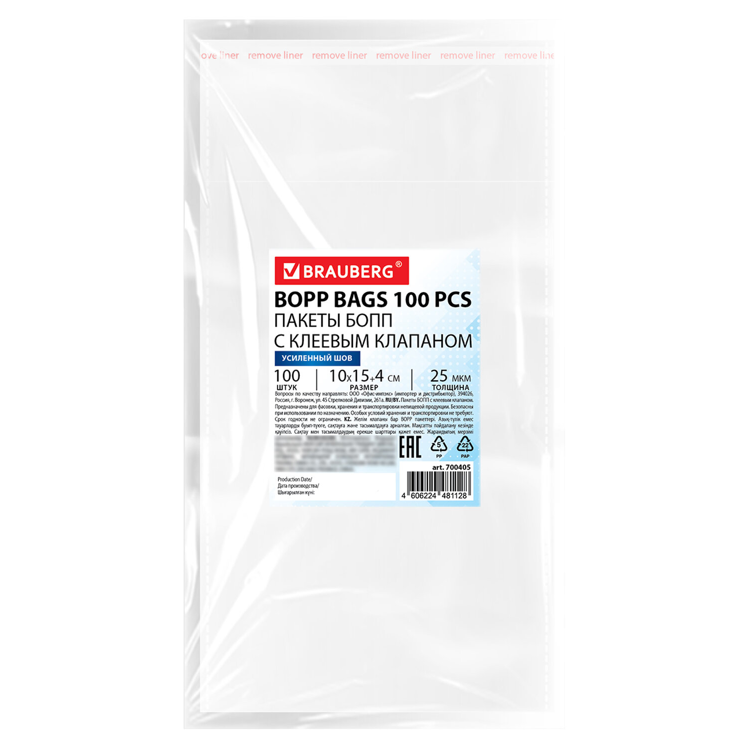 Пакеты БОПП с клеевым клапаном, КОМПЛЕКТ 100 штук, 10х15 + 4 см, 25 мкм, с усиленным швом, BRAUBERG Код товара: 700405 83,84 ₽ Купить Производитель:BRAUBERG Пакеты БОПП BRAUBERG – это идеальное решение для упаковки. Они обеспечивают надежную защиту содержимого, сохраняя свежесть и привлекательный внешний вид. БОПП-упаковка BRAUBERG выполнена из прочного, прозрачного и влагостойкого полипропилена, который подчеркивает эстетику продукта и делает его более привлекательным. Материал надежно защищает содержимое от влаги и пыли, а удобный клеевой клапан обеспечивает быстрое запечатывание. Усиленный шов предотвращает разрывы и повышает долговечность упаковки. Размер: 10х15 см. Клеевой клапан: 10х4 см. Толщина: 25 мкм. Количество: 100 штук.Производство: КитайТип товара: пакеты БОППРазмер: 10х15 смТолщина: 25 мкмКоличество в комплекте: 100 шт.Материал: БОППОсобенности: клеевой крайТип упаковки: пакетВес: 86 грРазмер упаковки: 1 × 19.4 × 11.6 смОбъём: 0.0002 м3Промежуточная упаковка: 300 штТранспортная упаковка: 300 штШтрих-код: 4606224481128 Сертификат-1.jpg Сертификат-2.jpg