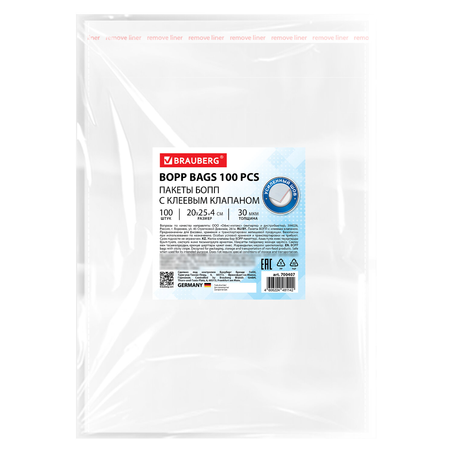 Пакеты БОПП с клеевым клапаном, КОМПЛЕКТ 100 штук, 20х25 + 4 см, 30 мкм, с усиленным швом, BRAUBERG Код товара: 700407 241,01 ₽ Купить Производитель:BRAUBERG Пакеты БОПП BRAUBERG – это идеальное решение для упаковки. Они обеспечивают надежную защиту содержимого, сохраняя свежесть и привлекательный внешний вид. БОПП-упаковка BRAUBERG выполнена из прочного, прозрачного и влагостойкого полипропилена, который подчеркивает эстетику продукта и делает его более привлекательным. Материал надежно защищает содержимое от влаги и пыли, а удобный клеевой клапан обеспечивает быстрое запечатывание. Усиленный шов предотвращает разрывы и повышает долговечность упаковки. Размер: 20х25 см. Клеевой клапан: 20х4 см. Толщина: 30 мкм. Количество: 100 штук.Производство: КитайТип товара: пакеты БОППРазмер: 20х25 смТолщина: 30 мкмКоличество в комплекте: 100 шт.Материал: БОППОсобенности: клеевой крайТип упаковки: пакетВес: 315 грРазмер упаковки: 1 × 29.5 × 22.4 смОбъём: 0.0005 м3Промежуточная упаковка: 70 штТранспортная упаковка: 70 штШтрих-код: 4606224481142 Сертификат-1.jpg Сертификат-2.jpg