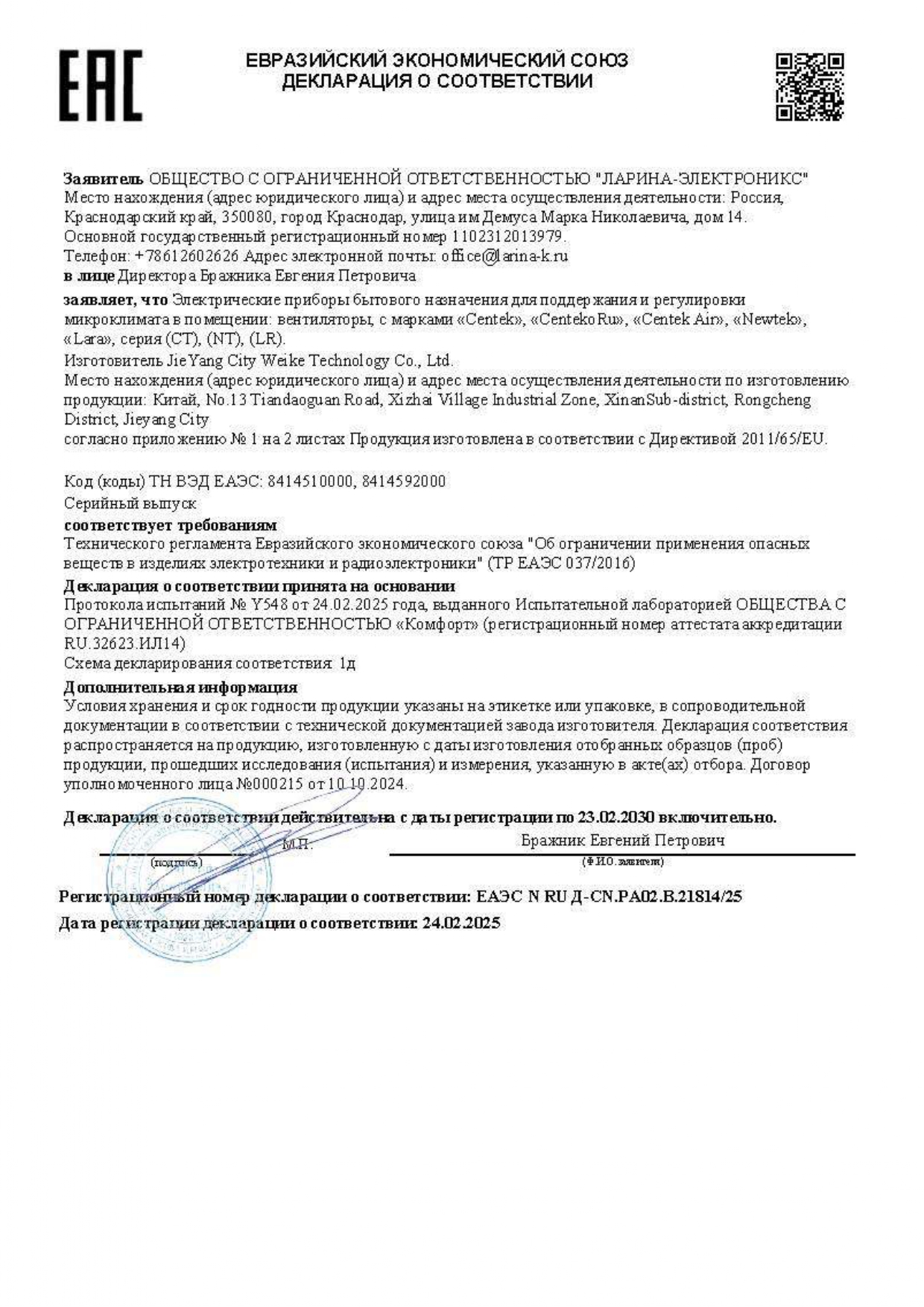 Вентилятор настольный CENTEK CT-5045, 4 режима, d=15 см, 5 Вт, белый Код товара: 458435 1 120,95 ₽ Купить Производитель:CENTEK Создайте локальное охлаждение там, где оно нужно больше всего, с настольным вентилятором CENTEK CT-5045 – компактным и мобильным решением для дома, офиса или учебного пространства! Модель оснащена устойчивым основанием-прищепкой, что позволяет закрепить устройство практически на любой поверхности – от стола до спинки стула. Благодаря 4 скоростям работы и функции регулировки наклона, вы легко настроите комфортный воздушный поток под свои нужды. Прибор потребляет всего 5 Вт, обеспечивая экономичное и бесшумное охлаждение. Управление – механическое, интуитивно понятное даже для детей. Корпус выполнен из прочного пластика, а белый цвет придаёт устройству аккуратный и современный вид. Компактные размеры и небольшой вес делают вентилятор удобным в использовании и транспортировке. Это идеальный выбор для тех, кто ценит практичность, мобильность и точечное охлаждение в жаркую погоду. Надёжная конструкция и универсальность крепления превращают его в незаменимого помощника в любых условиях. Производитель оставляет за собой право без предварительного уведомления вносить изменения в технические характеристики, комплектацию и конструкцию, не ухудшающие эксплуатационные характеристики изделий.Производство: КитайВид: настольныйМощность: 5 ВтКоличество скоростей: 4Диаметр решетки: 150 ммКрепление на прищепке: даРегулировка скорости: ступенчатаяУправление: механическоеСерия: CT-5045Регулировка наклона: даРегулировка поворота: даЗащитная решетка: даЦвет корпуса: белыйМатериал корпуса: пластикВысота: 20 смШирина: 15 смГлубина: 9 смВес (без упаковки): 0.4 кгВес: 497 грРазмер упаковки: 17.5 × 15 × 15.5 смОбъём: 0.0049 м3Промежуточная упаковка: 12 штТранспортная упаковка: 12 штШтрих-код: 4680353031942 Файлы Приложение-1.pdf Сертификат-1.jpg Сертификат-2.jpg Сертификат-3.jpg Сертификат-4.jpg Сертификат-5.jpg Сертификат-6.jpg Сертификат-7.jpg Сертификат-8.jpg Сертификат-9.jpg