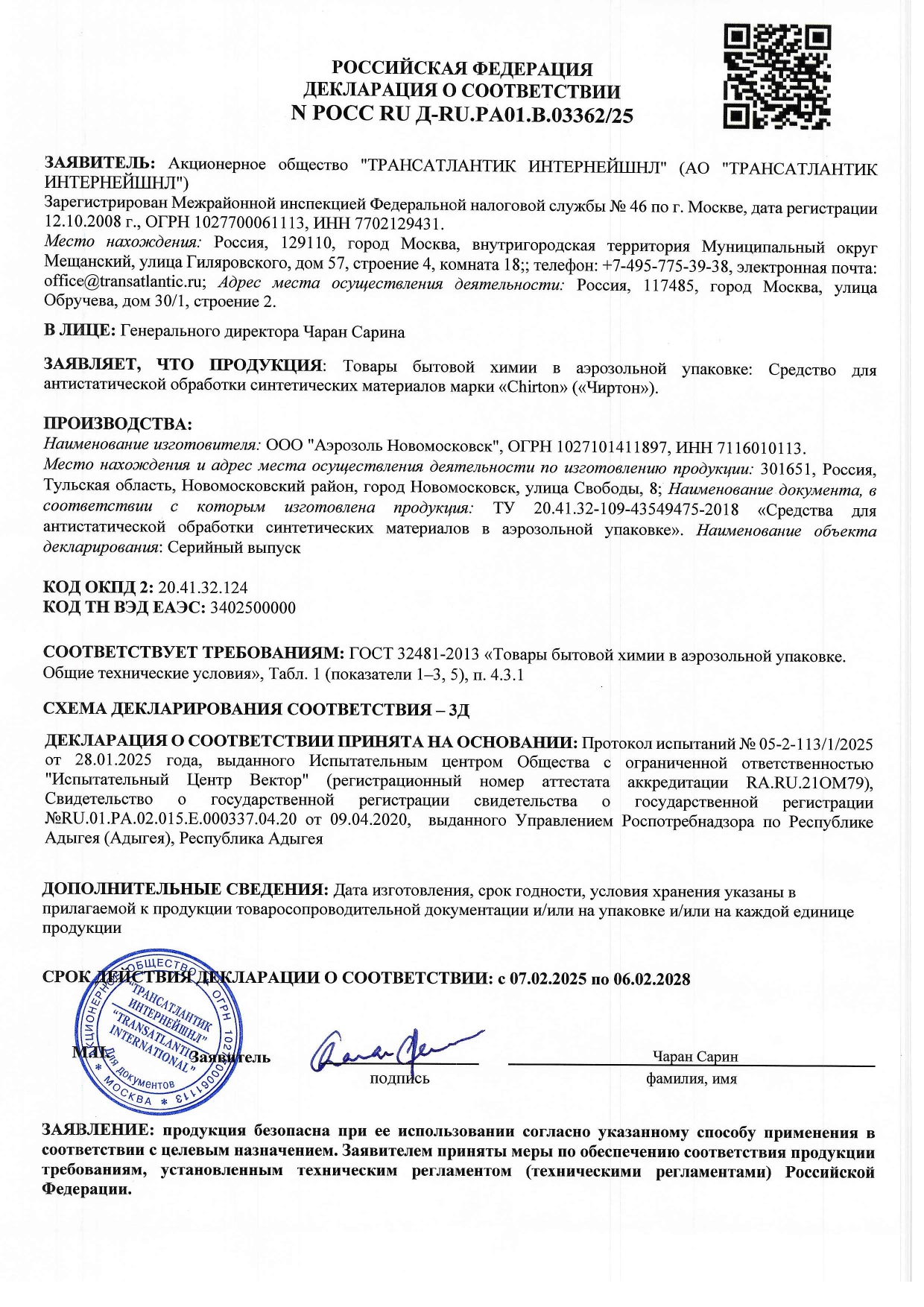 Антистатик 200 мл, CHIRTON (Чиртон), аэрозоль Код товара: 601864 196,79 ₽ Купить Производитель:CHIRTON Препятствует возникновению статического электричества на одежде, тканях, полимерных и пластиковых покрытиях. Не оставляет следов и запаха. Состав: растворитель (более 30%), пропан, бутан, изобутан (более 30%), смесь полиоксиэтиленгликолиевых эфиров высших жирных спиртов (менее 5%), пропиленгликоль (менее 5%).Производство: РоссияОбъем: 200 млОтдушка: нейтральнаяФорма выпуска: аэрозольСрок годности: 24 месВес: 173 грРазмер упаковки: 4.5 × 21.8 × 4.5 смОбъём: 0.0005 м3Промежуточная упаковка: 24 штТранспортная упаковка: 24 штШтрих-код: 4670013301898 Сертификат-1.jpg Сертификат-2.jpg