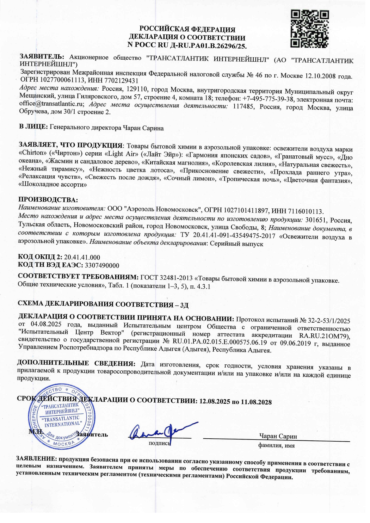 Освежитель воздуха аэрозольный 300 мл CHIRTON (Чиртон) Light Air "Сочный лимон", сухое распыление, 45620 Код товара: 700444 221,93 ₽ Купить Производитель:CHIRTON CHIRTON Light Air - это серия освежителей, созданных на основе натуральных эфирных масел с технологией сухого распыления. Мгновенно растворяется в воздухе и не оставляет брызг и пятен на полу и мебели. Не содержит озоноразрушающих веществ. Преимущества: Мгновенное устранение неприятных запахов. Сухое распыление — без добавления воды. Аромат, который сохраняется надолго благодаря эфирным маслам. Состав: более 30% — алифатические углеводороды (пропан, бутан, изобутан); менее 5% — этиловый спирт денатурированный (3,0% об.), эфирное масло кориандра, отдушка, цитраль, гераниол, гексилциннамаль, лимонен, линалоол.Производство: РоссияТип товара: аэрозольныйОтдушка: Сочный лимонСерия: Light AirСухое распыление: даОбъем/вес: 300 мл/гСрок годности: 36 месВес: 265 грРазмер упаковки: 6.5 × 20.9 × 6.3 смОбъём: 0.0011 м3Промежуточная упаковка: 12 штТранспортная упаковка: 12 штШтрих-код: 4607145645620 Сертификат-1.jpg Сертификат-2.jpg