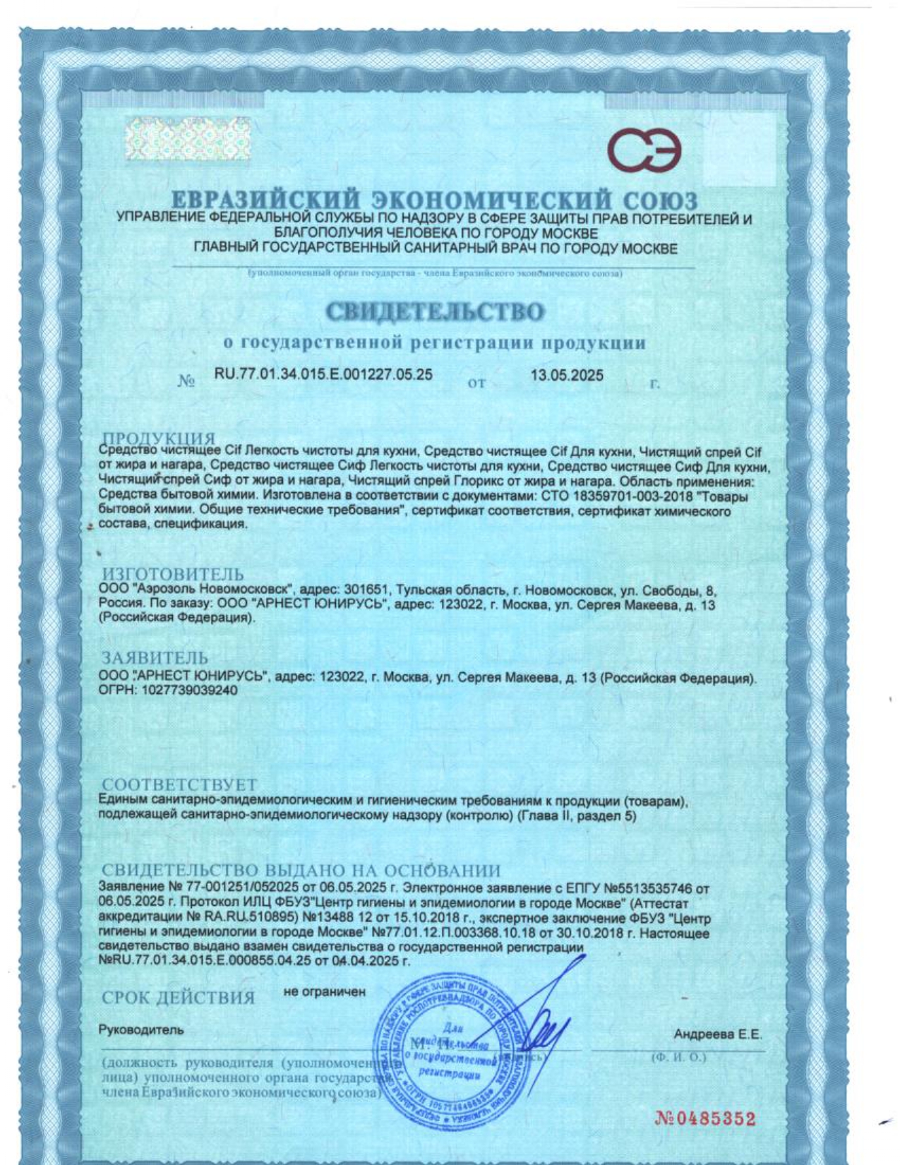 Средство для чистки плит, духовок, грилей от жира и нагара 500 мл, СИФ Антижир "Цитрус" Код товара: 609831 257,56 ₽ Купить Производитель:CIF Средство СИФ Антижир "Цитрус" подходят для удаления жира и нагара с плит, духовок и грилей. Благодаря инновационной формуле обеспечивают быстрое и эффективное удаление жира и пригоревших остатков пищи. Спрей Антижир будет максимально полезен на кухне, где он без труда справится с нагаром и пригоревшими остатками пищи. Средство от жира на кухне СИФ удаляет до 100% наиболее стойких бытовых загрязнений. Используйте Антижир для кухни спрей для очистки плит, вытяжек и духовок. Средство от жира и нагара СИФ подходит для очищения кухонных рабочих поверхностей – в том числе контактирующих с пищей. Спрей-очиститель для кухни Антинагар безопасен даже для деликатных поверхностей, включая стеклокерамику. Чистящее средство Антижир для кухни не оставляет белых следов и разводов. Средство Антижир для кухни в формате спрея действует мгновенно, проникая вглубь загрязнений и растворяя масло, остатки пищи, нагар. Средство от нагара и жира СИФ имеет легкий и приятный цитрусовый аромат. Спрей Антижир для кухни содержит соду и эффективно растворяет загрязнения органического происхождения. Спрей против жира на кухне имеет в своем составе масла апельсина и лимона, которые усиливают очищающий эффект. Спрей Антижир для плит и духовок дерматологически протестирован и отмечен экомаркировкой Листок жизни, которая признана международными организациями. Спрей-жироудалитель для кухни СИФ безопасен для человека и окружающей среды. Чистящее средство для кухни в формате спрея расходуется экономично: 1-2 распылений достаточно для 1 м2 поверхности. Способ применения: Распылите средство для уборки кухни СИФ на загрязненный участок с небольшого расстояния, оставьте на несколько секунд. За это время моющее средство для кухни от жира на основе усиленной формулы растворит загрязнение. Теперь протрите поверхность влажной тканью или губкой, смойте остатки спрея водой. А для безупречного блеска глянцевых поверхностей дополнительно протрите их сухой тканью, убирая остатки влаги. Чистящее средство для кухни Антижир от бренда СИФ – это ваш незаменимый помощник на кухне! Состав: менее 5% неионогенные ПАВ, менее 5% натрия бикарбонат (сода), менее 5% консерванты, менее 5% отдушка, менее 5% эфирное масло апельсина, менее 5% эфирное масло лимона, менее 5% лимонен.Производство: РоссияНазначение: для уборки кухниОбъём/вес: 500 мл/гФорма выпуска: жидкостьОтдушка: цитрусПодходит для поверхностей: кафель, металл, стеклокерамика, фаянс, хромДозатор: распылительЭффект от использования: без разводов, обезжиривание, придает блеск, ультраблескБез хлора: даСрок годности: 36 месВес: 584 грРазмер упаковки: 5.1 × 26.6 × 10.9 смОбъём: 0.0018 м3Промежуточная упаковка: 6 штТранспортная упаковка: 6 штШтрих-код: 8000630720226 Файлы Сертификат-1.jpg Сертификат-2.jpg Сертификат-3.jpg Сертификат-4.jpg Сертификат-5.jpg Сертификат-6.jpg Сертификат-7.jpg Сертификат-8.jpg Сертификат-9.jpg Сертификат-10.jpg Сертификат-11.jpg Сертификат-12.jpg Сертификат-13.jpg Сертификат-14.jpg Сертификат-15.jpg Сертификат-16.jpg Сертификат-17.jpg Сертификат-18.jpg Сертификат-19.jpg Сертификат-20.jpg Сертификат-21.jpg Сертификат-22.jpg Сертификат-23.jpg Сертификат-24.jpg Сертификат-25.jpg