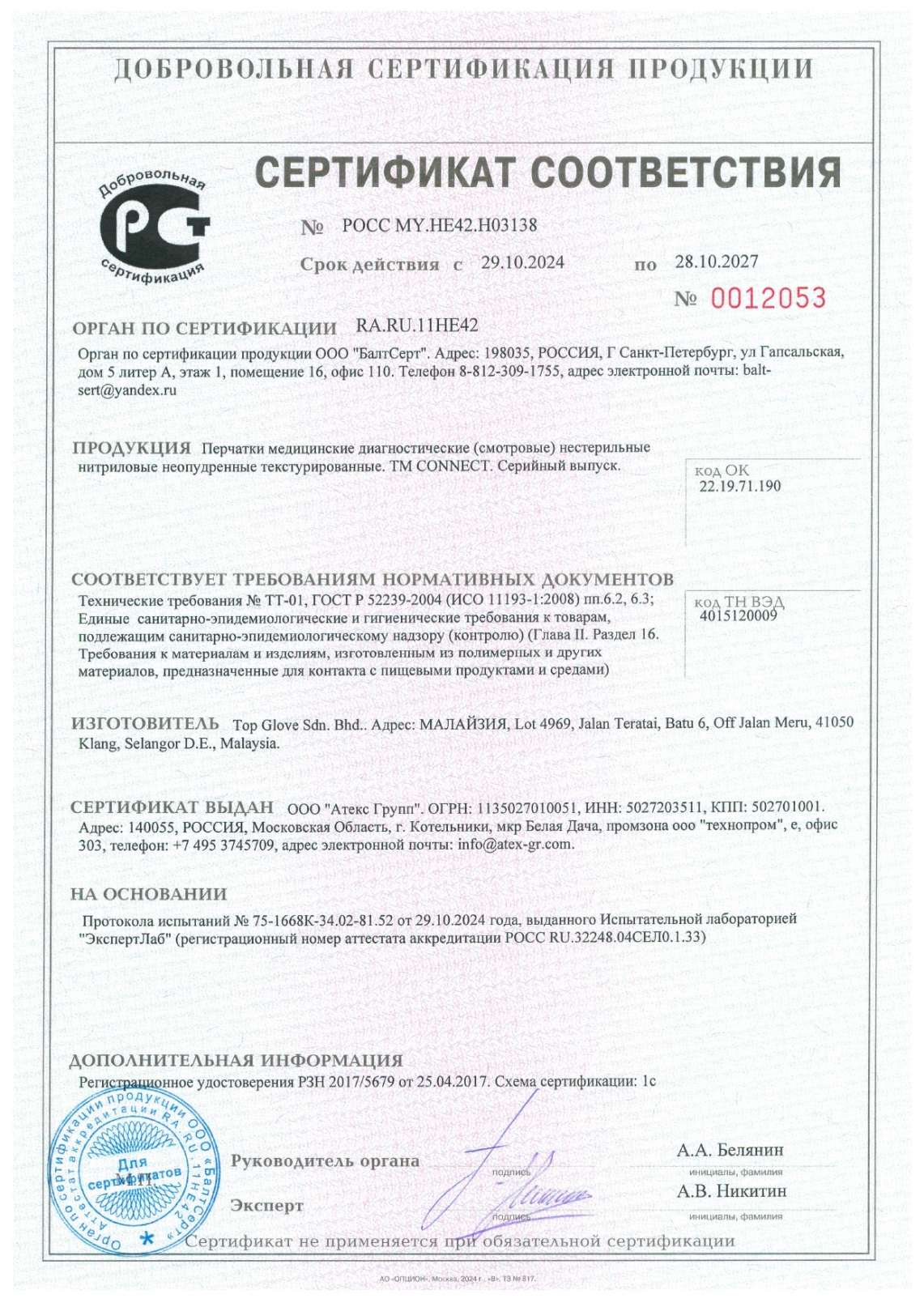 Перчатки нитриловые смотровые 100 пар (200 штук), размер 8-9, L (большой), голубые CONNECT Код товара: 631654 688 ₽ Купить Производитель:CONNECT Перчатки медицинские диагностические (смотровые) CONNECT подходят для проведения медицинских и косметических процедур, а также для использования в легкой промышленности и сфере общественного питания. Гипоаллергенные перчатки из 100% синтетического нитрила голубого цвета. Не содержат натуральный латекс и пудру, исключают риск аллергии у людей чувствительных к латексу. Комфортные и надежные. Защищают руки от проникновения бактерий и вирусов. Текстура в области пальцев для надежного захвата и контроля инструмента. Оптимальная толщина перчаток сохраняет высокую тактильную чувствительность. СФЕРЫ ПРИМЕНЕНИЯ: - Амбулаторный и поликлинический прием. - Клинико-диагностические манипуляции. - Стоматология. - Инфекционные больницы и отделения. - Лабораторные исследования и высокотехнологичные производства. - Промышленность (фармацевтическая, полиграфическая, электронная, легкая). - Общественное питание и пищевые производства. - Индустрия красоты, косметология, тату салоны. ПРАВИЛА ПРИМЕНЕНИЯ: - Предназначены для использования в качестве средства индивидуальной защиты рук. - Одноразовые. - Недопустимо использование при нарушении целостности перчаток. - Недопустимо использование перчаток несоответствующего размера. - Не рекомендуется длительное (более 2-х часов) ношение перчаток. - При частом и длительном ношении перчаток рекомендуется соответствующий уход за кожей рук. Предупреждения: - Возможна индивидуальная непереносимость материалов. - При появлении раздражения кожи прекратите использовать перчатки и обратитесь за консультацией к врачу. - Возможно проявление дерматитов и иных кожных раздражений как следствие неправильного ухода за кожей рук и жестких условий изоляции кожи рук от естественной вентиляции воздухом. - Не обеспечивают гарантированной защиты от проколов и порезов. Условия хранения: - Хранить в сухом месте при температуре 0-30 °С. - Избегать озона и прямого солнечного света. - Размер, номер партии и срок годности указаны на упаковке. Медицинское изделие зарегистрировано для использования в РФ. ГОСТ Р 52239-2004.Производство: КитайМатериал: нитрилРазмер перчаток: 8-9 (L)Серия: CONNECT нитрилТип: смотровыеНеопудренные: даТип поверхности: текстурированные на пальцахПовышенная чувствительность: даХлоринация: даФорма: плоскаяСоответствует требованиям ГОСТа: ГОСТ Р 52239-2004Количество в комплекте: 100 парШирина ладони: 106 ммЦвет: голубойВид упаковки: картонная коробкаВес: 772 грРазмер упаковки: 7.2 × 22 × 13.2 смОбъём: 0.0023 м3Промежуточная упаковка: 10 штТранспортная упаковка: 10 штШтрих-код: 4610017754825 Сертификат-1.jpg Сертификат-2.jpg