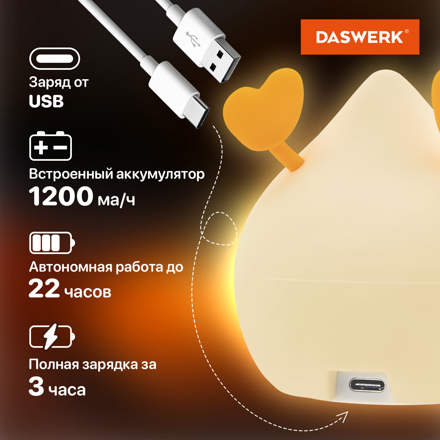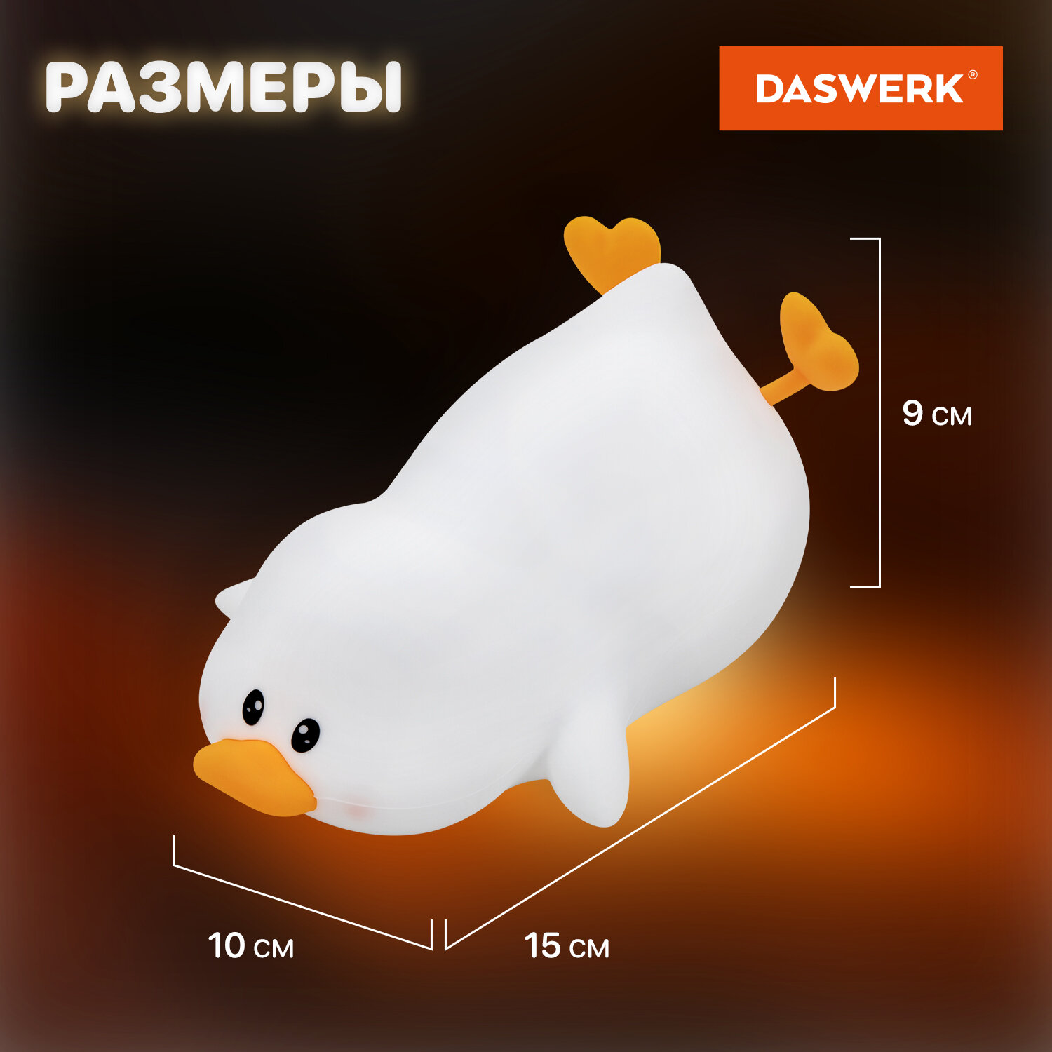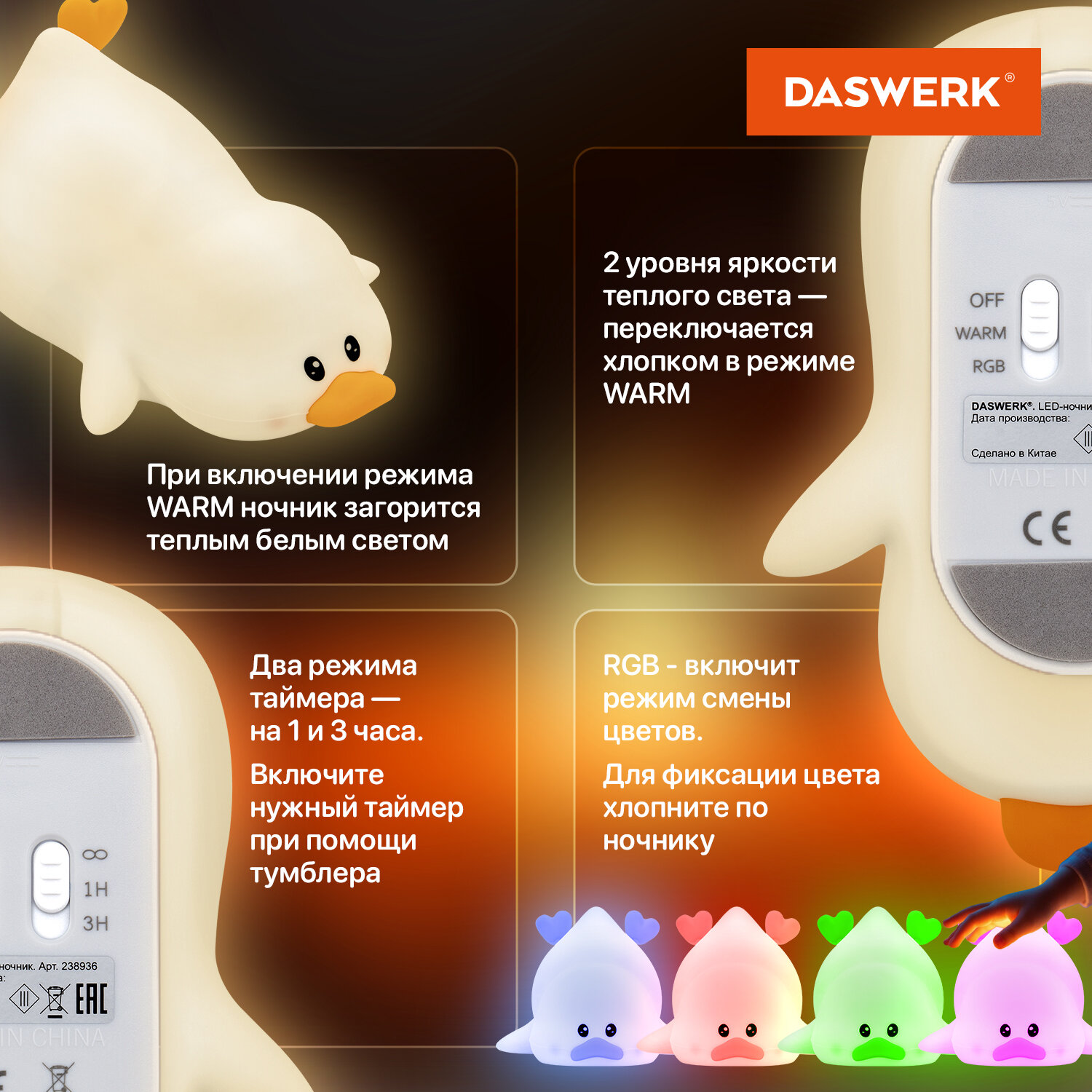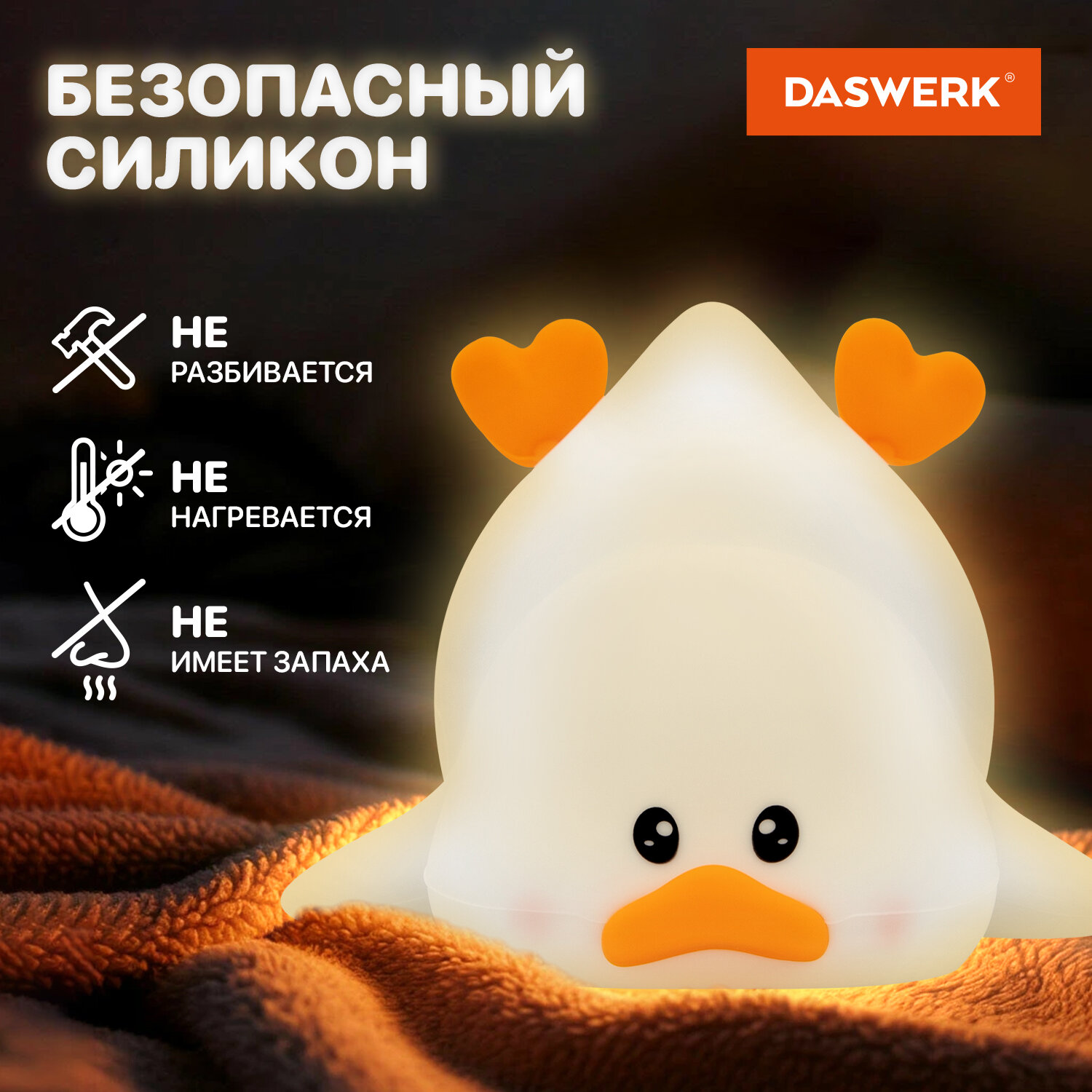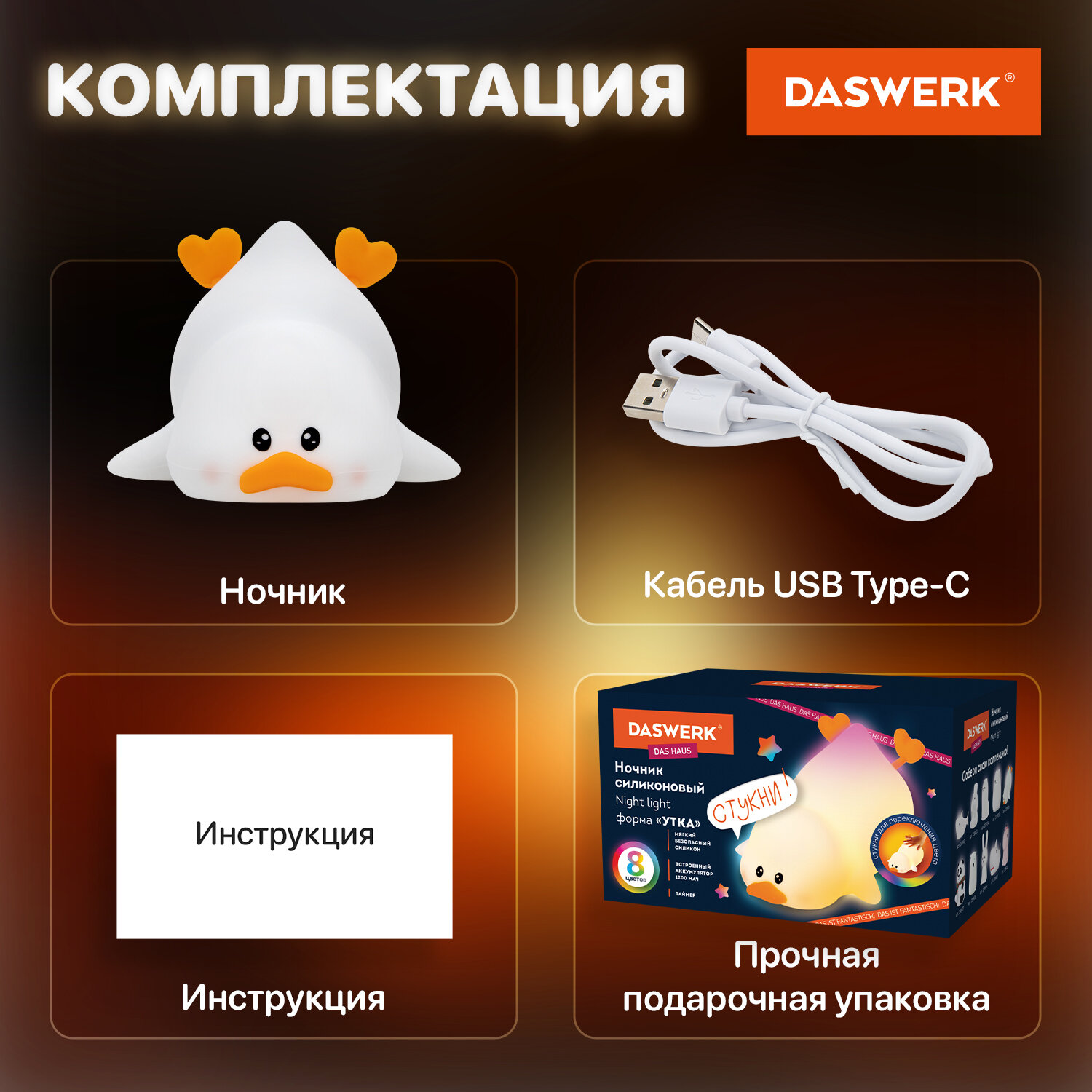Ночник силиконовый LED "Утка" 101x150x85 мм, белый свет/RGB, таймер, изменение уровней яркости, USB, аккум.1200 мАч DASWERK (ДАСВЕРК) Код товара: 238936 708,06 ₽ Купить Производитель:DASWERK Силиконовый ночник DASWERK предназначен для мягкого освещения пространства. Эта милая утка станет не только забавным элементом декора, но и поможет владельцу уснуть в комфортной обстановке. Силиконовый ночник DASWERK в очаровательном дизайне мягко рассеивает свет, создавая тёплую и спокойную атмосферу в любой комнате – будь то детская, спальня или гостиная. Корпус из приятного на ощупь силикона безопасен для самых маленьких, не нагревается и устойчив к деформации, поэтому его можно использовать даже как антистресс-игрушку. Внизу ночника расположены два тумблера. С их помощью можно менять яркость ночника, переводить его в режим таймера, а также в RGB-режим. Если легко стукнуть по ночнику в этом режиме, он поменяет цвет. Встроенный аккумулятор обеспечит автономную работу до 22 часов.Производство: КитайПитание: аккумуляторТаймер включения/отключения: даРегулировка яркости: даПереключение режимов света: даЦвет корпуса: белый матовыйМатериал корпуса: силиконДизайн: УткаСерия: DAS HAUSИсточник света: светодиодыМощность: 3.5 ВтВысота: 10.1 смШирина: 8.5 смГлубина: 15 смУпаковка: колорбоксВес: 259 грРазмер упаковки: 9 × 15.6 × 10.6 смОбъём: 0.0019 м3Промежуточная упаковка: 30 штТранспортная упаковка: 30 штШтрих-код: 4606224500270 Файлы Сертификат-1.jpg Сертификат-2.jpg Сертификат-3.jpg Сертификат-4.jpg Сертификат-5.jpg