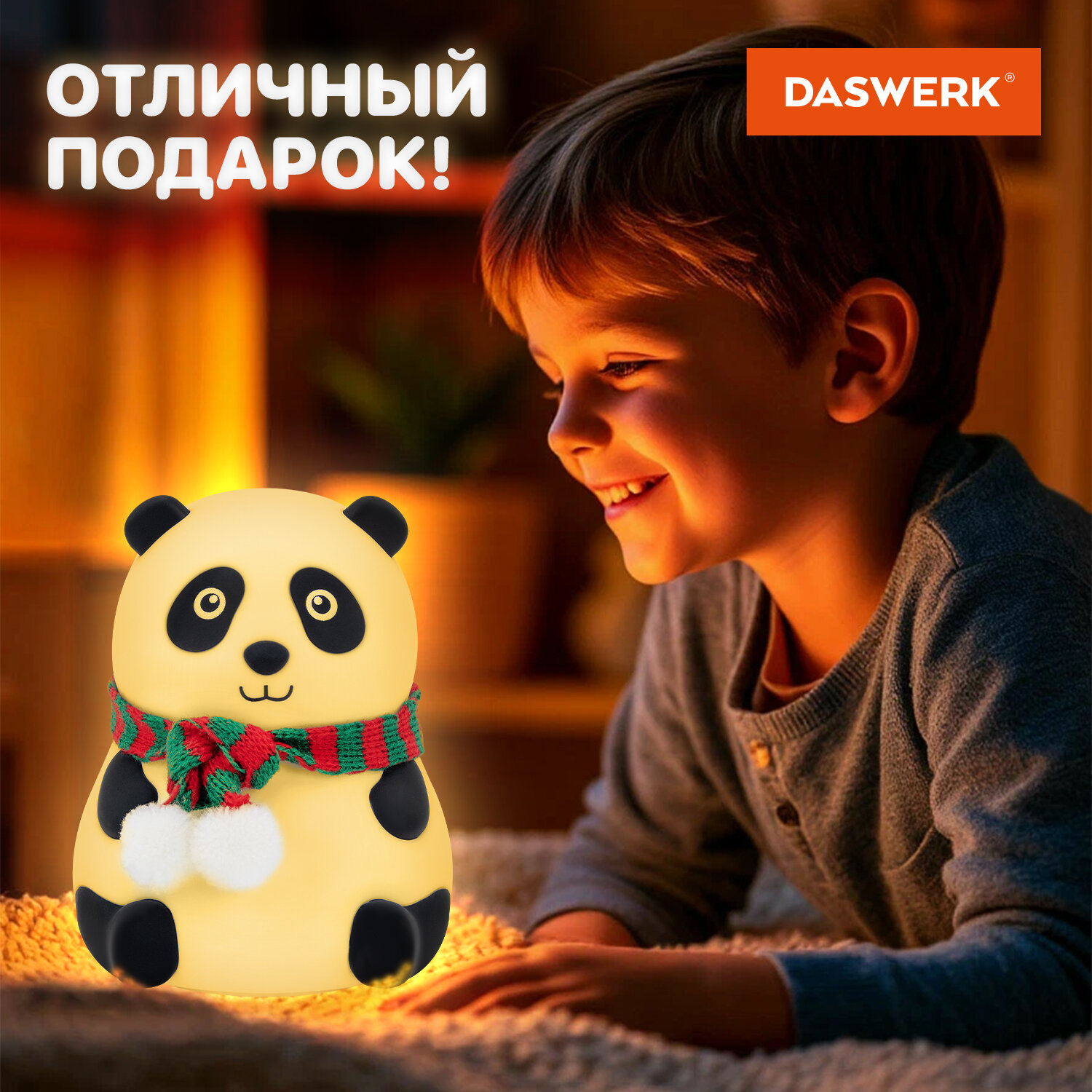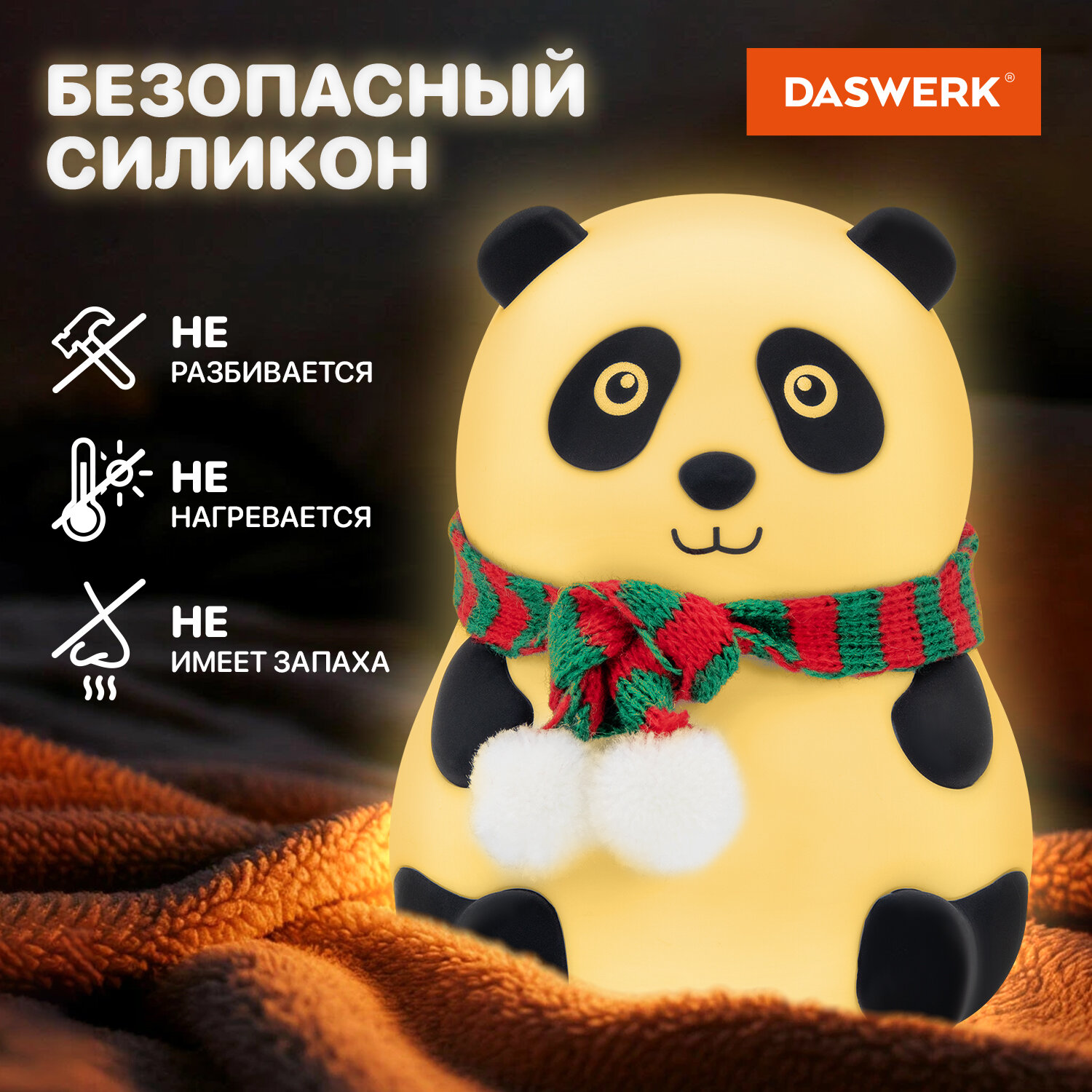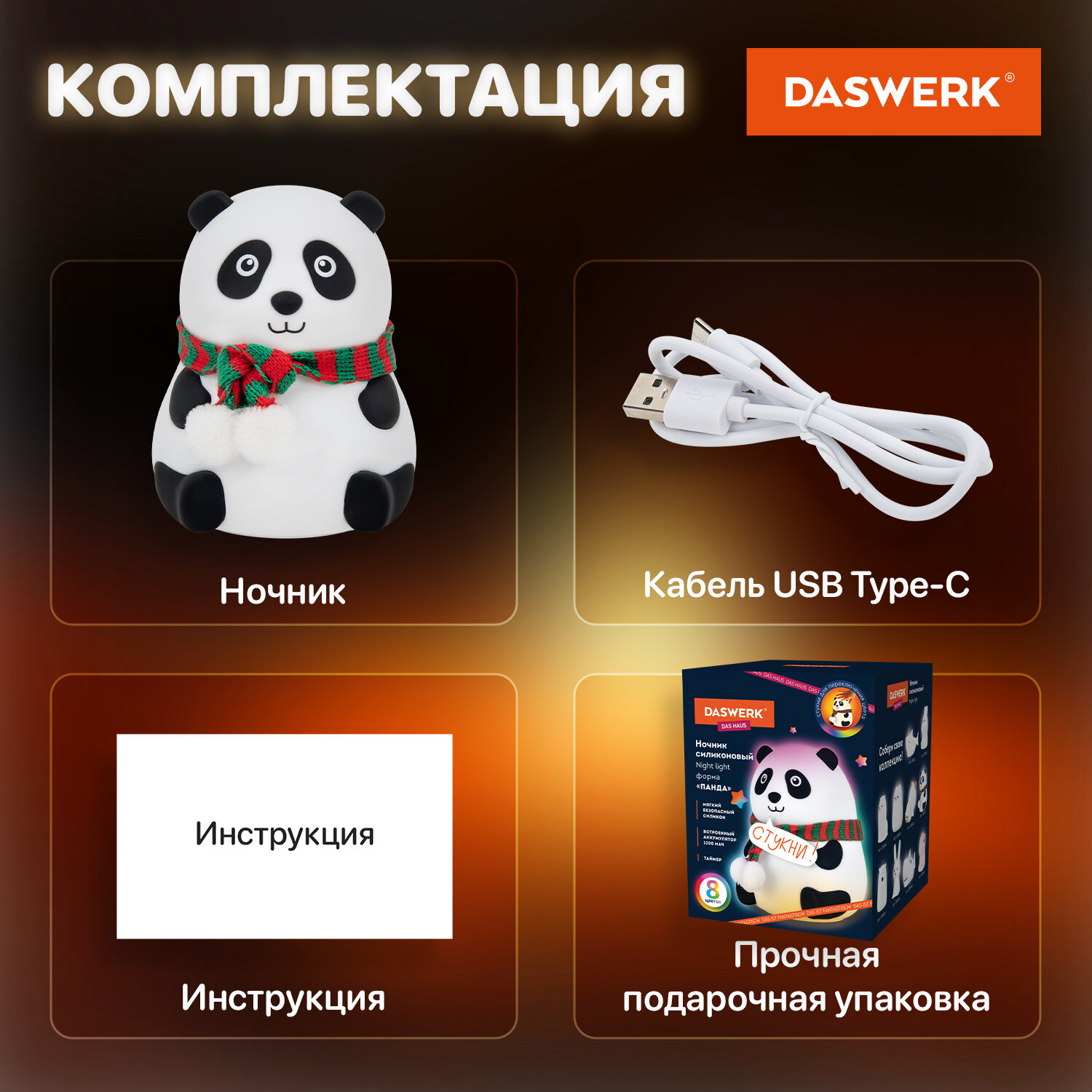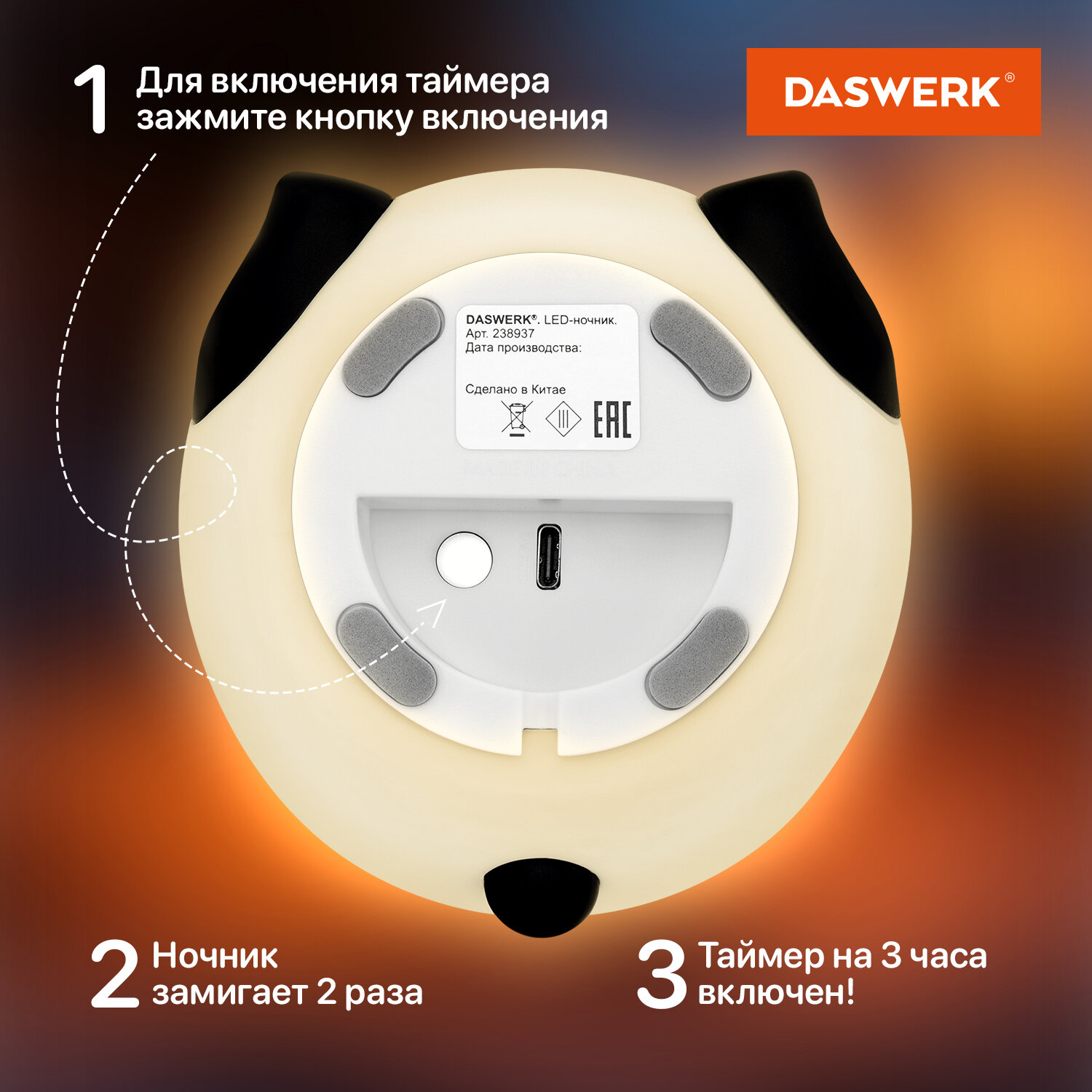 Ночник силиконовый LED "Панда" 106x112x136 мм, белый свет/RGB, таймер, USB, аккумулятор 1200 мАч, DASWERK (ДАСВЕРК) Код товара: 238937 770,16 ₽ Купить Производитель:DASWERK Силиконовый ночник DASWERK предназначен для мягкого освещения пространства. Эта милая панда станет не только забавным элементом декора, но и поможет владельцу уснуть в комфортной обстановке. Силиконовый ночник DASWERK в очаровательном дизайне мягко рассеивает свет, создавая тёплую и спокойную атмосферу в любой комнате – будь то детская, спальня или гостиная. Корпус из приятного на ощупь силикона безопасен для самых маленьких, не нагревается и устойчив к деформации, поэтому его можно использовать даже как антистресс-игрушку. Если легко стукнуть по ночнику, он поменяет цвет. Встроенный аккумулятор обеспечивает автономную работу до 10 часов.Производство: КитайПитание: аккумуляторТаймер включения/отключения: даПереключение режимов света: даЦвет корпуса: белый матовыйМатериал корпуса: силиконДизайн: ПандаСерия: DAS HAUSИсточник света: светодиодыМощность: 3 ВтВысота: 13.6 смШирина: 11.2 смГлубина: 10.6 смУпаковка: колорбоксВес: 321 грРазмер упаковки: 11.1 × 14 × 11.8 смОбъём: 0.0022 м3Промежуточная упаковка: 30 штТранспортная упаковка: 30 штШтрих-код: 4606224500287 Файлы Сертификат-1.jpg Сертификат-2.jpg Сертификат-3.jpg Сертификат-4.jpg Сертификат-5.jpg