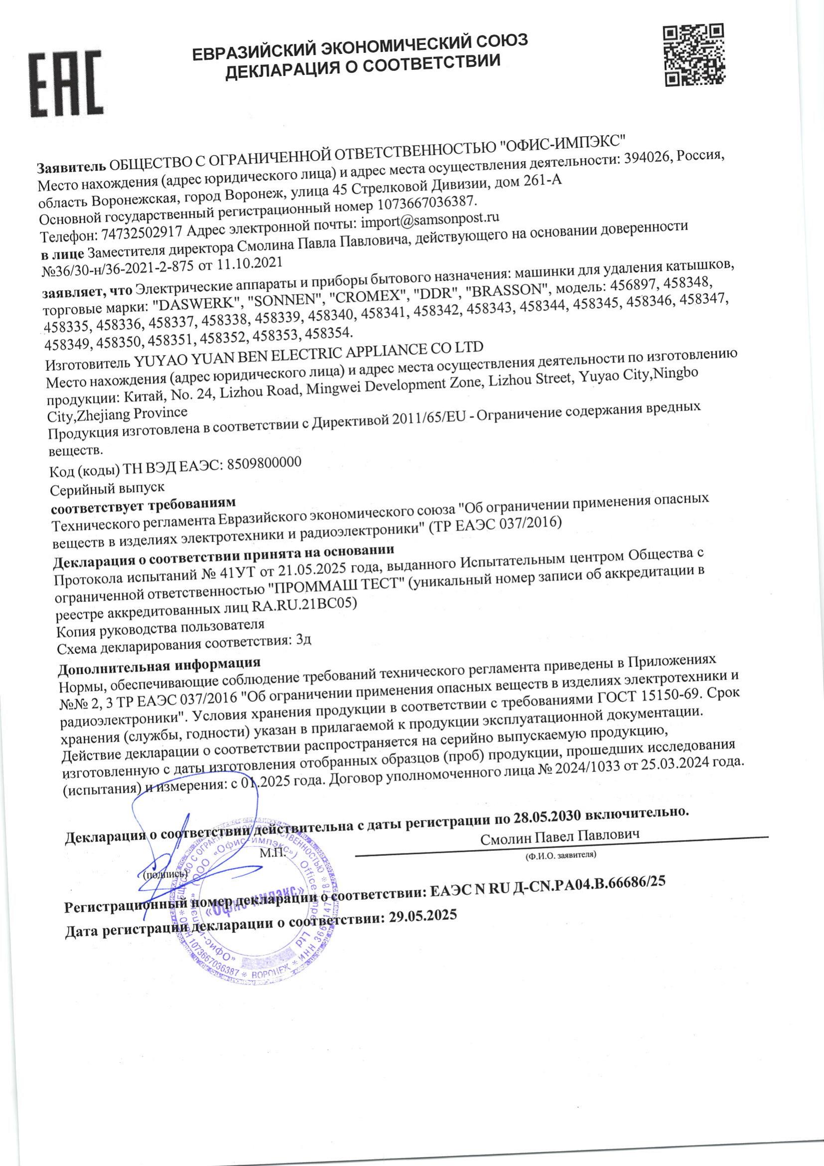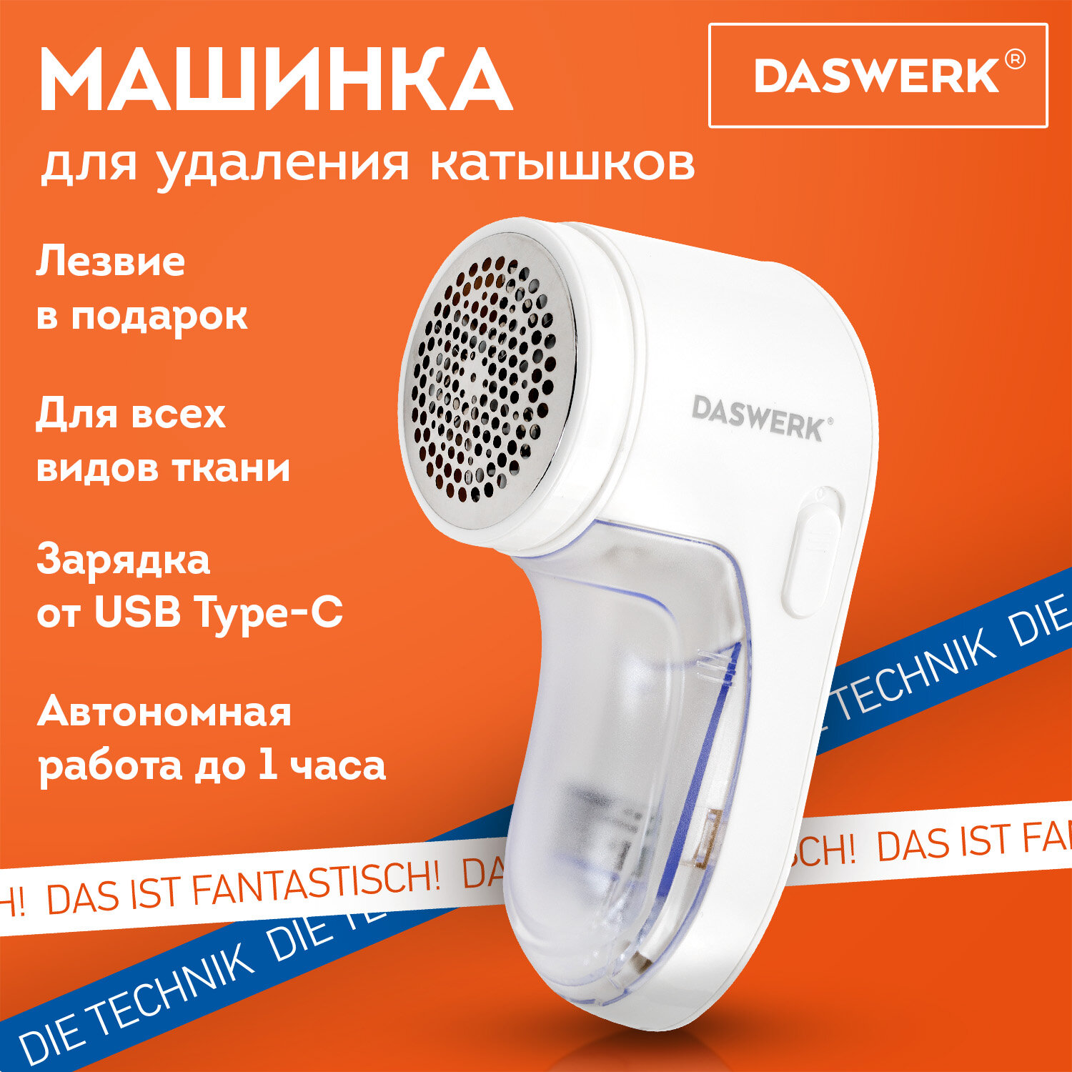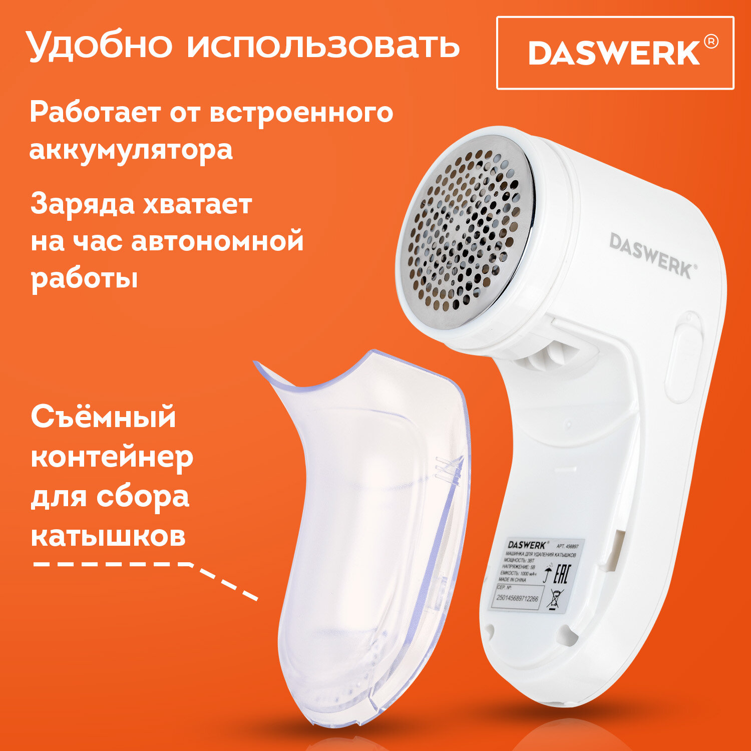 Машинка для удаления катышков аккумуляторная, комплект запасных лезвий в ПОДАРОК, DASWERK (ДАСВЕРК) Код товара: 456897 403,3 ₽ Купить Производитель:DASWERK Машинка для удаления катышков DASWERK – простой и эффективный способ ухаживать за одеждой и придавать ей свежий вид парой движений! Компактный прибор оснащён защитной крышкой для лезвий. Подходит для всех типов тканей. Широкая рабочая поверхность диаметром 50 мм позволит быстро и эффективно удалить катышки, а полупрозрачный резервуар для катышков облегчает задачу ухода и помогает избежать переполнения ёмкости. Щёточка для чистки лезвий идёт в комплекте. Управление прибором осуществляется с помощью всего лишь одной кнопки. Лезвия вращаются со скоростью 7500 оборотов в минуту, позволяя быстро и эффективно обработать изделия. В комплект также входит дополнительное лезвие. Очиститель катышков работает от встроенного аккумулятора емкостью 1000 mAh, что позволит вам автономно пользоваться устройством до 1 часа. Благодаря этому машинку легко можно брать с собой в путешествия или на работу. Прибор лёгкий, эргономичная ручка удобно лежит в руке. Заряжается очиститель катышков быстро, для зарядки подходит шнур USB Type-C, который входит в комплект.Производство: КитайМеталлическая защитная решетка: даСъемный контейнер: даКоличество скоростей работы: 1Комплектация: кабель MicroUSB, машинка для удаления катышков, руководство пользователя, щеточка для очистки лезвийМатериал корпуса: ABS-пластикПитание: встроенный аккумуляторСерия: DAS HAUSЦвет: белыйВес: 220 грРазмер упаковки: 6.7 × 15 × 7.5 смОбъём: 0.001 м3Промежуточная упаковка: 80 штТранспортная упаковка: 80 штШтрих-код: 4606224446905 Файлы Сертификат-1.jpg Сертификат-2.jpg Сертификат-3.jpg Сертификат-4.jpg