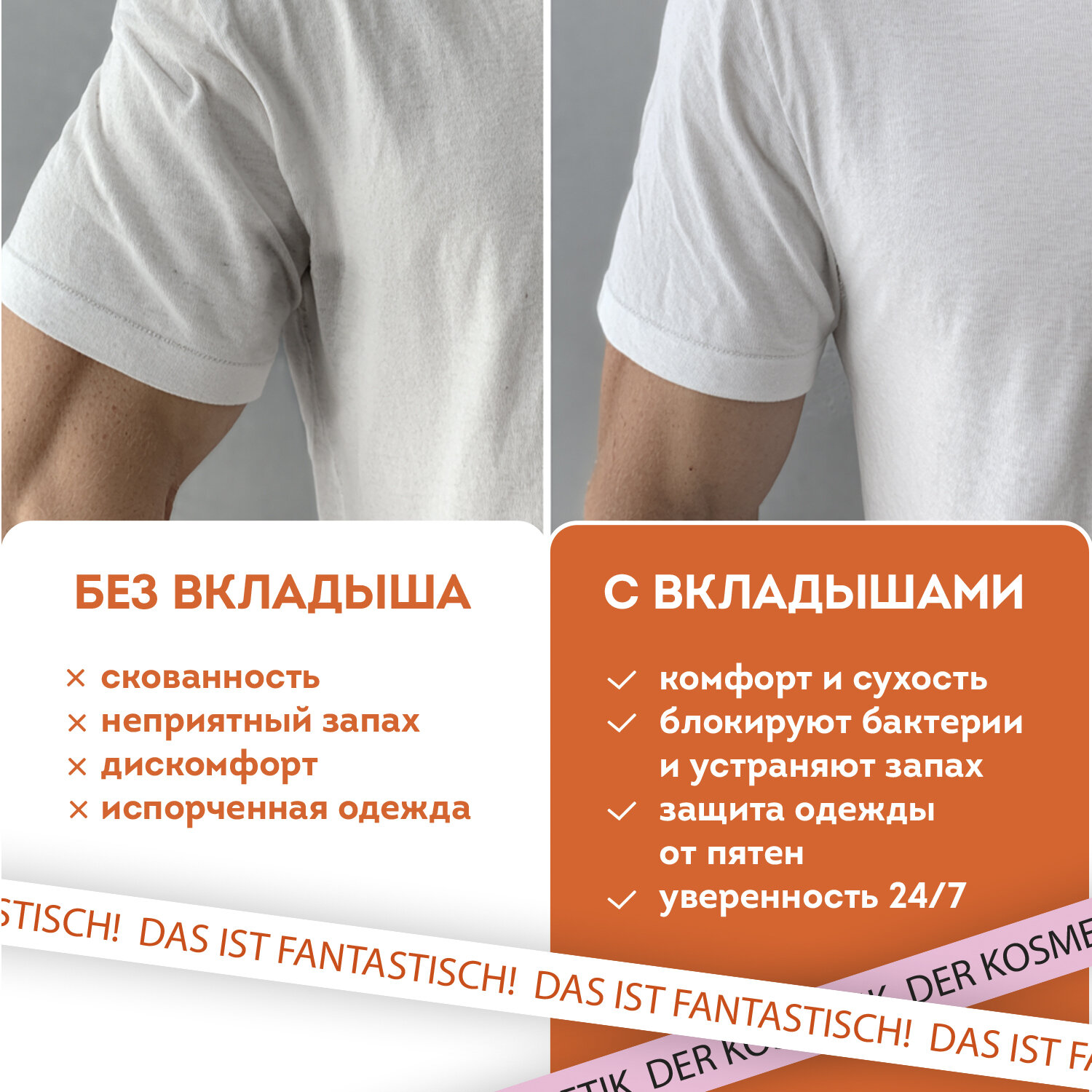 Вкладыши от пота, прокладки для подмышек, 24 шт., 3 цвета: белый / бежевый / черный, размер L, DASWERK (ДАСВЕРК) Код товара: 609987 195,13 ₽ Купить Производитель:DASWERK Вкладыши от пота DASWERK – незаметная защита от влаги и запаха на весь день! Ультратонкие, надежно фиксируются на одежде, подходят для мужчин и женщин, дарят уверенность и комфорт в любой ситуации. Вкладыши от пота DASWERK – незаменимый помощник для тех, кто ценит комфорт и уверенность в любой ситуации! Эти ультратонкие (всего 1 мм толщиной) одноразовые вкладыши станут вашим спасением от мокрых пятен и неприятного запаха. Благодаря самоклеящейся основе они прочно фиксируются на одежде и остаются совершенно незаметными даже под самой тонкой тканью – будь то легкая блузка, строгая рубашка или облегающая футболка. Вкладыши изготовлены из дышащих гипоаллергенных материалов, которые не вызывают раздражения и подходят даже для чувствительной кожи. Они отлично впитывают влагу, предотвращая появление пятен и белых следов от дезодоранта, а также нейтрализуют неприятные запахи. Идеальный выбор как для мужчин, так и для женщин. Каждая упаковка содержит 24 удобных вкладыша (12 пар), каждый из которых индивидуально упакован – вы легко сможете брать их с собой на работу, тренировку или важную встречу. С вкладышами от пота DASWERK вы забудете о дискомфорте и сможете носить любую одежду с удовольствием, оставаясь свежим и уверенным в себе. Размер – L. Цвета в наборе: классический белый, нейтральный бежевый, элегантный черный.Производство: КитайТип товара: вкладыши от потаЦвет: ассортиРазмер: 11х12 см (L)Количество в комплекте: 24 шт.Срок годности: 60 месВес: 80 грРазмер упаковки: 3.5 × 15.5 × 17.7 смОбъём: 0.0007 м3Промежуточная упаковка: 100 штТранспортная упаковка: 100 штШтрих-код: 4606224461069 Сертификат-1.jpg Сертификат-2.jpg