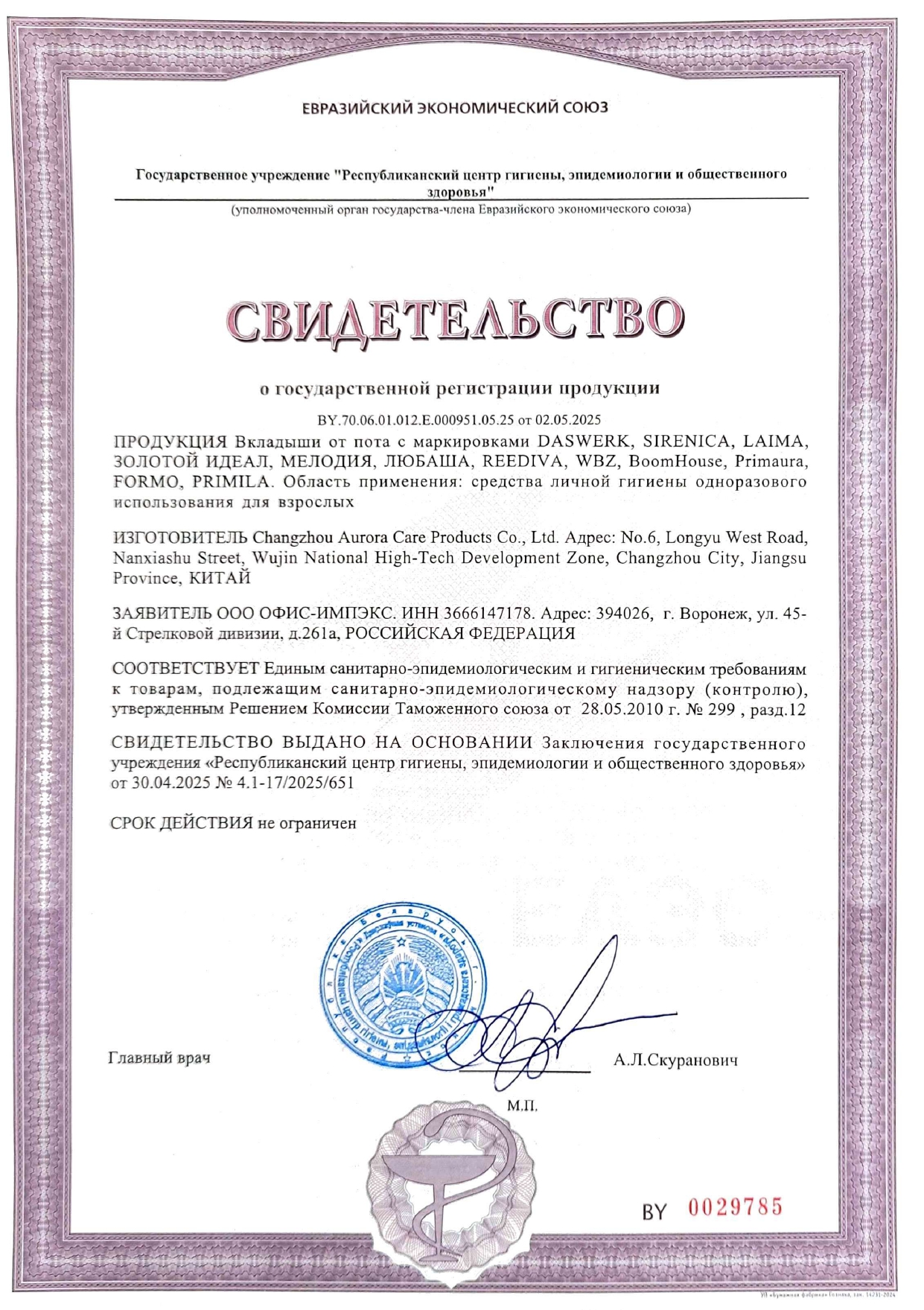 Вкладыши от пота, прокладки для подмышек КОМПЛЕКТ 120 шт. (5х24 шт.), белый, размер L, DASWERK (ДАСВЕРК) Код товара: 609988 721,27 ₽ Купить Производитель:DASWERK Вкладыши от пота DASWERK – незаметная защита от влаги и запаха на весь день! Ультратонкие, надежно фиксируются на одежде, подходят для мужчин и женщин, дарят уверенность и комфорт в любой ситуации. Вкладыши от пота DASWERK – незаменимый помощник для тех, кто ценит комфорт и уверенность в любой ситуации! Эти ультратонкие (всего 1 мм толщиной) одноразовые вкладыши станут вашим спасением от мокрых пятен и неприятного запаха. Благодаря самоклеящейся основе они прочно фиксируются на одежде и остаются совершенно незаметными даже под самой тонкой тканью – будь то легкая блузка, строгая рубашка или облегающая футболка. Вкладыши изготовлены из дышащих гипоаллергенных материалов, которые не вызывают раздражения и подходят даже для чувствительной кожи. Они отлично впитывают влагу, предотвращая появление пятен и белых следов от дезодоранта, а также нейтрализуют неприятные запахи. Идеальный выбор как для мужчин, так и для женщин. В комплекте 120 удобных вкладышей (60 пар), каждый из которых индивидуально упакован – вы легко сможете брать их с собой на работу, тренировку или важную встречу. С вкладышами от пота DASWERK вы забудете о дискомфорте и сможете носить любую одежду с удовольствием, оставаясь свежим и уверенным в себе. Размер – L. Классический белый цвет.Производство: КитайТип товара: вкладыши от потаЦвет: белыйРазмер: 11х12 см (L)Количество в комплекте: 120 шт.Срок годности: 60 месВес: 392 грРазмер упаковки: 9.7 × 28 × 18.8 смОбъём: 0.0037 м3Промежуточная упаковка: 20 штТранспортная упаковка: 20 штШтрих-код: 4606224461076 Сертификат-1.jpg Сертификат-2.jpg