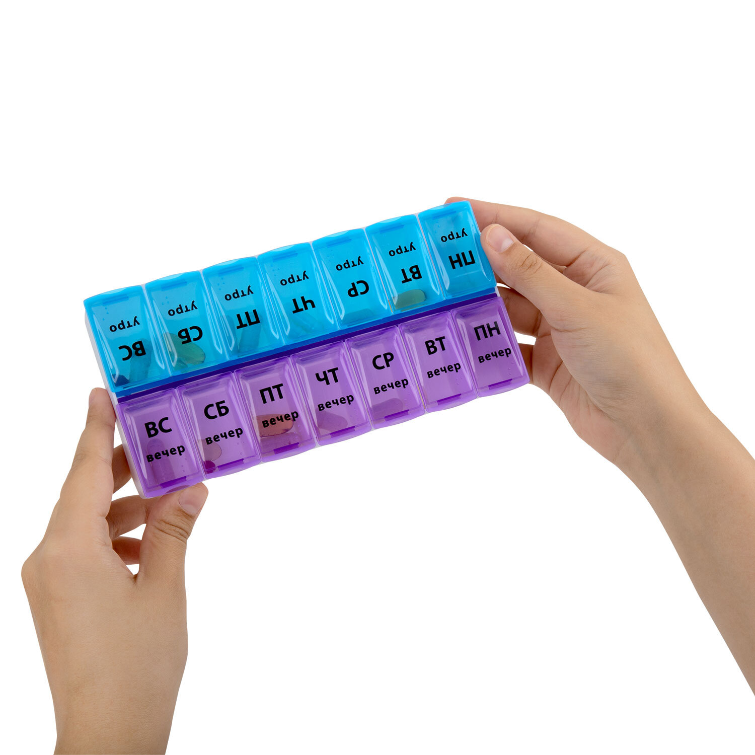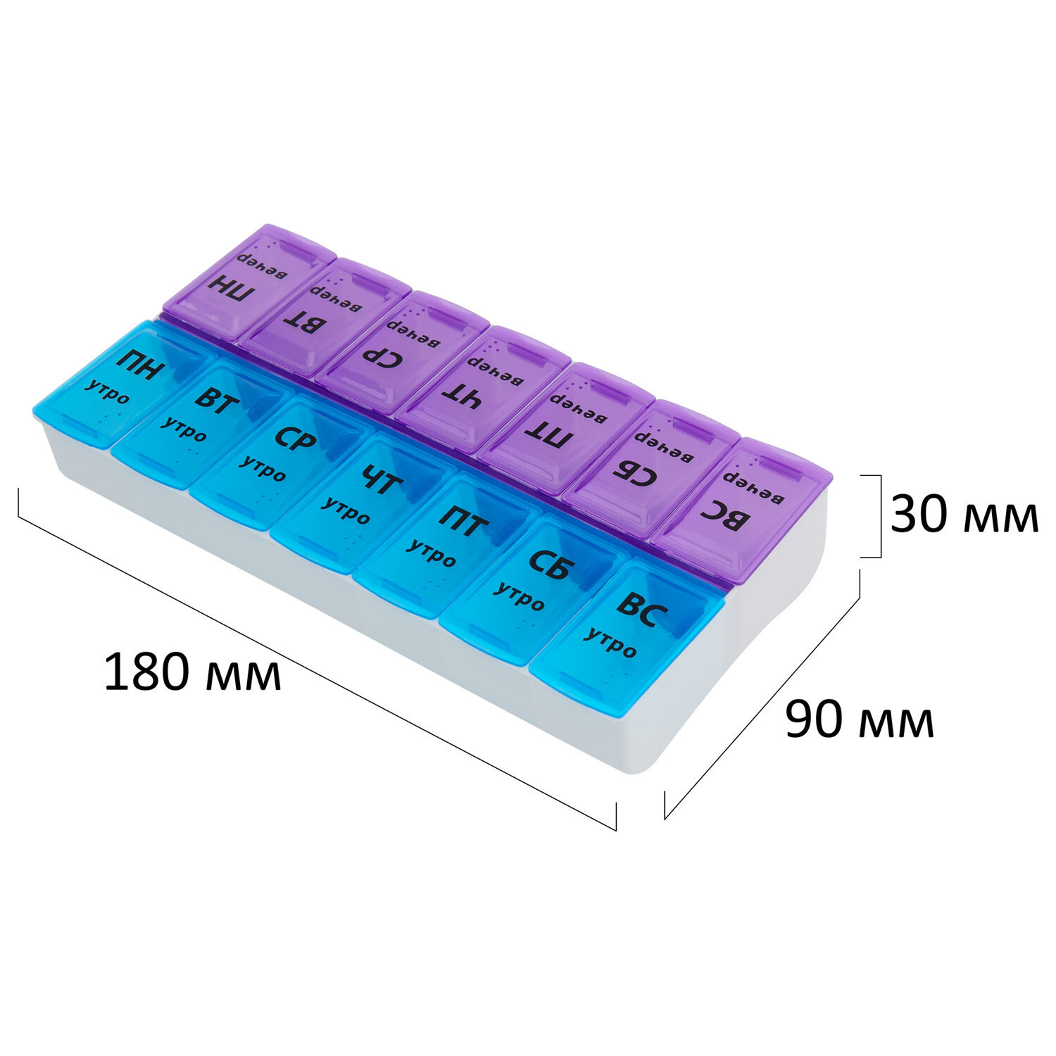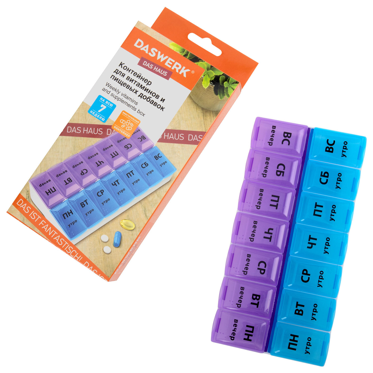 ТАБЛЕТНИЦА / Контейнер для лекарств и витаминов "7 дней/2 приема" БОЛЬШОЙ ОБЪЕМ, DASWERK (ДАСВЕРК) Код товара: 630844 160,06 ₽ Купить Производитель:DASWERK Таблетница DASWERK предназначена для надежного хранения лекарств, витаминов и пищевых добавок. Контейнер из легкого и прочного пластика гарантирует удобство и безопасность в использовании. Таблетница представляет собой контейнер с 14 вместительными отделениями, промаркированными по дням недели и суточному режиму приема: утро, вечер. Для удобства крышки утренних и вечерних отсеков отличаются цветом. Маркировка выполнена крупным шрифтом на русском языке. Надписи долговечны, они не сотрутся от длительного и частого использования. Каждое отделение плотно закрывается крышкой, надежно предотвращая рассыпание содержимого. Таблетница поместится в сумку или рюкзак, её можно брать с собой на работу или в дорогу. Перед первым использованием рекомендуется промыть контейнер теплой водой с мылом и тщательно высушить.Производство: КитайКоличество дней: 7Количество ячеек: 14 шт.Длина: 180 ммШирина: 90 ммВысота: 30 ммСерия: DAS HAUSМатериал: пластикВес: 114 грРазмер упаковки: 3.7 × 21.7 × 9.7 смОбъём: 0.0008 м3Промежуточная упаковка: 100 штТранспортная упаковка: 100 штШтрих-код: 4606224332284 Сертификат-1.jpg Сертификат-2.jpg Сертификат-3.jpg