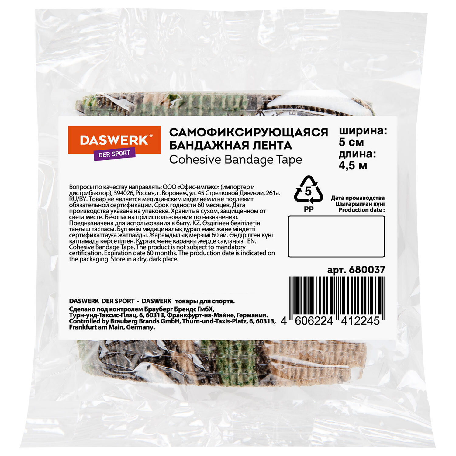 Камуфляжная лента защитная эластичная маскировочная когезивная, 4,5 м х 5 см, 1 рулон, DASWERK (ДАСВЕРК) Код товара: 680037 87,32 ₽ Купить Производитель:DASWERK Камуфляжная эластичная маскировочная лента DASWERK используется для маскировки оружия (оптических прицелов, ножей и т.д.), а также фонарей, ошейников и любых других предметов. Или просто для защиты кожи от повреждений. Когезивная эластичная тканная камуфляжная лента прекрасно обтекает любые поверхности. Улучшает удержание огнестрельного оружия и ножей в руке. Это очень важно при охоте в сложных условиях (скалы, густая растительность, непогода). Снижает «лязг» оружия, устраняет его блики. Обладает теплоизолирующими свойствами (охота при низких температурах). Предотвращает скольжение. Предохраняет предметы от внешних механических повреждений, грязи и влаги. Может быть использована как эластичный бандаж (бинт). Не теряет своих свойств в воде и при низких температурах. Камуфляжная лента изготовлена из материала содержащего латекс и не вызывает аллергических реакций. При необходимости камуфляжная лента легко снимается и может быть снова использована. Длина бинта – 4,5 м в максимально растянутом виде, ширина – 5 см.Производство: КитайТип: камуфляжная лентаРазмер: 4,5 м х 5 смКоличество в комплекте: 1 шт.Цвет: ARMYИндивидуальная упаковка: даСрок годности: 60 месВес: 26 грРазмер упаковки: 5.5 × 5.7 × 5.3 смОбъём: 0.0003 м3Промежуточная упаковка: 12 штТранспортная упаковка: 288 штШтрих-код: 4606224412245 Файлы Сертификат-1.jpg Сертификат-2.jpg Сертификат-3.jpg Сертификат-4.jpg Сертификат-5.jpg Сертификат-6.jpg Сертификат-7.jpg Сертификат-8.jpg Сертификат-9.jpg Сертификат-10.jpg Сертификат-11.jpg Сертификат-12.jpg Сертификат-13.jpg Сертификат-14.jpg Сертификат-15.jpg Сертификат-16.jpg Сертификат-17.jpg Сертификат-18.jpg Сертификат-19.jpg Сертификат-20.jpg Сертификат-21.jpg Сертификат-22.jpg Сертификат-23.jpg Сертификат-24.jpg Сертификат-25.jpg Сертификат-26.jpg