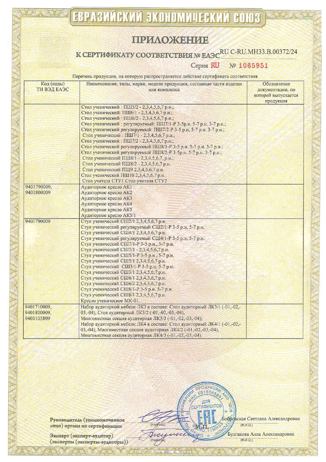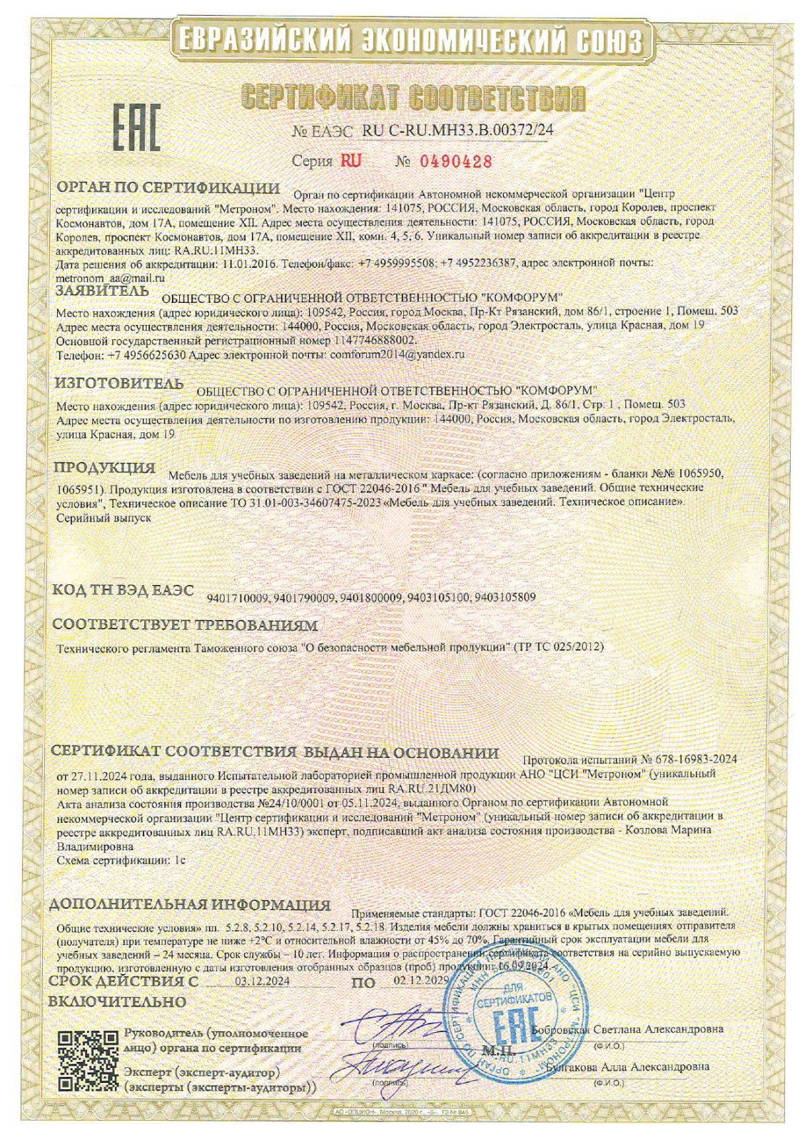 Стул ученический нерегулируемый, 380х420х840 мм, рост 6 (от 170 см), черный каркас Код товара: 530307 3 047,4 ₽ Купить Производитель:ДЕБЮТ Сиденье и спинка выполнены из формованного березового шпона с учетом требований эргономики, покрыты бесцветным лаком. Каркас изготовлен из труб прямоугольного сечения 20х20 мм и толщиной стенки 1,2 мм, окрашен износостойкой полимерной порошковой краской. Производство: РоссияРостовая группа: 6 (для детей ростом от 170 см)Материал каркаса: металлическая труба сечением 20х20 мм, толщина стенки 1,2 ммМатериал спинки, сиденья: фанера из березового шпонаМинимальная высота до сиденья: 463 ммМаксимальная высота до сиденья: 463 ммМинимальная высота стула: 837 ммМаксимальная высота стула: 837 ммШирина: 420 ммГлубина: 430 ммТип покрытия: полимерное порошковоеЦвет каркаса: черныйЦвет сиденья: фанера лакСоответствует требованиям ГОСТа: ГОСТ 22046-2002Тип поставки: в собранном видеКомплектация: инструкция по сборке, фурнитураВес: 4,24 кгРазмер упаковки: 84 × 48 × 43 смОбъём: 0.0591 м3Промежуточная упаковка: 5 штТранспортная упаковка: 5 шт Файлы Приложение-1.pdf Приложение-2.pdf Сертификат-1.jpg Сертификат-2.jpg Сертификат-3.jpg Сертификат-4.jpg Сертификат-5.jpg