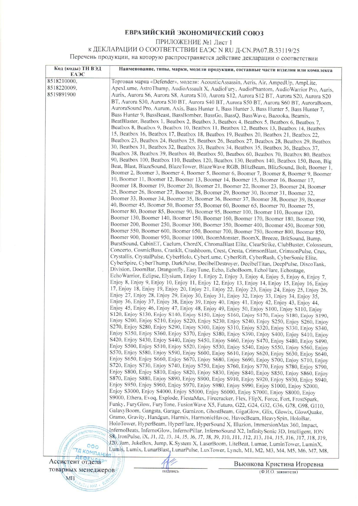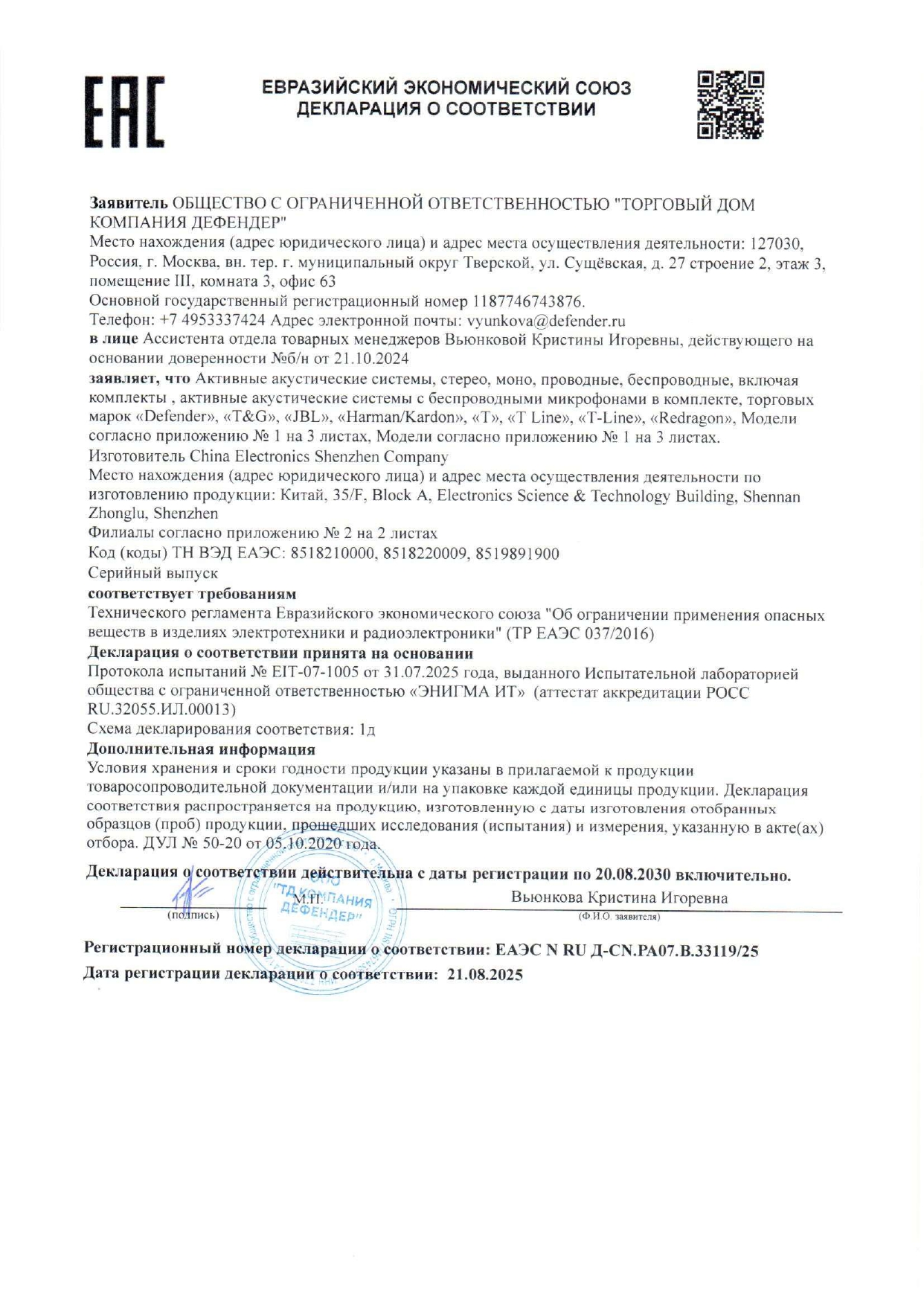 Колонка портативная DEFENDER Enjoy S1000, 2.0, 20 Вт, bluetooth, microUSB, черная Код товара: 513435 2 360,27 ₽ Купить Производитель:DEFENDER Defender Enjoy S1000 – отличная беспроводная колонка, которая сумеет привлечь внимание многих покупателей, особенно тех, кто ищет для себя недорогое и в то же время качественное решение. Компактная беспроводная колонка отлично подойдет для пользователей, которые ведут активный образ жизни. Благодаря своим небольшим размерам, ее легко можно носить в своем рюкзаке. Корпус выполнен из пластика. Дизайн устройства сумеет привлечь внимание большинство любителей музыки. Defender S1000 получил под свое управление аккумулятор мощностью 2000 мАч. Полной зарядки хватает приблизительно на 4 часа работы. Для подключения к мобильному устройству используется интерфейс Bluetooth 4.2, либо 3.5 мм разъем. Дальность беспроводной связи составляет около 10 метров, при условии, что между подключенным устройством и колонкой не будет никаких преград. Встроенный микрофон не показывает идеальных результатов в работе, однако с близкого расстояния вы вполне сможете ответить на звонок и пообщаться со своими друзьями.Вся информация на сайте о товарах носит справочный характер и не является публичной офертой в соответствии с пунктом 2 статьи 437 ГК РФ. Производитель оставляет за собой право изменять характеристики товара, его внешний вид и комплектность без предварительного уведомления продавца.Производство: КитайФормат акустической системы: 2Мощность: 20 ВтДиапазон частот: 60-20000 ГцБеспроводной интерфейс: BluetoothРегулировка громкости: даПульт дистанционного управления: нетМатериал корпуса: пластикВид электропитания: microUSB/встроенный аккумулятор.Основной цвет корпуса: черныйДополнительный цвет корпуса: нетВес: 590 гСерия: DEFENDER EnjoyМодель: Enjoy S1000Размер упаковки: 8.9 × 19.5 × 11.6 смОбъём: 0.0024 м3Промежуточная упаковка: 20 штТранспортная упаковка: 20 штШтрих-код: 4714033656887 Файлы Приложение-1.pdf Сертификат-1.jpg Сертификат-2.jpg Сертификат-3.jpg Сертификат-4.jpg Сертификат-5.jpg Сертификат-6.jpg Сертификат-7.jpg Сертификат-8.jpg Сертификат-9.jpg Сертификат-10.jpg Сертификат-11.jpg Сертификат-12.jpg Сертификат-13.jpg Сертификат-14.jpg Сертификат-15.jpg Сертификат-16.jpg Сертификат-17.jpg Сертификат-18.jpg Сертификат-19.jpg Сертификат-20.jpg Сертификат-21.jpg Сертификат-22.jpg Сертификат-23.jpg Сертификат-24.jpg