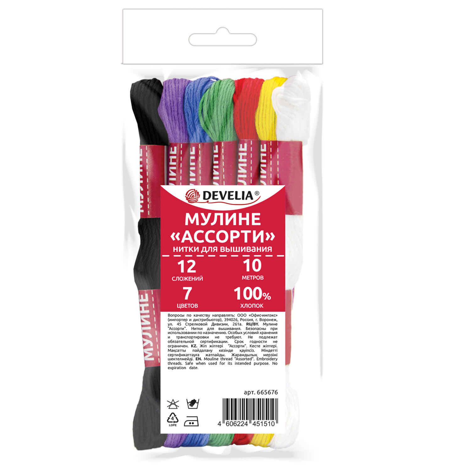 Набор ниток мулине DEVELIA состоит из 7 мотков ниток стандартных цветов в 12 сложений в намотке по 10 метров. Поставляются в прозрачном полипропиленовом пакете. Хлопковые мулине – самый распространенный и популярный вид ниток для вышивания. Является самым устойчивым к воздействию химических веществ и времени. У ниток мулине DEVELIA стойкая окраска, они не линяют даже при стирке в очень горячей воде. Они шелковистые и прочные. Картины, вышитые этими нитками, можно смело стирать, не опасаясь, что нитки полиняют. Вышивать нитками DEVELIA комфортно, они ровно ложатся, не путаются и блестят. В работах с большим количеством цветов нитки мулине обеспечивают оптимальную передачу цвета. Нитки легко проходят сквозь ткань, не пушатся и не теряют блеска. Особенностью является отсутствие скрутки между нитями, что позволяет легко разделять их на любую толщину. Помимо вышивки крестиком и гладью, мулине может быть использовано в поделках и плетении. Метод завязывания узелков в определенной последовательности позволяет создать яркие красочные браслеты. С помощью набора ниток мулине DEVELIA рукодельницы смогут создать уникальные изделия и предметы интерьера, картины, панно вышитые или сплетенные, а также с помощью вышитых узоров и рисунков придать вещам неповторимость. Цвета ниток в наборе могут незначительно отличаться от представленных на фото.
