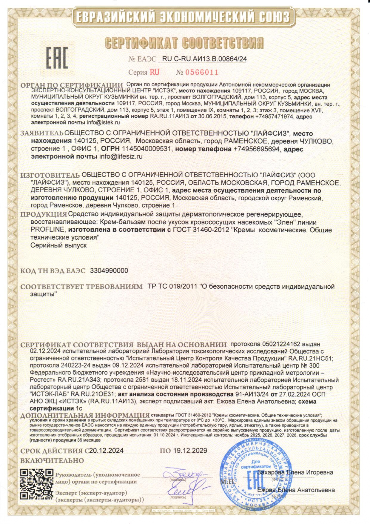 Крем-бальзам для кожи защитный 100 мл, ЭЛЕН, после укусов комаров и кровососущих насекомых Код товара: 608832 97,89 ₽ Купить Производитель:ЭЛЕН Крем-бальзам "ЭЛЕН" предназначен для снятия воспаления и восстановления кожи после укусов насекомых, контакта с крапивой, солнечных и других термических ожогов. Оказывает охлаждающее и успокаивающее действие на кожу, снимает раздражение, покраснения и зуд. Средство обладает противовоспалительным, увлажняющим и регенерирующим действием. Крем-бальзам создан на основе Масла семян подсолнечника. В состав крема входят: Масло семян подсолнечника – оказывает смягчающее, питательное и тонизирующее действие. Замедляет процесс старения кожи. Восстанавливает поврежденные клетки кожи, улучшает ее защитные функции. Провитамин В5 (D-Panthenol) – стимулирует регенерацию кожи, нормализует клеточный метаболизм и увеличивает прочность коллагеновых волокон. Аллантоин – способствует клеточной регенерации кожи, быстрому заживлению ссадин и трещин, снятию раздражения. Ментол – уменьшает отечность, тонизирует кожу, освежает и охлаждает, уменьшает раздражение и воспаление. Натуральные экстракты ромашки, календулы и алое вера — оказывают мощный противовоспалительный, восстанавливающий и антисептический эффект. Витамин Е – природный антиоксидант. Увлажняет и смягчает кожу, стимулирует процесс регенерации и восстановления кожи. Снимает раздражающий негативный эффект, вызванный воздействием агрессивной среды и низких температур. Крем легко наносится и быстро впитывается, не оставляет на коже ощущения липкости. Не содержит аллергенов, подходит для чувствительной кожи. Рекомендация по применению: нанести небольшое количество крем-бальзама на проблемные участки кожи. В случае необходимости процедуру повторить. Не допускать попадания на слизистые оболочки.Производство: РоссияФорма выпуска: крем-бальзамОбъем: 100 млТип ДСИЗ: восстановлениеНазначение: универсальныйВид средства: регенерирующееВид абразива: нетЭффект от использования: восстановлениеСерия: для снятия воспаленияСоответствует требованиям стандарта: ГОСТ 31460-2012, ТР ТС 019/2011Тип крышки: крышкаУпаковка: тубаСрок годности: 36 месВес: 106 грРазмер упаковки: 3.7 × 16.3 × 5.4 смОбъём: 0.0002 м3Промежуточная упаковка: 100 штТранспортная упаковка: 100 штШтрих-код: 4627182120218 Сертификат-1.jpg Сертификат-2.jpg Сертификат-3.jpg