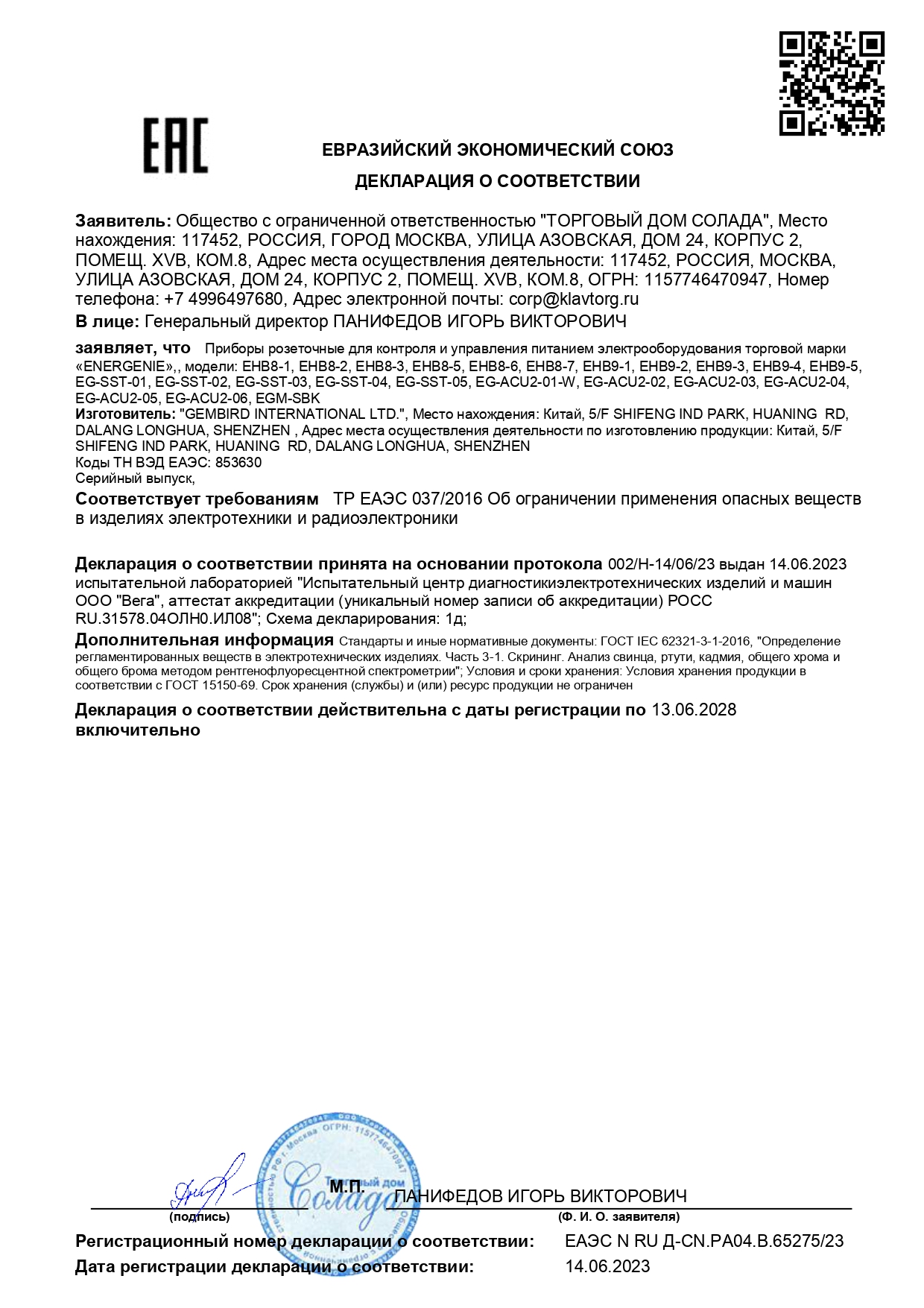 Таймер электрический ENERGENIE LCD-дисплей 2,3" белый Код товара: 514217 970,2 ₽ Купить Производитель:ENERGENIE С помощью электронного таймера ENERGENIE EG-SST-01 можно настроить автоматическое включение и выключение электроприборов по требуемому графику • Большой LCD-дисплей. • Десять отдельных таймеров. • Встроенный аккумулятор. • Защитные шторки в розетке. Вся информация на сайте о товарах носит справочный характер и не является публичной офертой в соответствии с пунктом 2 статьи 437 ГК РФ. Производитель оставляет за собой право изменять характеристики товара, его внешний вид и комплектность без предварительного уведомления продавца.Производство: КитайТип устройства: таймерКоличество розеток: 1 шт.Длина шнура: 0 мМаксимальный ток нагрузки: 16 АСуммарная мощность нагрузки: 3680 ВтНоминальное напряжение: 230 ВНоминальная частота напряжения сети: 50 ГцНаличие заземления: даЗащитные шторки на розетках: даКлавиша выключателя на корпусе: даПодключение: к розеткам евростандартаСечение провода: 0 ммМатериал корпуса: пластикЦвет: белыйСерия: EGДлина: 135 ммШирина: 76 ммВысота: 59 ммВес: 0.15 кгРазмер упаковки: 6.6 × 14.5 × 8.1 смОбъём: 0.001 м3Промежуточная упаковка: 50 штТранспортная упаковка: 50 штШтрих-код: 8716309098823 Сертификат-1.jpg Сертификат-2.jpg Сертификат-3.jpg