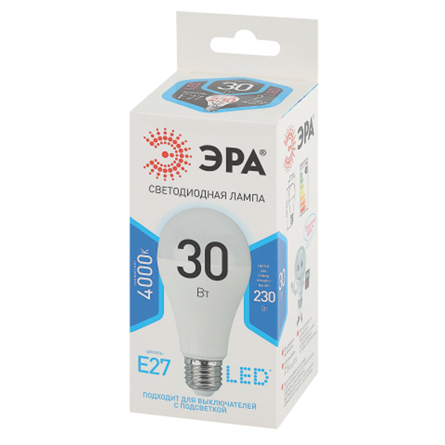 Лампа светодиодная ЭРА STD, 30 (230) Вт, цоколь E27, груша, нейтральный белый свет, 35000 ч., LED A65-30W-840-E27 Код товара: 457672 280,44 ₽ Купить Производитель:ЭРА Светодиодная лампа ЭРА серии "Стандарт" - современный, качественный и доступный источник света. Позволяет экономить до 90% электроэнергии по сравнению с лампой накаливания с аналогичным световым потоком. Светит ярким белым светом, который максимально приближен к естественному дневному. Идеальна для ежедневного применения в быту. Мгновенное включение. Ровное освещение. Можно использовать как с люстрами, так и со светильниками, в том числе настольными и бра.Производство: Китай Тип цоколя : E27Оттенок света: нейтральный белыйМощность: 30 ВтТип лампы: светодиоднаяТип колбы: грушаВид колбы: матоваяМинимальное рабочее напряжение: 170 ВМаксимальное рабочее напряжение: 265 ВМощность эквивалентной по световому потоку лампы накаливания: 230 ВтСветовой поток: 2400 ЛмЦветовая температура: 4000 КИндекс цветопередачи: 80 %Срок службы: 35000 ч.Высота (длина) лампы: 112 ммДиаметр лампы: 60 ммВес: 79 грРазмер упаковки: 6.7 × 16.9 × 6.3 смОбъём: 0.0007 м3Промежуточная упаковка: 10 штТранспортная упаковка: 100 штШтрих-код: 5056396208907 Файлы Сертификат-1.jpg Сертификат-2.jpg Сертификат-3.jpg Сертификат-4.jpg Сертификат-5.jpg