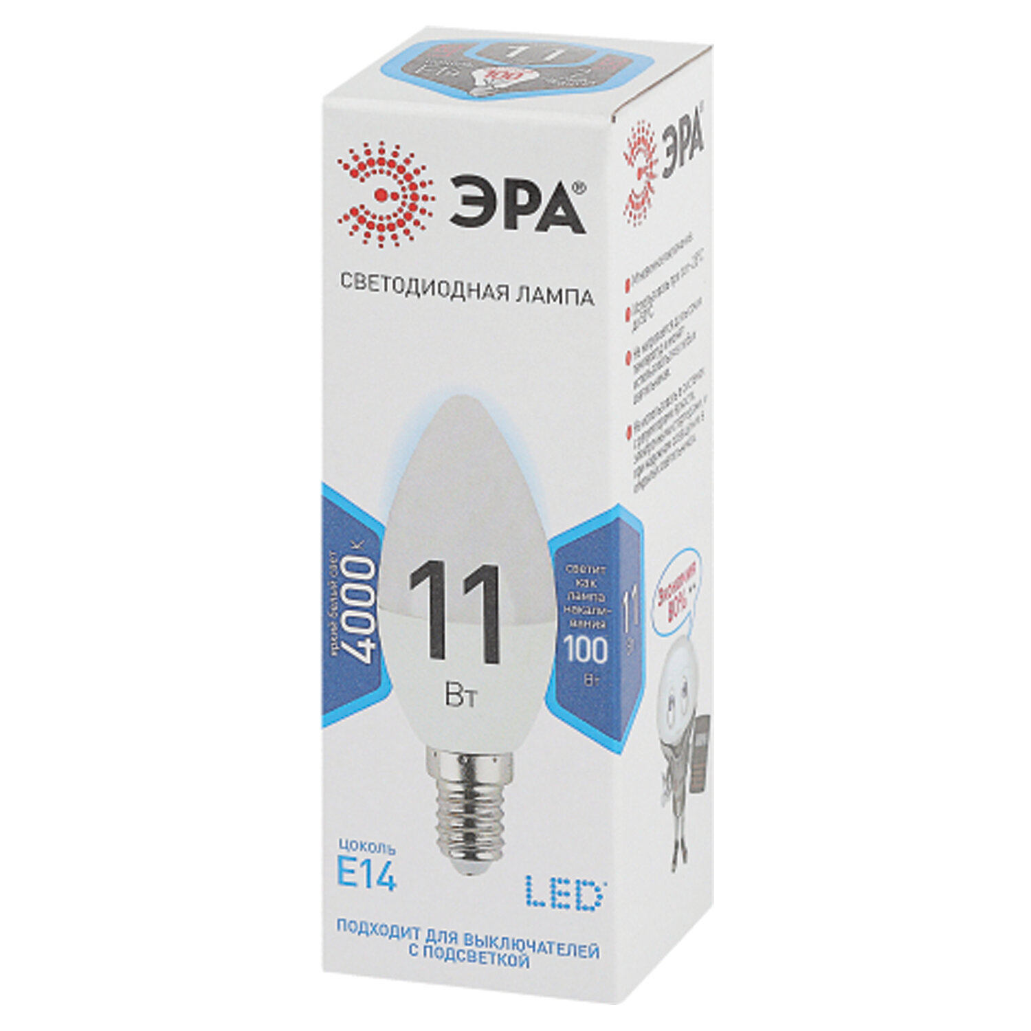 Лампа светодиодная ЭРА STD, 11 (100) Вт, цоколь E14, свеча, нейтральный белый свет, 35000 ч., LED B35-11W-840-E14 Код товара: 457673 122,41 ₽ Купить Производитель:ЭРА Эта светодиодная лампа ЭРА STD – современный, качественный и доступный источник света. Позволяет экономить до 90% электроэнергии по сравнению с лампой накаливания с аналогичным световым потоком. Светит ярким белым светом, который максимально приближен к естественному дневному. Идеальна для ежедневного применения в быту. Мгновенное включение. Ровное освещение. Можно использовать как с люстрами, так и со светильниками, в том числе настольными и бра.Производство: Китай Тип цоколя : E14Оттенок света: нейтральный белыйМощность: 11 ВтТип лампы: светодиоднаяТип колбы: свечеобразнаяВид колбы: матоваяМинимальное рабочее напряжение: 170 ВМаксимальное рабочее напряжение: 265 ВМощность эквивалентной по световому потоку лампы накаливания: 100 ВтСветовой поток: 880 ЛмЦветовая температура: 4000 КИндекс цветопередачи: 80 %Срок службы: 35000 ч.Высота (длина) лампы: 110 ммДиаметр лампы: 37 ммВес: 27 грРазмер упаковки: 3.8 × 13.7 × 3.8 смОбъём: 0.0002 м3Промежуточная упаковка: 10 штТранспортная упаковка: 100 штШтрих-код: 5056183732363 Файлы Сертификат-1.jpg Сертификат-2.jpg Сертификат-3.jpg Сертификат-4.jpg Сертификат-5.jpg