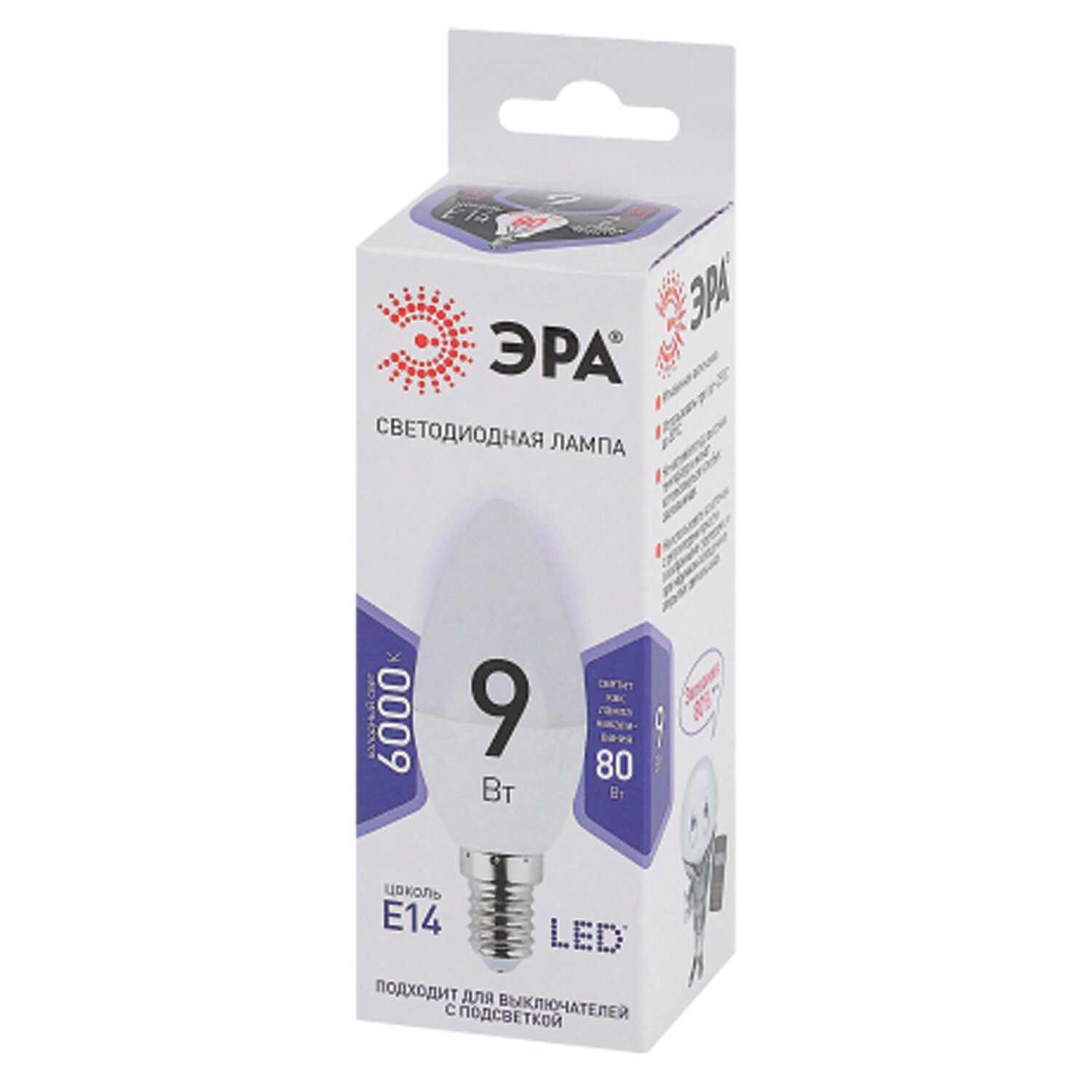 Лампа светодиодная ЭРА STD, 9 (80) Вт, цоколь E14, свеча, холодный белый свет, 35000 ч., LED B35-9W-860-E14 Код товара: 457680 111,3 ₽ Купить Производитель:ЭРА Экономичная светодиодная лампа ЭРА серии "Стандарт" с отличными характеристиками для установки в люстры и все типы бытовых светильников: потолочные, настольные, бра. Бережёт электроэнергию, ярко светит, имеет долгий срок службы. Цветовая температура - холодный белый свет. Такое освещение бодрит, повышает работоспособность. Этот современный источник света создаёт комфортное и безопасное для глаз освещение.Производство: Китай Тип цоколя : E14Оттенок света: холодный белыйМощность: 9 ВтТип лампы: светодиоднаяТип колбы: свечеобразнаяВид колбы: матоваяМинимальное рабочее напряжение: 170 ВМаксимальное рабочее напряжение: 265 ВМощность эквивалентной по световому потоку лампы накаливания: 80 ВтСветовой поток: 720 ЛмЦветовая температура: 6000 КИндекс цветопередачи: 80 %Срок службы: 35000 ч.Высота (длина) лампы: 100 ммДиаметр лампы: 37 ммВес: 34 грРазмер упаковки: 3.8 × 10.7 × 3.8 смОбъём: 0.0002 м3Промежуточная упаковка: 10 штТранспортная упаковка: 100 штШтрих-код: 5056183700348 Файлы Сертификат-1.jpg Сертификат-2.jpg Сертификат-3.jpg Сертификат-4.jpg Сертификат-5.jpg
