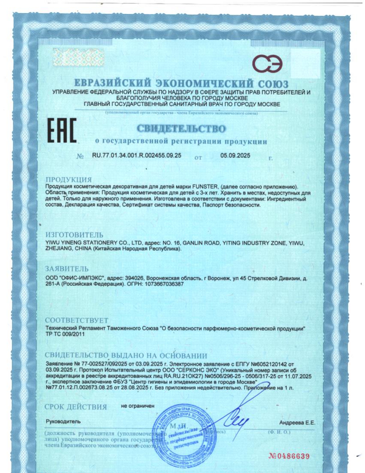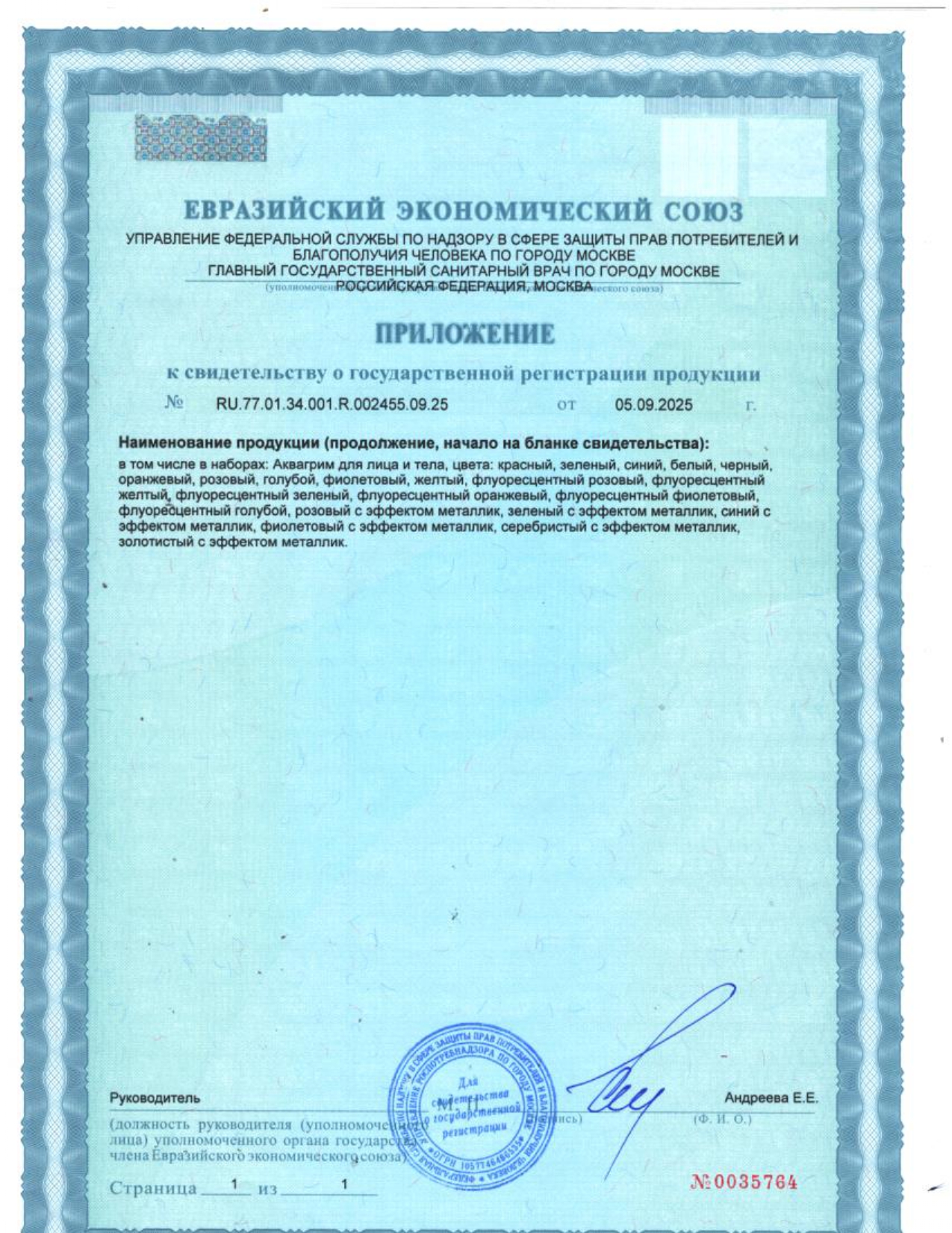 Аквагрим для лица и тела, 6 цветов МЕТАЛЛИК, FUNSTER (ФАНСТЕР), легко смываются Код товара: 192574 325,31 ₽ Купить Производитель:FUNSTER Аквагрим для лица и тела FUNSTER позволит ребёнку примерить на себя новые интересные образы и будет незаменим не только на празднике или карнавале, но и в повседневных играх. Аквагрим имеет восковую основу и абсолютно безвреден при контакте с детской кожей лица и тела. Отвечает требованиям EC к косметическим продуктам. Мелки прошли дерматологическое тестирование. Краски легко смываются. Поставляется в картонной коробке с европодвесом. 6 ярких и насыщенных цветов с эффектом металлик: розовый металлик, золотистый, зеленый металлик, синий металлик, серебристый, фиолетовый металлик. С помощью аквагрима можно изобразить какое-нибудь животное или узор на лице и теле вашего ребенка. Подобные рисунки можно использовать для тематических праздников, например, преобразить всех малышей в персонажей известного мультфильма. Аквагрим стал незаменимым атрибутом практически для любого детского праздника.Производство: КитайТип товара: краски для гримаКоличество цветов в наборе: 6 шт.Основа: восковаяБезопасность: отвечают требованиям EC к косметическим продуктам, прошли дерматологическое тестированиеСпецэффект: металликЦвет: зеленый металлик, золотистый, розовый металлик, серебристый, синий металлик, фиолетовый металликУпаковка: картонная коробка с европодвесомСрок годности: 48 месВес: 137 грРазмер упаковки: 2.6 × 14.7 × 15.5 смОбъём: 0.0008 м3Промежуточная упаковка: 12 штТранспортная упаковка: 96 штШтрих-код: 4606224467405 Сертификат-1.jpg Сертификат-2.jpg Сертификат-3.jpg