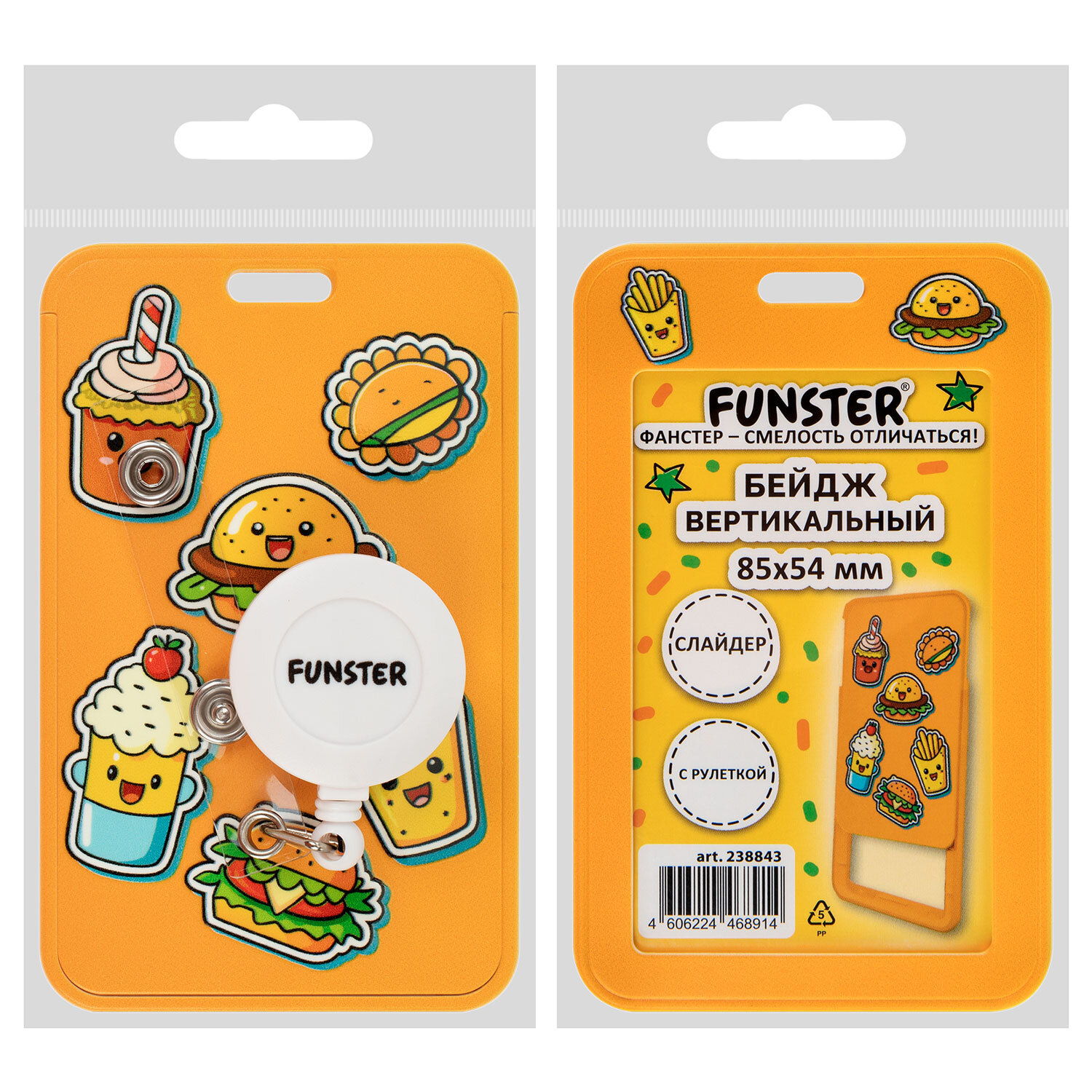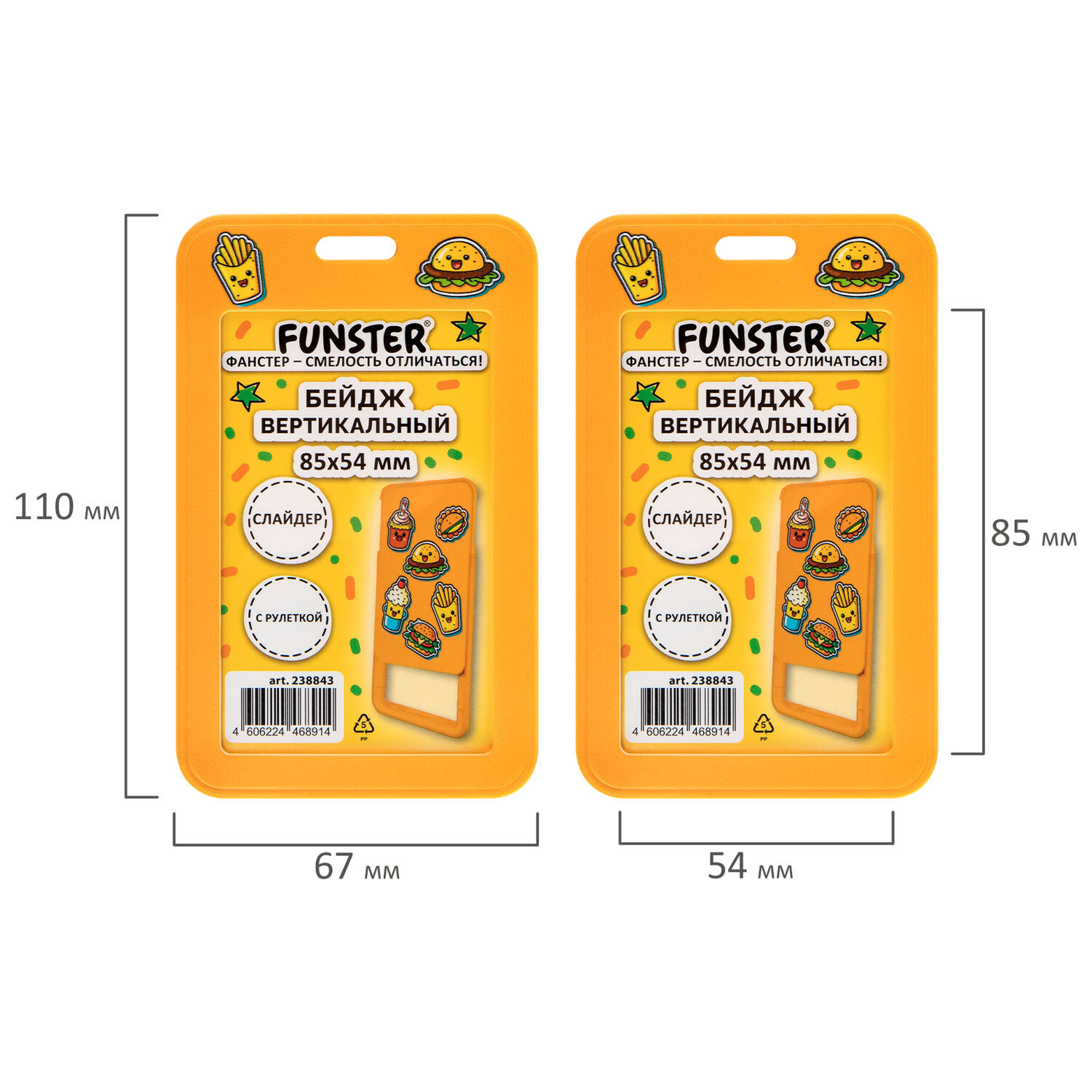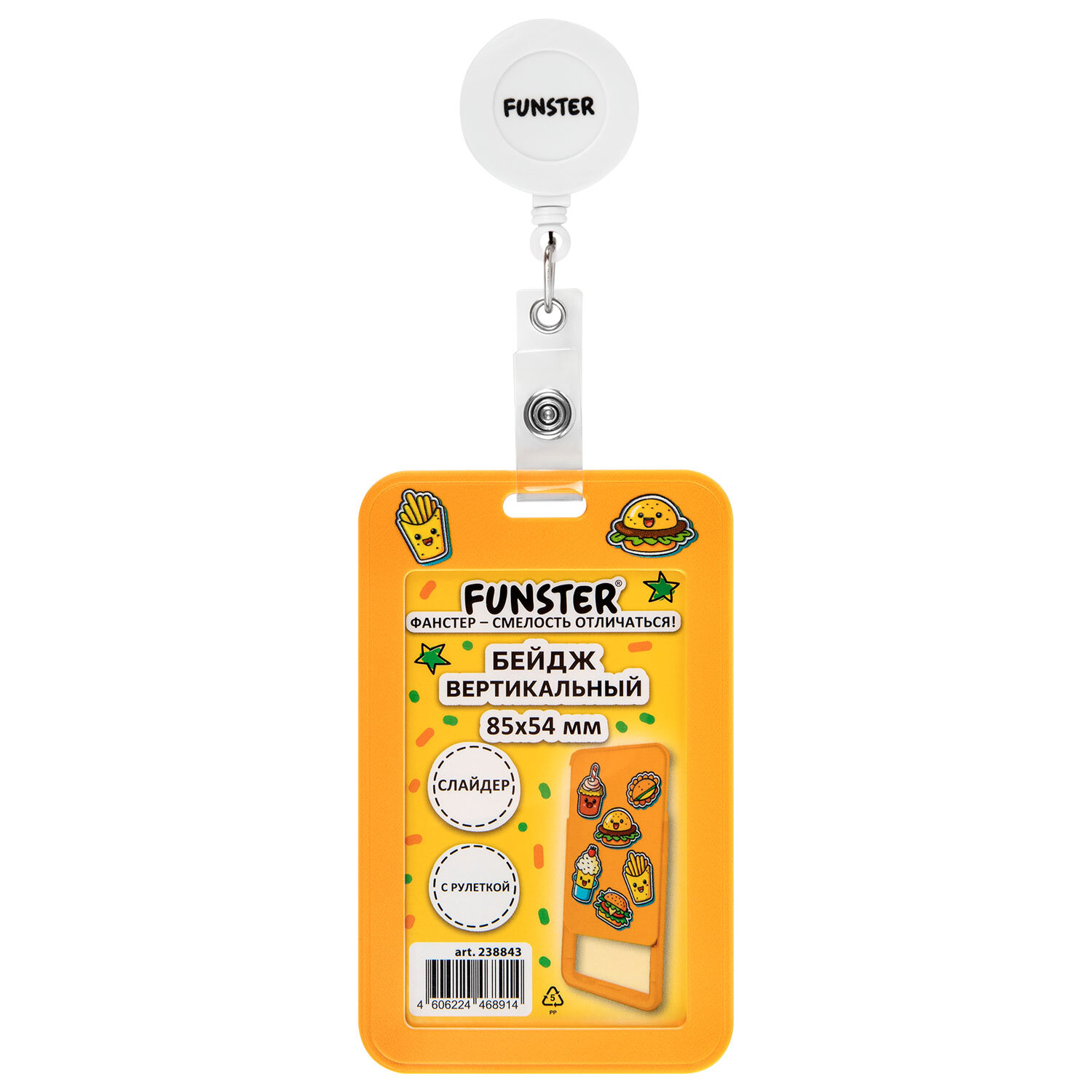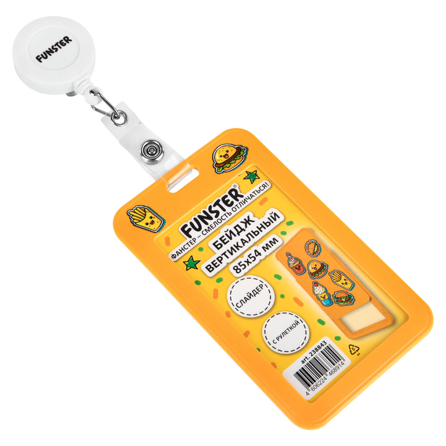 Бейдж вертикальный с 3D-печатью "Street food" (85х54 мм), с рулеткой, СЛАЙДЕР, FUNSTER (ФАНСТЕР) Код товара: 238843 152,94 ₽ Купить Производитель:FUNSTER Вертикальный бейдж с рулеткой FUNSTER для хранения тонких пропусков, карточек, ID-карт, проездных и банковских карт. Бейдж-слайдер с держателем-рулеткой 70 см. Изготовлен из жесткого пластика, гарантирующего долгий срок службы. Защищает от внешних воздействий Вашу карту. Идеально подойдёт для чувствительных к механическим повреждениям магнитных карт и пропусков. Держатель-рулетка оснащен клипсой, благодаря которой его можно с лёгкостью закрепить на поясе или любом другом элементе одежды. Максимальная толщина пропуска – 1 мм (одна стандартная банковская карта). Рисунок на бейдже нанесен с применением 3D-печати, что создает приятный тактильно опыт использования, а забавный дизайн поднимет Ваше настроение. Размер вкладыша – 85х54 мм.Производство: КитайТип бейджа: слайдерТип крепления: держатель с рулеткойПоложение: вертикальноеКоличество в комплекте: 1 шт.Размер вкладыша (ДхШ): 85х54 ммРазмер бейджа (ДхШ): 110х67 ммСерия: 3D PrintЦвет крепления: белыйМатериал корпуса: твердый пластикЦвет корпуса: оранжевыйДлина нити в держателе-рулетке: 70 смНаличие картонной вставки: даВес: 36 грРазмер упаковки: 1.8 × 11 × 7.3 смОбъём: 0.0002 м3Промежуточная упаковка: 10 штТранспортная упаковка: 240 штШтрих-код: 4606224468914 Файлы Сертификат-1.jpg Сертификат-2.jpg Сертификат-3.jpg Сертификат-4.jpg Сертификат-5.jpg Сертификат-6.jpg Сертификат-7.jpg Сертификат-8.jpg Сертификат-9.jpg Сертификат-10.jpg Сертификат-11.jpg Сертификат-12.jpg Сертификат-13.jpg Сертификат-14.jpg Сертификат-15.jpg Сертификат-16.jpg Сертификат-17.jpg Сертификат-18.jpg Сертификат-19.jpg Сертификат-20.jpg Сертификат-21.jpg Сертификат-22.jpg Сертификат-23.jpg Сертификат-24.jpg Сертификат-25.jpg Сертификат-26.jpg