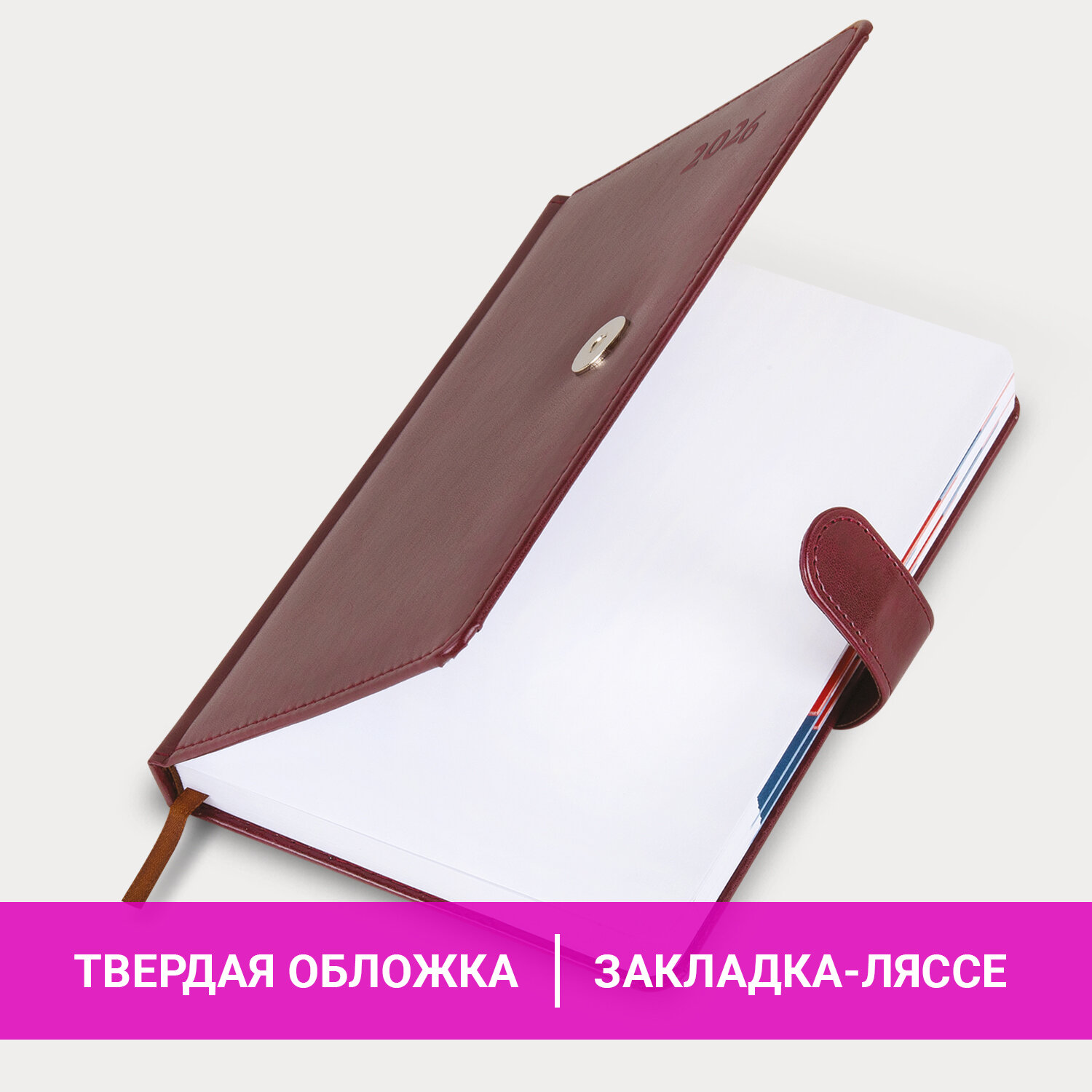Ежедневник датированный 2026 А5 148х218 мм, GALANT "Ritter", под кожу, бордовый Код товара: 117493 743,73 ₽ Купить Производитель:GALANT Датированный ежедневник серии "Ritter" от GALANT – надежный спутник делового человека. Внутренний блок включает 168 листов белой бумаги плотностью 70 г/м2. Каждая страничка имеет перфорированный угол. Благодаря стандартному формату А5 (148х218 мм) ежедневник удобно использовать как в офисе, так и на выездных деловых встречах. Твердая обложка бордового цвета прошита по периметру и стилизована под гладкую кожу. Обложка фиксируется магнитной застежкой, поэтому ежедневник не откроется в сумке или портфеле и страницы не помнутся. Материал обложки подходит для горячего тиснения. Дополнением является закладка-ляссе, с помощью которой при необходимости можно быстро открыть ежедневник на нужной странице, а также вырубка по месяцам. Ежедневник снабжен обширным справочным материалом. В конце есть 6 страниц для записей и заметок.Производство: КитайТип ежедневника: датированныйФормат: А5Обложка: под гладкую кожуВид обложки: твердаяКоличество листов: 168 шт.Особенности: вырубка блока, закладка-ляссе, перфорация уголков, поролоновая прослойка, прострочка по периметру, скругленные углы, справочная информацияСерия: RitterГод: 2026Тип застежки: магнитная застежкаОсновной цвет обложки: бордовыйДополнительный цвет обложки: нетЦвет среза: белыйЦвет внутреннего блока: белыйПлотность внутреннего блока: 70 г/м2Высота строки для записи: 4 ммТип крепления: сшивкаПечать блока: 2 краскиПодходит для блинтового тиснения: даПодходит для тиснения фольгой: даПодходит для заливки полимерной смолой: даПодходит для УФ-печати: даПодходит для тампопечати: даДлина: 218 ммШирина: 148 ммТолщина: 20 ммВес: 531 грРазмер упаковки: 3.1 × 21.6 × 15.6 смОбъём: 0.0013 м3Промежуточная упаковка: 15 штТранспортная упаковка: 15 штШтрих-код: 4606224489209 Файлы Сертификат-1.jpg Сертификат-2.jpg Сертификат-3.jpg Сертификат-4.jpg Сертификат-5.jpg Сертификат-6.jpg Сертификат-7.jpg Сертификат-8.jpg Сертификат-9.jpg Сертификат-10.jpg Сертификат-11.jpg Сертификат-12.jpg Сертификат-13.jpg Сертификат-14.jpg Сертификат-15.jpg Сертификат-16.jpg Сертификат-17.jpg Сертификат-18.jpg Сертификат-19.jpg Сертификат-20.jpg Сертификат-21.jpg Сертификат-22.jpg Сертификат-23.jpg Сертификат-24.jpg Сертификат-25.jpg Сертификат-26.jpg