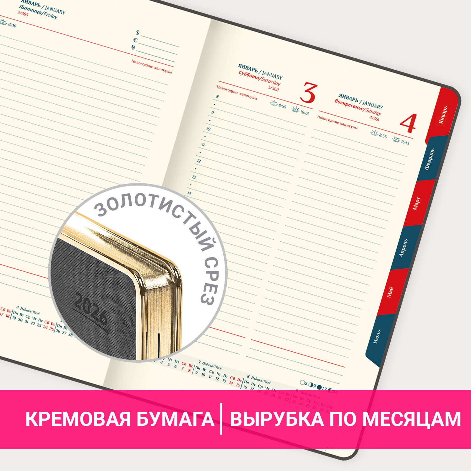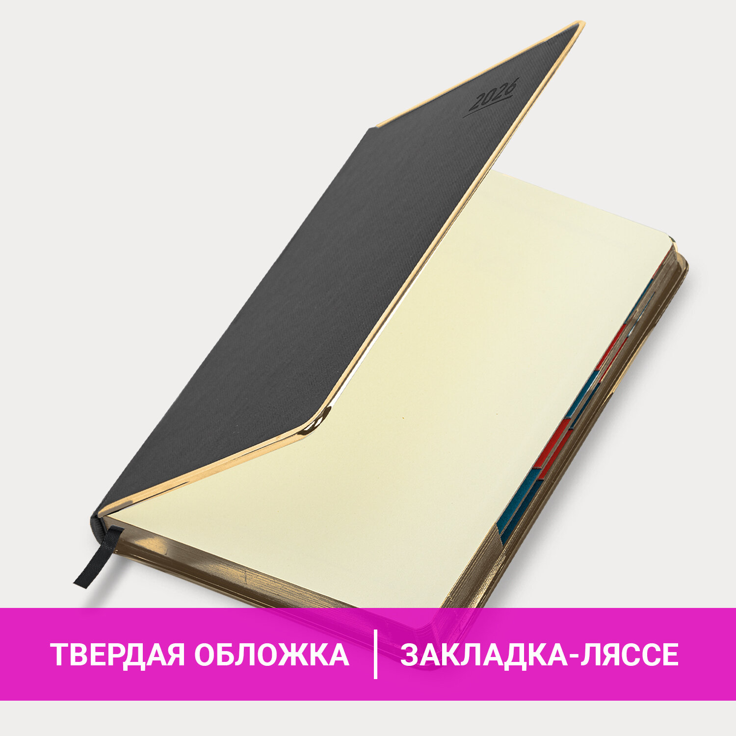 Ежедневник датированный 2026 А5 148х218 мм, GALANT "Infinity Gold", под кожу, серый Код товара: 117502 1 259,45 ₽ Купить Производитель:GALANT Датированный ежедневник серии "Infinity Gold" от GALANT – надежный спутник делового человека. Внутренний блок включает 168 листов тонированной бумаги цвета "слоновая кость" плотностью 70 г/м2. Каждая страничка имеет перфорированный угол. Благодаря стандартному формату А5 (148х218 мм) ежедневник удобно использовать как в офисе, так и на выездных деловых встречах. Твердая обложка серого цвета выполнена под кожу с отделкой из металлических накладок, что увеличивает ее износоустойчивость. Срез ежедневника покрыт золотой фольгой в цвет металлических накладок, и это придает ему особый шарм. Материал обложки подходит для горячего тиснения. Дополнением является закладка-ляссе, с помощью которой при необходимости можно быстро открыть ежедневник на нужной странице, а также вырубка по месяцам. Ежедневник снабжен обширным справочным материалом. В конце есть 6 страниц для записей и заметок.Производство: КитайТип ежедневника: датированныйФормат: А5Обложка: под кожуВид обложки: твердаяКоличество листов: 168 шт.Особенности: вырубка блока, закладка-ляссе, металлические углы, перфорация уголков, поролоновая прослойка, скругленные углы, справочная информацияСерия: Infinity GoldГод: 2026Тип застежки: нетОсновной цвет обложки: серыйДополнительный цвет обложки: нетЦвет среза: золотойЦвет внутреннего блока: кремовыйПлотность внутреннего блока: 70 г/м2Высота строки для записи: 4 ммТип крепления: сшивкаПечать блока: 2 краскиПодходит для блинтового тиснения: даПодходит для тиснения фольгой: даПодходит для заливки полимерной смолой: даДлина: 218 ммШирина: 148 ммТолщина: 20 ммВес: 505 грРазмер упаковки: 2.2 × 21.6 × 15 смОбъём: 0.001 м3Промежуточная упаковка: 15 штТранспортная упаковка: 15 штШтрих-код: 4606224489292 Файлы Сертификат-1.jpg Сертификат-2.jpg Сертификат-3.jpg Сертификат-4.jpg Сертификат-5.jpg Сертификат-6.jpg Сертификат-7.jpg Сертификат-8.jpg Сертификат-9.jpg Сертификат-10.jpg Сертификат-11.jpg Сертификат-12.jpg Сертификат-13.jpg Сертификат-14.jpg Сертификат-15.jpg Сертификат-16.jpg Сертификат-17.jpg Сертификат-18.jpg Сертификат-19.jpg Сертификат-20.jpg Сертификат-21.jpg Сертификат-22.jpg Сертификат-23.jpg Сертификат-24.jpg Сертификат-25.jpg Сертификат-26.jpg