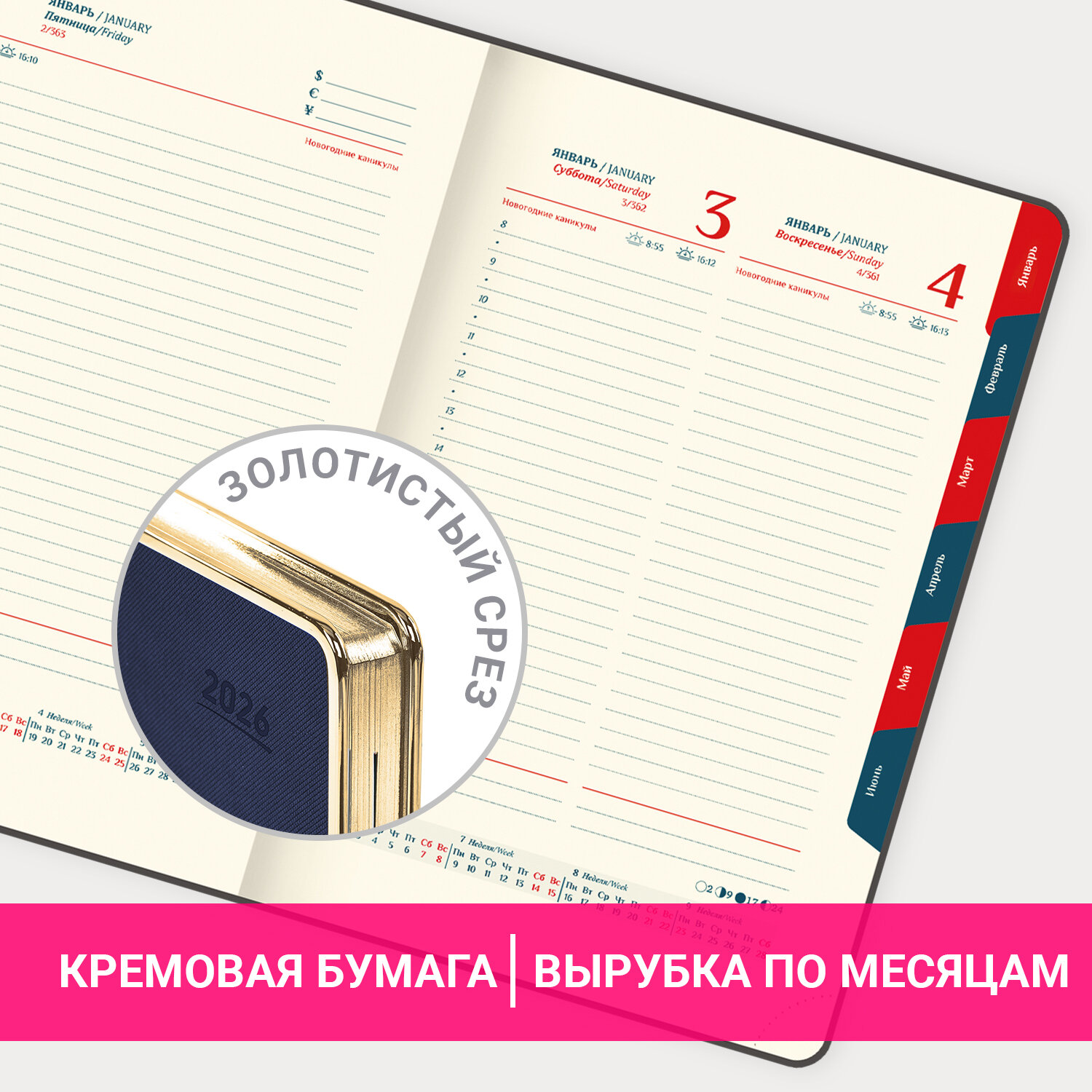 Ежедневник датированный 2026 А5 148х218 мм, GALANT "Infinity Gold", под кожу, темно-синий Код товара: 117503 1 259,45 ₽ Купить Производитель:GALANT Датированный ежедневник серии "Infinity Gold" от GALANT – надежный спутник делового человека. Внутренний блок включает 168 листов тонированной бумаги цвета "слоновая кость" плотностью 70 г/м2. Каждая страничка имеет перфорированный угол. Благодаря стандартному формату А5 (148х218 мм) ежедневник удобно использовать как в офисе, так и на выездных деловых встречах. Твердая обложка темно-синего цвета выполнена под кожу с отделкой из металлических накладок, что увеличивает ее износоустойчивость. Срез ежедневника покрыт золотой фольгой в цвет металлических накладок, и это придает ему особый шарм. Материал обложки подходит для горячего тиснения. Дополнением является закладка-ляссе, с помощью которой при необходимости можно быстро открыть ежедневник на нужной странице, а также вырубка по месяцам. Ежедневник снабжен обширным справочным материалом. В конце есть 6 страниц для записей и заметок.Производство: КитайТип ежедневника: датированныйФормат: А5Обложка: под кожуВид обложки: твердаяКоличество листов: 168 шт.Особенности: вырубка блока, закладка-ляссе, металлические углы, перфорация уголков, поролоновая прослойка, скругленные углы, справочная информацияСерия: Infinity GoldГод: 2026Тип застежки: нетОсновной цвет обложки: темно-синийДополнительный цвет обложки: нетЦвет среза: золотойЦвет внутреннего блока: кремовыйПлотность внутреннего блока: 70 г/м2Высота строки для записи: 4 ммТип крепления: сшивкаПечать блока: 2 краскиПодходит для блинтового тиснения: даПодходит для тиснения фольгой: даПодходит для заливки полимерной смолой: даДлина: 218 ммШирина: 148 ммТолщина: 20 ммВес: 506 грРазмер упаковки: 2.2 × 21.8 × 15.1 смОбъём: 0.001 м3Промежуточная упаковка: 15 штТранспортная упаковка: 15 штШтрих-код: 4606224489308 Файлы Сертификат-1.jpg Сертификат-2.jpg Сертификат-3.jpg Сертификат-4.jpg Сертификат-5.jpg Сертификат-6.jpg Сертификат-7.jpg Сертификат-8.jpg Сертификат-9.jpg Сертификат-10.jpg Сертификат-11.jpg Сертификат-12.jpg Сертификат-13.jpg Сертификат-14.jpg Сертификат-15.jpg Сертификат-16.jpg Сертификат-17.jpg Сертификат-18.jpg Сертификат-19.jpg Сертификат-20.jpg Сертификат-21.jpg Сертификат-22.jpg Сертификат-23.jpg Сертификат-24.jpg Сертификат-25.jpg Сертификат-26.jpg