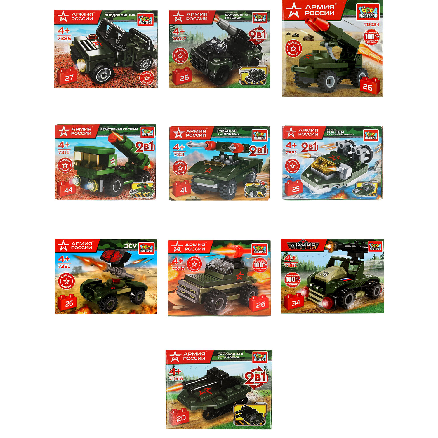 Конструктор пластиковый АРМИЯ РОССИИ, 20 - 29 деталей, ассорти, ГОРОД МАСТЕРОВ Код товара: 667465 167,5 ₽ Купить Производитель:ГОРОД МАСТЕРОВ Торговая марка «Город Мастеров» представляет развивающие конструкторы европейского качества, совместимые c конструкторами ведущих мировых производителей. Пластиковый конструктор серии «Армия России» - это идеальная детская игрушка для мальчиков, стремящихся к приключениям. Она является замечательным вариантом развивающих игр и отлично подходит для всех любителей сборных моделей. Эта игрушка совместима с моделями конструкторов мировых брендов, все детали легко и плотно соединяются между собой. Пластмассовый материал конструкции гарантирует долговечность и безопасность в использовании.Производство: КитайТип товара: конструктор пластиковыйСерия: Город МастеровМатериал: пластикУровень сложности сборки: начальныйРекомендуемый возраст: 4+Тип деталей: разные формыДетали совместимы с "LEGO": даСюжет: Военная техникаКоличество элементов: 20 шт.Количество моделей для сборки: 1Комплектация: инструкция по сборкеЦвет: ассортиУпаковка: картонная коробкаВес: 48 грРазмер упаковки: 4.8 × 9.2 × 6.8 смОбъём: 0.0009 м3Промежуточная упаковка: 10 штТранспортная упаковка: 10 штШтрих-код: 6934600007913