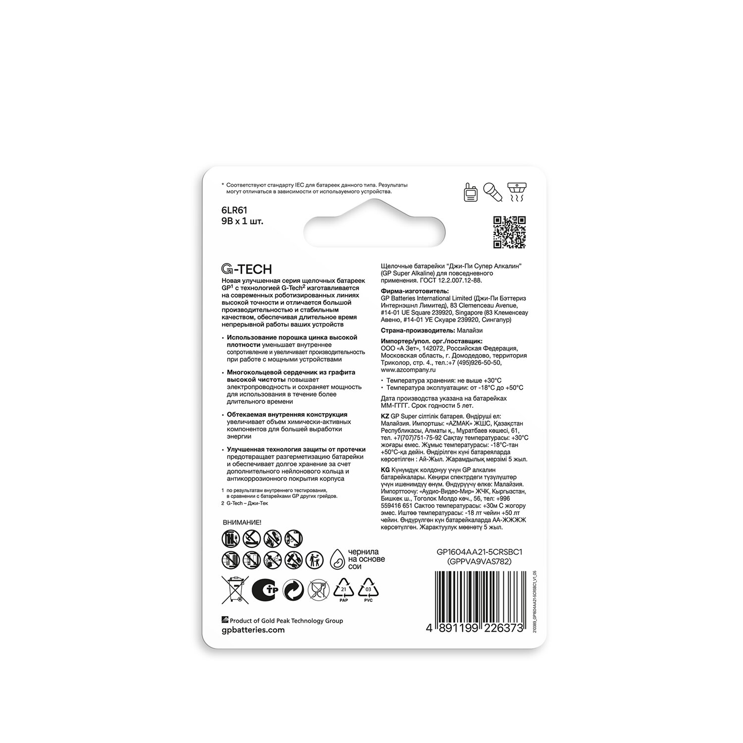 Батарейка 1 шт., GP Super G-Tech, Крона (6LR61, 6LF22, 1604A), алкалиновая, блистер, 1604A-5CR1 Код товара: 450625 359,27 ₽ Купить Производитель:GP Новейшая серия щелочных батареек GP Super разработана для долгой службы и качественной работы приборов с высоким потреблением энергии. Щелочные батарейки типа "Крона" отличаются улучшенными характеристиками для длительной и высокой нагрузки. Новая серия SUPER обладает большей емкостью и рассчитана на работу в радиотехническом оборудовании, профессиональных и бытовых устройствах с высоким потреблением энергии. Используется в медицинских приборах, дозиметрах, металлоискателях, весах, осветительных приборах, радиоуправляемых детских игрушках, автосигнализациях. Устройство батареек: общая информация. В конструкции элемента питания предусмотрено размещение 2 выводов на одной стенке корпуса, что не позволит вам перепутать полярность при установке источника питания. Номинальная емкость "Кроны" зависит от химического состава катода и анода. Щелочной элемент имеет емкость до 500 мАч, аналогичный максимальный показатель литий-ионных элементов – до 1000 мАч. Щелочные GP Super "Кроны" характеризуются: - большой емкостью; - широким диапазоном рабочих температур; - меньшей вероятностью протечки; - длительным сроком хранения без потери качества; - оптимальным соотношением цены и качества. Типоразмер – "крона". Обозначение "Крона" связано не с внешним видом батареек, а со стилизованным изображением кроны дерева на упаковках, которые появились еще в 50 годы прошлого века. Звучное название закрепилось и употребляется в настоящее время. Международные обозначения этого типоразмера – 6F22 (6LR61). Типичные размеры элементов питания Крона, мм: 48,5 х 26,5 х 17,5 Масса обычно составляет 53 г. Серия – GP SUPER Новую серию GP SUPER отличает повышенная энергоёмкость и длительный равномерный расход энергии. Напряжение – 9 В. Этот элемент питания отличается достаточно высокой производительностью, на выходе имеет напряжение в районе 9 В, что позволяет работать приборам со средним и высоким энергопотреблением до 5 часов. Высокая выносливость: работа при экстремальных температурах. Рабочий температурный диапазон элементов питания типа "Крона" очень широк. Батарейки серии GP Super выдерживают диапазон температур – от -20 до +60°С без потери качества. Хранение: 10+. Батарейка Крона серии GP Super имеет длительный срок хранения, до 10 лет и более при низкой скорости саморазряда. Оптимальная температура хранения от +15 до +25°C. Экономия: Большая Емкость и длительный срок службы делают этот тип батареек весьма выгодным для покупки. Абсолютная безопасность. Щелочные батарейки GP SUPER "Крона" совершенно безопасны. Не содержат ртути и кадмия, не протекают. При правильном использовании не наносят вреда окружающей среде. Во избежание короткого замыкания не погружайте батарейки в воду и держите отдельно от других металлических предметов. Упаковка – блистер. Прозрачный стильный блистер, принимающий форму самого продукта, исключает попадания внутрь пыли и влаги, защищает корпус от деформации. Вся информация на сайте о товарах носит справочный характер и не является публичной офертой в соответствии с пунктом 2 статьи 437 ГК РФ. Производитель оставляет за собой право изменять характеристики товара, его внешний вид и комплектность без предварительного уведомления продавца.Производство: М