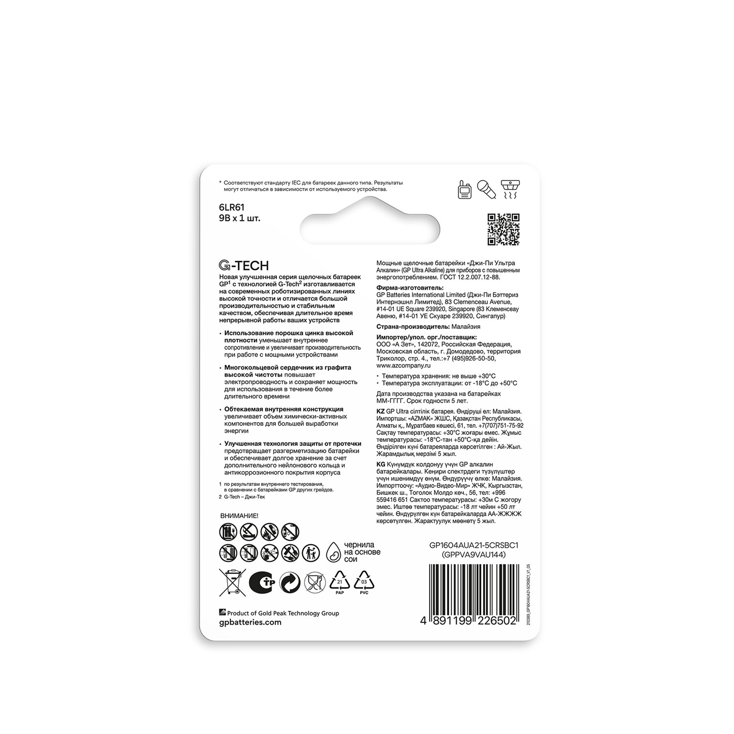 Батарейка 1 шт., GP Ultra G-Tech, Крона (6LR61, 6LF22, 1604A), алкалиновая, блистер Код товара: 454093 581,06 ₽ Купить Производитель:GP Алкалиновая батарейка GP размера Крона увеличенной продолжительности работы идеально подходит для приборов с высоким потреблением энергии: механизированные игрушки, фонарики, портативные игровые консоли, пульты дистанционного управления. Батарейки GP – это надежные элементы питания, которые обеспечивают стабильную работу устройств. В процессе изготовления использовались качественные материалы и тщательно соблюдались стандарты безопасности; они оптимально подходит для бытового применения. Неиспользованные батарейки GP могут сохранять заряд до 7 лет при хранении в обычных условиях. С этими батарейками можете полностью положиться на свое устройство. Поставляется комплектом из 1 штуки в блистере. Вся информация о товарах на сайте носит справочный характер и не является публичной офертой в соответствии с пунктом 2 статьи 437 ГК РФ. Производитель оставляет за собой право изменять характеристики товара, его внешний вид и комплектность без предварительного уведомления продавца.Производство: КитайФорма батарейки: крона 9VСерия: UltraТипоразмер: 9V (6LR61, 6F22, 1604A, 1604D)Технология: алкалиноваяНапряжение: 9 ВКоличество в упаковке: 1 шт.Упаковка: блистерСрок годности: 84 месВес: 57 грРазмер упаковки: 1.8 × 11.8 × 8.3 смОбъём: 0.0001 м3Промежуточная упаковка: 10 штТранспортная упаковка: 200 штШтрих-код: 4891199226502 Файлы Сертификат-1.jpg Сертификат-2.jpg Сертификат-3.jpg Сертификат-4.jpg