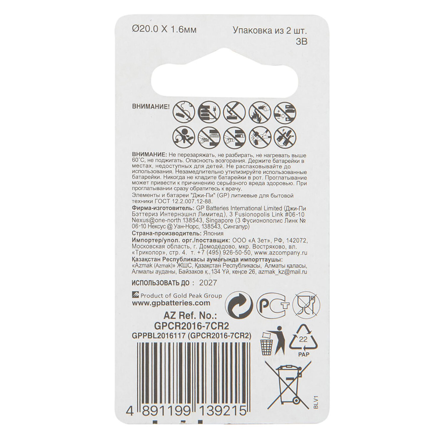 Батарейки литиевые GP Lithium CR2016 "таблетки, дисковые, кнопочные" КОМПЛЕКТ 2 шт., блистер Код товара: 456690 335,92 ₽ Купить Производитель:GP Литиевые батарейки GP размера CR2016 предоставляют высокий выходной уровень, что делает их идеально подходящими для часов, фотографического оборудования, калькуляторов, компьютерного оборудования. Батарейки GP – это надежные элементы питания, которые обеспечивают стабильную работу устройств. Утонченная технология GP обеспечивает длительный срок хранения (10 лет) и дарит непревзойдённое качество работы даже при экстремальных температурных условиях, при этом они на 40% легче обычных батареек. С этими батарейками можете полностью положиться на свое устройство.Производство: КитайФорма батарейки: дисковые «монетки»Серия: LithiumТипоразмер: CR2016Технология: литиеваяНапряжение: 3 ВКоличество в упаковке: 2 шт.Упаковка: блистерСрок годности: 120 месВес: 11 грРазмер упаковки: 0.5 × 11.7 × 8.1 смОбъём: 0.0001 м3Промежуточная упаковка: 10 штТранспортная упаковка: 600 штШтрих-код: 4891199139215 Файлы Сертификат-1.jpg Сертификат-2.jpg Сертификат-3.jpg Сертификат-4.jpg