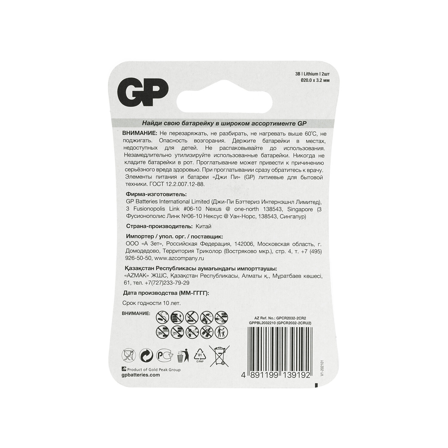 Батарейки литиевые GP Lithium CR2032 "таблетки, дисковые, кнопочные" КОМПЛЕКТ 2 шт., блистер Код товара: 456692 298,4 ₽ Купить Производитель:GP Литиевые батарейки GP размера CR2032 предоставляют высокий выходной уровень, что делает их идеально подходящими для весов, фотографического оборудования, калькуляторов, компьютерного оборудования. Батарейка GP Lithium CR2032-2CRU2 имеет компактную плоскую «дисковую» форму, которую удобно брать с собой в путешествия и командировки. Учитывая характеризующие ее существенную продолжительность службы, способность практически не растрачивать заряд при хранении и исправно работать при большом разбросе температур, можно сказать, что это отличный попутчик в дороге, который может выручить в самой неожиданной ситуации. Батарея GP Lithium CR2032 в количестве 2 шт. представлена в удобной упаковке в виде блистера, защищающего от негативного воздействия влаги и физических повреждений. Литиевая батарейка GP Lithium CR2032 соответствует международным стандартам санитарной гигиены и экологии. Состав исключает ртуть и при соблюдении условий использования абсолютно безопасен для здоровья человека и окружающей природы.Производство: КитайФорма батарейки: дисковые «монетки»Серия: LithiumТипоразмер: CR2032Технология: литиеваяНапряжение: 3 ВКоличество в упаковке: 2 шт.Упаковка: блистерСрок годности: 120 месВес: 13 грРазмер упаковки: 0.4 × 11.7 × 8.2 смОбъём: 0.0001 м3Промежуточная упаковка: 10 штТранспортная упаковка: 600 штШтрих-код: 4891199139192 Файлы Сертификат-1.jpg Сертификат-2.jpg Сертификат-3.jpg Сертификат-4.jpg
