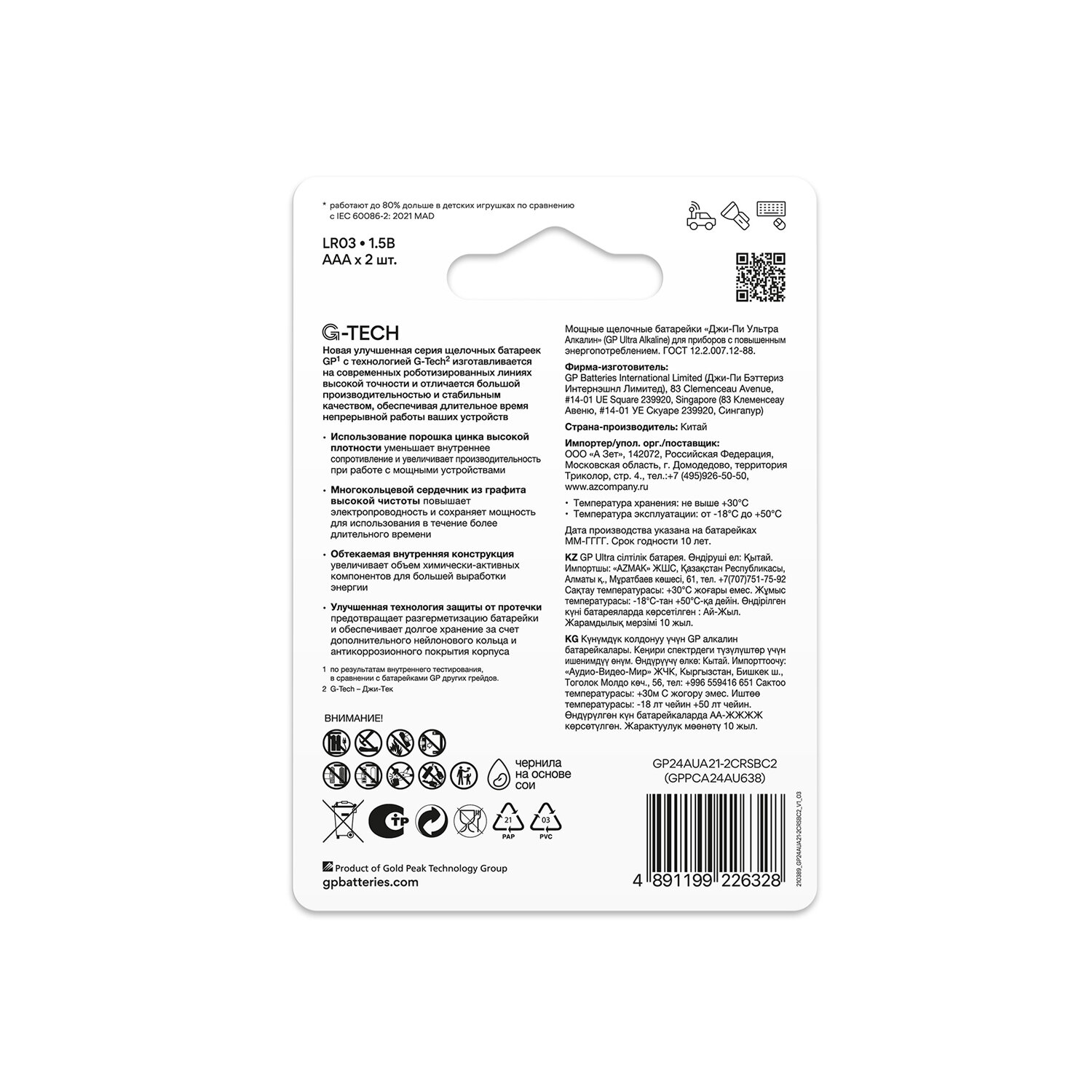 Батарейки КОМПЛЕКТ 2 шт., GP Ultra G-Tech, AAA (LR03, 24А), алкалиновые, мизинчиковые Код товара: 457747 228,54 ₽ Купить Производитель:GP Батарейки GP Ultra идеально подходят для широкого спектра портативных устройств. Рекомендации по безопасному использованию: • Соблюдайте полярность при установке элементов питания в устройство. • Не рекомендуется одновременно устанавливать в устройство батарейки разных химических систем и производителей, а также новые и уже использованные элементы питания. • Батарейки не предназначены для перезарядки. Это одноразовые батарейки, их нельзя устанавливать в зарядные устройства. • Алкалиновые батарейки запрещено деформировать, разбирать или бросать в огонь. Не давайте батарейки детям – это подвергает опасности их здоровье. • Храните элементы питания в сухом прохладном месте, а по окончании срока годности сдайте их в специальные контейнеры для последующей переработки. Вся информация на сайте о товарах носит справочный характер и не является публичной офертой в соответствии с пунктом 2 статьи 437 ГК РФ. Производитель оставляет за собой право изменять характеристики товара, его внешний вид и комплектность без предварительного уведомления продавца.Производство: КитайФорма батарейки: AAA (мизинчиковые)Серия: UltraТипоразмер: AAA (мизинчиковая, R03, LR03, 286, 24A, 24D)Технология: алкалиноваяНапряжение: 1.5 ВКоличество в упаковке: 2 шт.Упаковка: блистерСрок годности: 120 месВес: 35 грРазмер упаковки: 1.1 × 11.9 × 8.2 смОбъём: 0.0001 м3Промежуточная упаковка: 10 штТранспортная упаковка: 80 штШтрих-код: 4891199226328 Сертификат-1.jpg Сертификат-2.jpg Сертификат-3.jpg