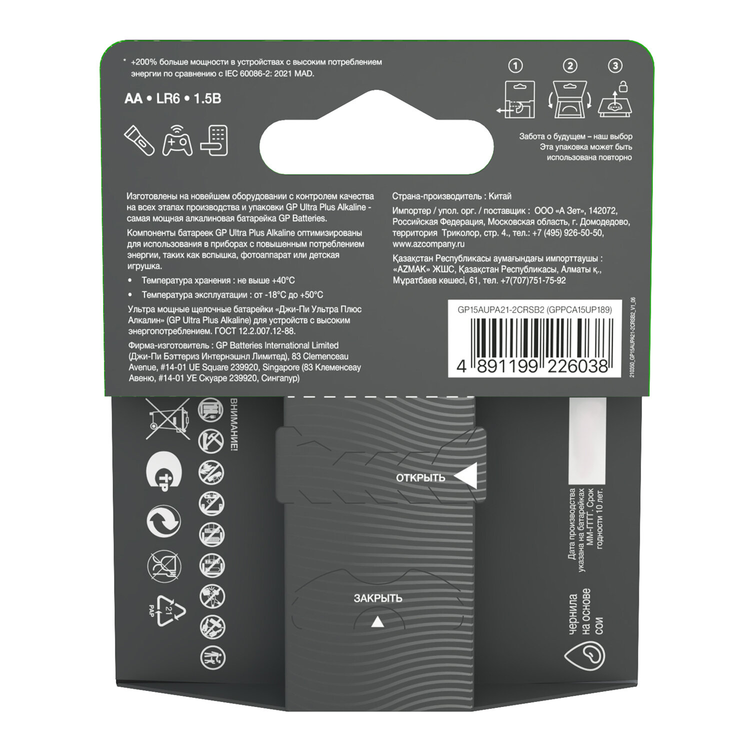 Батарейки КОМПЛЕКТ 2 шт., GP Ultra Plus G-Tech, AA (LR6), алкалиновые, пальчиковые Код товара: 457751 207,15 ₽ Купить Производитель:GP Новая серия GP Ultra Plus Alkaline подарит вам еще больше энергии и больше приятных моментов от общения с близкими. G-TECH – инновации, лежащие в основе новой линейки • Новая улучшенная серия щелочных батареек GP с технологией G-Tech отличается высочайшей производительностью и стабильным качеством, обеспечивает длительное время непрерывной работы ваших устройств. • Запатентованная технология защиты от протечки: дополнительное нейлоновое кольцо и антикоррозионное покрытие корпуса предотвращает разгерметизацию батарейки и обеспечивает долгое хранение. • Благодаря использованию порошка Zinc S высокой плотности увеличена производительность при работе с мощными устройствами. • Многокольцевой сердечник из графита высокой чистоты повышает электропроводность и сохраняет мощность для использования в течение более длительного времени. • Батарейки GP G-Tech изготавливаются на роботизированных производственных линиях высокой точности. Каждая батарейка производится с соблюдением всех международных требований к качеству. Рекомендации по безопасному использованию: • Соблюдайте полярность при установке элементов питания в устройство. • Не рекомендуется одновременно устанавливать в устройство батарейки разных химических систем и производителей, а также новые и уже использованные элементы питания. • Батарейки не предназначены для перезарядки. Это одноразовые батарейки, их нельзя устанавливать в зарядные устройства. • Алкалиновые батарейки запрещено деформировать, разбирать или бросать в огонь. Не давайте батарейки детям. Это подвергает опасности их здоровье. • Храните элементы питания в сухом прохладном месте, а по окончании срока годности сдайте их в специальные контейнеры для последующей переработки. Вся информация на сайте о товарах носит справочный характер и не является публичной офертой в соответствии с пунктом 2 статьи 437 ГК РФ. Производитель оставляет за собой право изменять характеристики товара, его внешний вид и комплектность без предварительного уведомления продавца.Производство: КитайФорма батарейки: AA (пальчиковые)Серия: Ultra PlusТипоразмер: AA (пальчиковая, R6, LR6, 316, 15A, 15D)Технология: алкалиноваяНапряжение: 1.5 ВКоличество в упаковке: 2 шт.Упаковка: блистерСрок годности: 120 месВес: 61 грРазмер упаковки: 1.6 × 10.6 × 8 смОбъём: 0.0001 м3Промежуточная упаковка: 10 штТранспортная упаковка: 80 штШтрих-код: 4891199226038 Сертификат-1.jpg Сертификат-2.jpg Сертификат-3.jpg