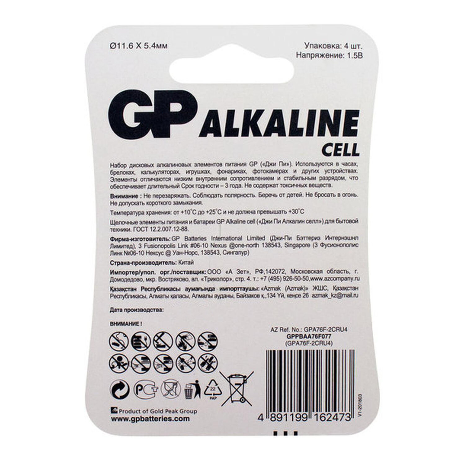 Батарейки КОМПЛЕКТ 4 шт., GP Alkaline, A76 (G13, LR44), алкалиновая, блистер, A76-С10 Код товара: 457765 289,27 ₽ Купить Производитель:GP Компактные дисковые батарейки GP Alkaline используются в качестве источников питания для наручных часов, детских игрушек с экраном, микрокалькуляторов, слуховых аппаратов. Высокая емкость при медленной энергоотдаче делает элементы питания данного типа подходящими для многолетнего использования в высокоточных приборах. Благодаря низкотемпературным свойствам элементы питания способны стабильно работать как в домашних помещениях, так и на открытом воздухе. Технология низкого саморазряда позволяет хранить батарейки GP долгое время без использования. Магнитно-цинковое соединение в качестве щелочного электролита является экологически безопасным для эксплуатации людьми. По окончанию срока службы данные элементы питания утилизируются и могут быть переработаны без вреда окружающей среде. Элементы питания рекомендуется беречь от детей в процессе эксплуатации и хранения. Батареи GP сертифицированы согласно требованиям российского стандарта ГОСТ 12.2.007.12-88 и международной системе контроля качества по стандартам ISO9001 и ISO14001. Вся информация на сайте о товарах носит справочный характер и не является публичной офертой в соответствии с пунктом 2 статьи 437 ГК РФ. Производитель оставляет за собой право изменять характеристики товара, его внешний вид и комплектность без предварительного уведомления продавца.Производство: КитайФорма батарейки: дисковые «таблетки»Серия: AlkalineТипоразмер: A76 (G13, LR44, LR1154, 1166A)Технология: алкалиноваяНапряжение: 1.5 ВКоличество в упаковке: 4 шт.Упаковка: блистерСрок годности: 36 месВес: 14 грРазмер упаковки: 0.7 × 12 × 8.1 смОбъём: 0.0001 м3Промежуточная упаковка: 10 штТранспортная упаковка: 480 штШтрих-код: 4891199162473 Сертификат-1.jpg Сертификат-2.jpg Сертификат-3.jpg
