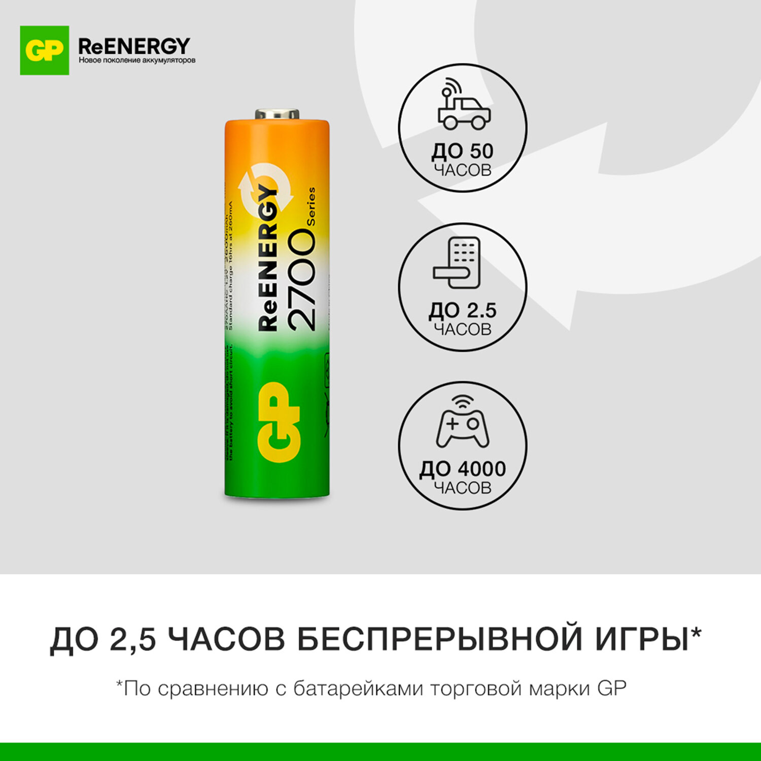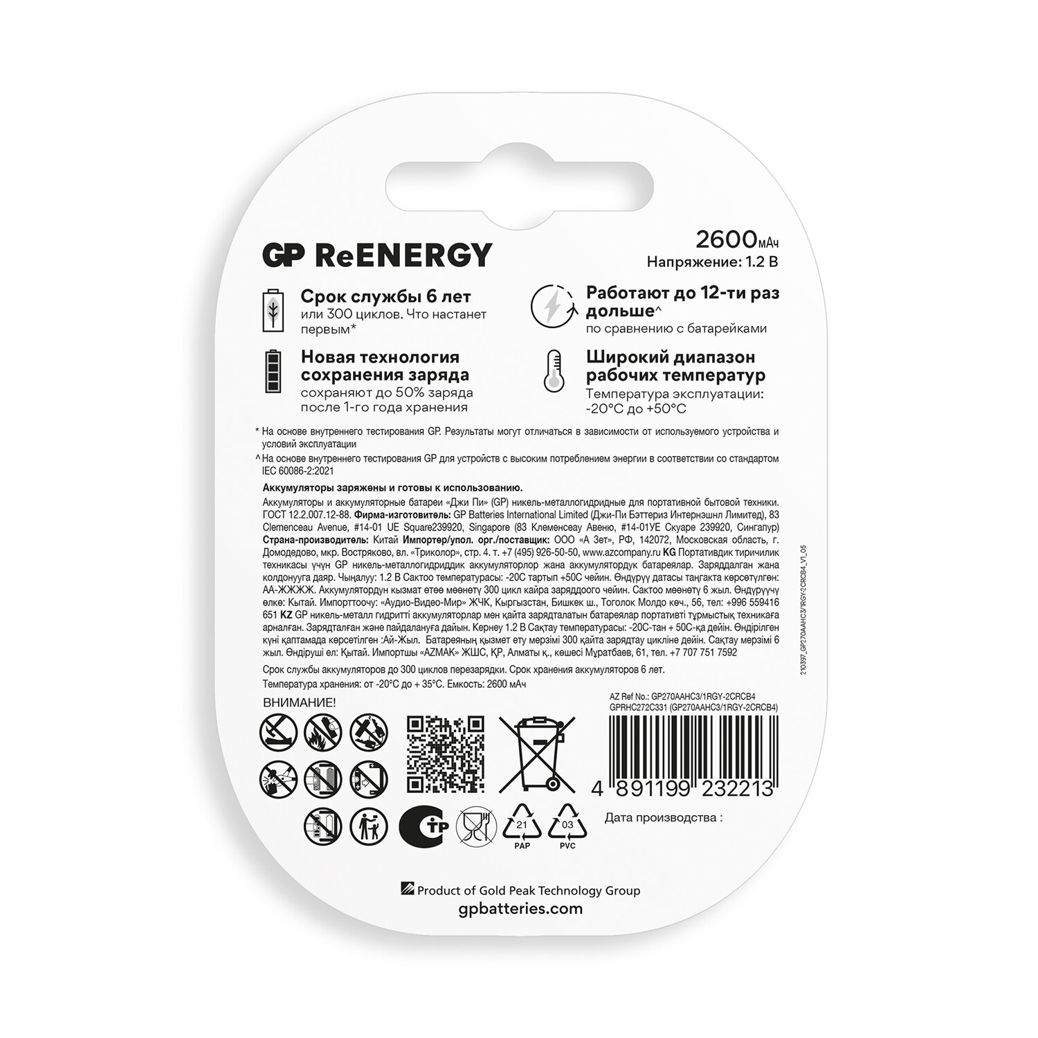 Батарейки аккумуляторные GP ReEnergy Ni-Mh КОМПЛЕКТ 4 шт. (ПРОМО 3+1), АА (HR6), 2600 mAh, 270AAHC3/1RGY Код товара: 458464 1 840,13 ₽ Купить Производитель:GP Новая серия аккумуляторных батареек GP ReEnergy разработана для долгой службы и качественной работы приборов с высоким потреблением энергии. Аккумуляторные батарейки GP отличаются улучшенными характеристиками для длительной и высокой нагрузки. Никель-металлогидридные аккумуляторы GP отличаются долгим сроком службы, стабильной работой в широком температурном диапазоне и способны выдерживать до 300 циклов зарядки. Они подходят для различных энергоемких портативных устройств, таких как игровые консоли, фонарики, MP3-плееры, пульты дистанционного управления, часы, компьютерные мыши и клавиатуры, фотоаппараты и другие гаджеты. Емкость 2600 мАч обеспечивает долгую и стабильную работу устройств, поддерживая рабочее напряжение до полной разрядки. Отсутствие эффекта памяти позволяет заряжать аккумуляторы в любое время без необходимости полной разрядки, сохраняя их номинальную емкость. Комплект GP 270AAHC31RGY-2CRCB4 в блистерной упаковке – это выгодное предложение: четыре аккумулятора по цене трех, что позволяет дополнительно сэкономить. Аккумуляторы не содержат кадмия, свинца и ртути, что делает их безопасными для использования и окружающей среды. При зарядке рекомендуется устанавливать аккумуляторы парами или по четыре штуки, чтобы их работа была синхронизирована. Соблюдайте полярность при установке в устройства. Не разбирайте, не подвергайте ударам, не перепаивайте, не нагревайте и не держите рядом с открытым огнем. Использованные аккумуляторы следует утилизировать в специальные контейнеры для безопасной переработки. Характеристики: - Типоразмер: АА. - Тип аккумулятора: NiMH. - Размеры: 50,5 x14,5 мм. - Температурный диапазон: от -20 до +50 °C. - Емкость: 2600 мAч. - Номинальное напряжение: 1,2 В. - Количество в комплекте: 4 шт.Производство: КитайТипоразмер: AA (HR6, пальчиковые)Емкость: 2600 мАчНапряжение: 1.2 ВЗаряженные: даРесурс перезарядки: 300 цикловКоличество в упаковке: ПРОМО 3+1 шт.Технология: Ni-MhУпаковка: блистерСрок годности: 120 месВес: 141 грРазмер упаковки: 2.2 × 11.7 × 8.2 смОбъём: 0.0003 м3Промежуточная упаковка: 8 штТранспортная упаковка: 80 штШтрих-код: 4891199232213 Файлы Сертификат-1.jpg Сертификат-2.jpg Сертификат-3.jpg Сертификат-4.jpg