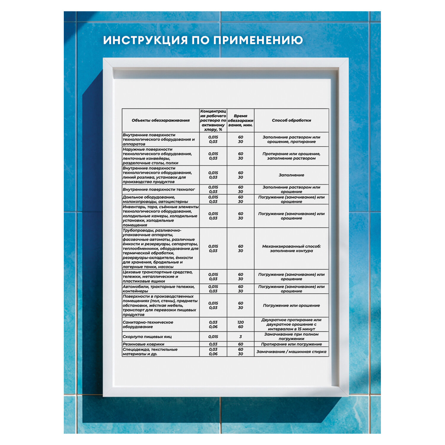 Состав: натриевая соль дихлоризоциануровой кислоты, ПАВ и функциональные добавки. Массовая доля активного хлора не менее 45%. Масса активного хлора в одной таблетке 1,5 г.