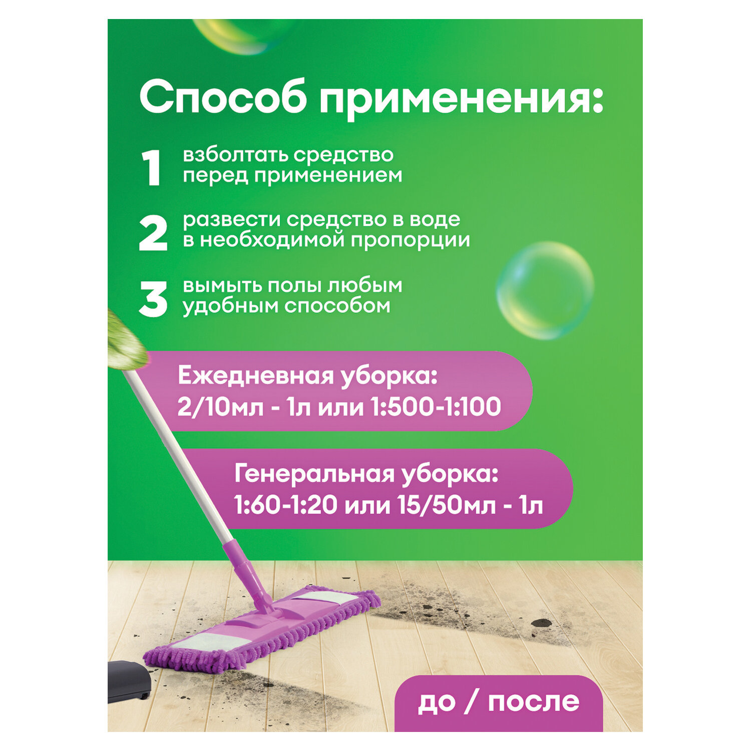 1. Ежедневная уборка: концентрат разбавляется в соотношении 1:500 – 1:100 или 2-10 мл на 1 литр воды.